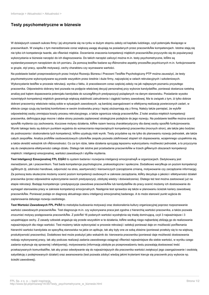 Informacje > Aktualności > Aktualności > Testy psychometryczne w biznesie W dzisiejszych czasach sukces firmy i jej utrzymanie się na rynku w dużym stopniu zależy od kapitału ludzkiego, czyli potencjału tkwiącego w pracownikach. W związku z tym menedżerowie coraz większą uwagę skupiają na posiadanych przez pracownikĂłw kompetencjach. Istotne stają się nie tylko ich kompetencje twarde, ale rĂłwnież miękkie. Docenienie znaczenia kompetencji miękkich pracownikĂłw przyczyniło się do popularyzacji wykorzystania w biznesie narzędzi do ich diagnozowania. Do takich narzędzi zaliczyć można m.in. testy psychometryczne, ktĂłre są wystandaryzowanym narzędziem do ich pomiaru. Za pomocą testĂłw badane są rĂłżnorodne aspekty procesĂłw psychicznych m.in. funkcjonowanie w grupie, styl pracy, sposĂłb motywacji, cechy charakteru czy wyznawane wartości. Na podstawie badań przeprowadzonych przez Instytut Rozwoju Biznesu i Pracowni TestĂłw Psychologiczny PTP można zauważyć, że testy psychometryczne wykorzystywane są przede wszystkim przez średnie i duże firmy, najczęściej w celach rekrutacyjnych i szkoleniowych. Wykorzystanie testĂłw w procesie rekrutacji, wynika z faktu, iż pracodawcom coraz częściej zależy na jak najlepszym poznaniu przyszłego pracownika. Odpowiednio dobrany test pozwala na podjęcie właściwej decyzji personalnej przy wyborze kandydatĂłw, ponieważ dostarcza rzetelną analizę pod kątem dopasowania potencjału kandydata do szczegĂłlnych predyspozycji pożądanych na danym stanowisku. Posiadanie wysoko rozwiniętych kompetencji miękkich gwarantuje większą stabilność zatrudnienia i ciągłość kariery zawodowej. Ma to związek z tym, iż tylko dobrze dobrani pracownicy właściwie radzą sobie w sytuacjach zawodowych, są bardziej zaangażowani w efektywną realizację powierzonych zadań, w efekcie czego czują się bardziej komfortowo w swoim środowisku pracy i lepiej utożsamiają się z firmą. Należy także pamiętać, że wybĂłr odpowiedniej osoby zmniejsza koszty procesu rekrutacyjnego, a także ogranicza rotację pracownikĂłw. Z kolei analiza miękkich kompetencji pracownika, definiująca jego mocne i słabe strony pozwala zaplanować strategiczne podejście do jego rozwoju. Na podstawie testĂłw można ocenić sposĂłb myślenia czy zachowania, kluczowe motywy działania, ktĂłre razem tworzą charakterystyczny dla danej osoby sposĂłb funkcjonowania. Wyniki takiego testu są dobrym punktem wyjaśnia do wzmacniania nieprzeciętnych kompetencji pracownika (mocnych stron), ale także jako bodziec do podnoszenia i doskonalenia tych kompetencji, ktĂłre uzyskują niski wynik. Testy przydatne są nie tylko do planowaniu rozwoju jednostek, ale także całych zespołĂłw. Analiza profilĂłw osobowościowych członkĂłw zespołu pozwala zdefiniować stopień ich dopasowania, wzajemnego uzupełninia się, a także określić wskaźnik ich rĂłżnorodności. Co za tym idzie, takie działania sprzyjają lepszemu wykorzystaniu możliwości jednostek, a to przyczynia się do zwiększenia efektywności całego działu. Dlatego tak istotne jest przebadanie pracownikĂłw w trzech głĂłwnych obszarach kompetencji miękkich: inteligencji emocjonalnej, wartości zawodowych i stylĂłw myślenia. Test Inteligencji Emocjonalnej FPL EQ® to system badania i rozwijania inteligencji emocjonalnej w organizacjach. Dedykowany jest menedżerom, jak i pracownikom. Test bada kompetencje psychologiczne, prakseologiczne i społeczne. Dodatkowo weryfikuje on poziom kompetencji ogĂłlnych (tj. zdolności handlowe, odporność na stres, asertywność) i kierowniczych (zarządzanie zmianą, motywowanie czy zarządzanie informacją). Za pomocą testu skutecznie możemy ocenić poziom kompetencji osobowych w zakresie zarządzania, ktĂłry decyduje o jakości i efektywności działań pracownika (przez odpowiednie wykorzystanie swoich predyspozycji, zdobytej wiedzy i doświadczenia). Dlatego też test można zastosować już na etapie rekrutacji. Badając kompetencje i predyspozycje zawodowe pracownikĂłw lub kandydatĂłw do pracy ocenić możemy ich dostosowanie do wymagań stanowiska pracy w zakresie kompetencji emocjonalnych. Następnie test sprawdza się także w planowaniu ścieżek kariery zawodowej pracownikĂłw. Ponieważ podaje on diagnozę aktualnego stanu inteligencji emocjonalnej badanego. A to może stanowić punkt wyjścia do zaplanowania dalszego rozwoju osobistego. Test Wartości Zawodowych FPL PV® to metodyka budowania motywacji oraz doskonalenia kultury organizacyjnej poprzez rozpoznawanie wartości zawodowych pracownikĂłw. Test diagnozuje m.in. czy wykonywana praca jest zgodna z hierarchią wartości pracownika, a także pozwala zrozumieć motywy postępowania pracownikĂłw. Z pośrĂłd 16 podanych wartości wyodrębnia się triadę dominującą, czyli 3 najważniejsze i 3 uzupełniające cechy. Z zasady człowiek angażuje się przede wszystkim w te działania, ktĂłre według niego najbardziej zbliżają go do realizowania najważniejszych dla niego wartości. Test możemy także wykorzystać w procesie rekrutacji i selekcji ponieważ daje on możliwość porĂłwnania hierarchii wartości kandydata ze specyfiką stanowiska na jakie on aplikuje, tak aby były one ze sobą zbieżne (ponieważ przełoży się to na większą produktywność pracownika). Dodatkowo test może posłużyć jako wskaźnik do: kierowania pracownika (ponieważ daje możliwość dostosowania rodzaju wykonywanej pracy, tak aby podczas realizacji zadania zawodowego osiągnąć rĂłwnież najważniejsze dla siebie wartości, w wyniku czego zadania wykonuje się sprawniej i efektywniej), motywowania (informację zdobyte po przeprowadzeniu testu pozwalają dostosować treść przekazywanych komunikatĂłw, tak aby przez odwoływanie się do najważniejszych dla pracownika wartości zwiększyć jego zaangażowanie i osobistą