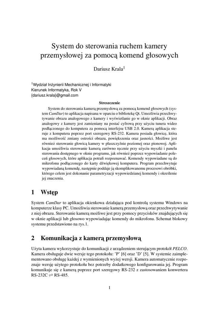 System do sterowania kamera˛ przemysłowa˛ za pomoca˛ komend głosowych (system CamDar) to aplikacja napisana w oparciu o bibliotek˛e Qt. Umożliwia przechwytywanie obrazu analogowego z kamery i wyświetlanie go w oknie aplikacji. Obraz