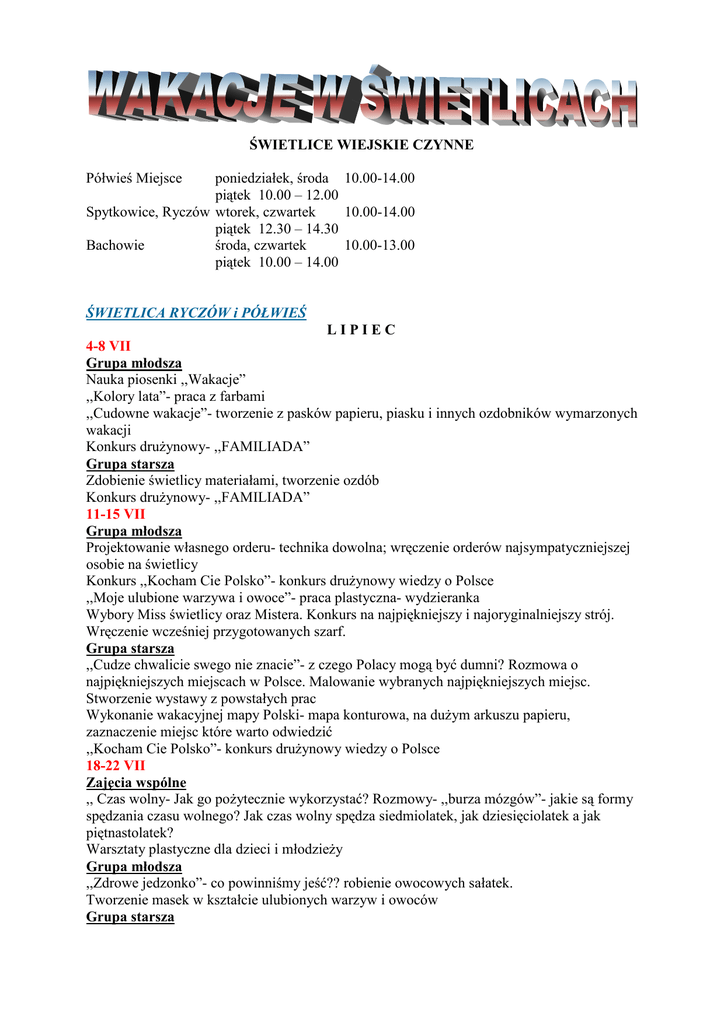 ŚWIETLICE WIEJSKIE CZYNNE Półwieś Miejsce poniedziałek, środa 10.00-14.00 piątek 10.00 – 12.00 Spytkowice, Ryczów wtorek, czwartek 10.00-14.00 piątek 12.30 – 14.30 Bachowie środa, czwartek 10.00-13.00 piątek 10.00 – 14.00 ŚWIETLICA RYCZÓW i PÓŁWIEŚ LIPIEC 4-8 VII Grupa młodsza Nauka piosenki ,,Wakacje” ,,Kolory lata”- praca z farbami ,,Cudowne wakacje”- tworzenie z pasków papieru, piasku i innych ozdobników wymarzonych wakacji Konkurs drużynowy- ,,FAMILIADA” Grupa starsza Zdobienie świetlicy materiałami, tworzenie ozdób Konkurs drużynowy- ,,FAMILIADA” 11-15 VII Grupa młodsza Projektowanie własnego orderu- technika dowolna; wręczenie orderów najsympatyczniejszej osobie na świetlicy Konkurs ,,Kocham Cie Polsko”- konkurs drużynowy wiedzy o Polsce ,,Moje ulubione warzywa i owoce”- praca plastyczna- wydzieranka Wybory Miss świetlicy oraz Mistera. Konkurs na najpiękniejszy i najoryginalniejszy strój. Wręczenie wcześniej przygotowanych szarf. Grupa starsza ,,Cudze chwalicie swego nie znacie”- z czego Polacy mogą być dumni? Rozmowa o najpiękniejszych miejscach w Polsce. Malowanie wybranych najpiękniejszych miejsc. Stworzenie wystawy z powstałych prac Wykonanie wakacyjnej mapy Polski- mapa konturowa, na dużym arkuszu papieru, zaznaczenie miejsc które warto odwiedzić ,,Kocham Cie Polsko”- konkurs drużynowy wiedzy o Polsce 18-22 VII Zajęcia wspólne ,, Czas wolny- Jak go pożytecznie wykorzystać? Rozmowy- ,,burza mózgów”- jakie są formy spędzania czasu wolnego? Jak czas wolny spędza siedmiolatek, jak dziesięciolatek a jak piętnastolatek? Warsztaty plastyczne dla dzieci i młodzieży Grupa młodsza ,,Zdrowe jedzonko”- co powinniśmy jeść?? robienie owocowych sałatek. Tworzenie masek w kształcie ulubionych warzyw i owoców Grupa starsza ,,Zdrowa żywność- zdrowe ciało”- praca zespołowa- plakaty!! 25-29 VII Zajęcia wspólne ,,Bezpiecznie przez świat”- spotkanie z policjantami, rozmowy. Przybliżenie dzieciom pracy policjanta. Wycieczka po wsi wozem policyjnym. ,,Szansa na sukces”- konkurs muzyczny dla wszystkich osób. Wykonanie ulubionych piosenek Grupa młodsza ,,Wszystkie dzieci nasze są”- nauka piosenki; rozmowy na temat dzieci różnych narodowości. Cechy charakterystyczne ubioru i cech zewnętrznych osób mieszkających w innych krajach. Robienie gazetki o innych narodowościach. Grupa starsza ,,Zachowania wobec starszych”- jak pomagam osobom starszym? ,,Moje postanowienie wobec osób starszych”- składanie obietnic. Praca pod hasłem ,, Potrafię i chcę pomagać starszym”- praca plastyczna SIERPIEŃ 1-5 VIII Zajęcia wspólne Zajęcia relaksacyjne przy odpowiedniej muzyce Grupa młodsza Praca długofalowa- ,,Malowanie flag Unii Europejskiej Czytanie wiersza ,,Kim będę”? Zabawa ,, Zgaduj zgadula jaki to zawód?” ,,Kim chcę zostać w przyszłości”- swoje marzenia przelewamy na papier- technika dowolna Różne zawody- gazetka Grupa starsza ,,Wycieczka po Europie”- konkurs wiedzy o UE Robienie gazetki o UE Miłość- czym jest?? Pierwsze symptomy miłości; cechy osoby zakochanej, które poznamy poprzez metodę ,, Śnieżnej kuli” 8- 12 VIII Zajęcia wspólne Warsztaty muzyczno- taneczne Zajęcia sportowe- zawody na świeżym powietrzu Grupa młodsza ,,Świetlica to nasz drugi dom”- dlaczego chodzę na świetlicę- pogadanka. Malowanie wymarzonej świetlicy- praca grupowa Grupa starsza ,,Przeciwdziałanie agresji. Sztuka rozwiązywania konfliktów bez przemocy- rozmowy. Ćwiczenie ,,kartki złości” 15-19 VIII Zajęcia wspólne Gry i zabawy umysłowe na różnym poziomie trudności- rebusy krzyżówki zagadki . Gry i zabawy dydaktyczne Grupa młodsza ,,Moje ulubione zwierzątko”- modelujemy ulubione zwierzątka z plasteliny Konkurs ,,karaoke” Grupa starsza ,,Jan Paweł II”- rozmowy na temat Ojca Świętego- konkurs indywidualny wiedzy o JPII 22- 26 VIII Grupa młodsza ,,Origami”- cuda z papierów- różne kompozycje Konkurs ,, Kocham Cię Polsko” ,,Przybory do szkoły”- robienie z papieru pudełek na kredki, pisaki itp. Grupa starsza ,,Origami”- cuda z papierów Konkurs ,,Kocham Cię Polsko” Zajęcia sportowe na świeżym powietrzu Zajęcia wspólne DYSKOTEKA na zakończenie wakacji Ognisko Rozdanie nagród zdobytych w trakcie konkursów wakacyjnych Do powyżej podanych zajęć każdego dnia dochodzą zabawy, które dzieci sami wybierają a są to: - dwa ognie, kalambury, oddaj fanta, krzesełka, rybak, murarz, mam chusteczkę haftowaną, baloniku nasz malutki, pisklaczki, chodzi lisek koło drogi, zgnite jajo, rolnik sam w dolinie, gra w 24-ry, państwa- miasta ŚWIETLICA BACHOWICE LIPIEC 06.07. „Trzy, dwa, jeden...START”- powitanie wakacji. Zajęcia plastyczne „Moje wakacyjne marzenie”. „Wiem to ja, wiesz i Ty” – zagadki dla dzieci i młodzieży 07.07. „Po prostu tańcz” – konkurs taneczny 08.07. „Wakacyjna pocztówka” – zajęcia plastyczne, wykonanie obrazka z pocztówki 13.07. „Świat seriali” – konkurs wiedzy o serialach telewizyjnych 14.07. „Jaka to melodia?” – zajęcia muzyczne na podstawie popularnego teleturnieju 15.07. „Mój ulubiony bajkowy bohater” – zajęcia plastyczne, wykonanie postaci z plasteliny 20.07. „Cali i zdrowi” – zajęcia edukacyjne o bezpiecznym spędzaniu wakacji 21.07. „Sport to zdrowie” – zajęcia w plenerze (gry z piłką, babinkton, gra w klasy) 22.07. „Owocowy raj” – wspólne zrobienie owocowej sałatki 27.07. „Podchody” – zabawa w plenerze 28.07. „Wesołe muchomorki” – zajęcia plastyczne, wykonanie papierowych grzybków 29.07. „Kocham cię Polsko” – quiz wiedzy o Polsce i Polakach SIERPIEŃ 03.08. „Mam talent” – prezentacja talentów 04.08. „Pudełeczko na skarby” – zajęcia plastyczne 05.08. „Liczydło” – zagadki matematyczne 10.08. „Mali projektanci” – zajęcia plastyczne, wykonanie ozdób na świetlicę 11.08. „Muzyczn