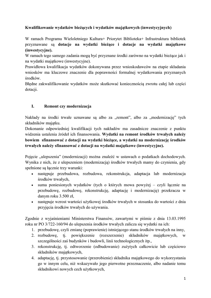 Kwalifikowanie wydatków bieżących i wydatków majątkowych (inwestycyjnych) W ramach Programu Wieloletniego Kultura+ Priorytet Biblioteka+ Infrastruktura bibliotek przyznawane są dotacje na wydatki bieżące i dotacje na wydatki majątkowe (inwestycyjne). W ramach tego samego zadania mogą być przyznane środki zarówno na wydatki bieżące jak i na wydatki majątkowe (inwestycyjne). Prawidłowa kwalifikacja wydatków dokonywana przez wnioskodawców na etapie składania wniosków ma kluczowe znaczenie dla poprawności formalnej wydatkowania przyznanych środków. Błędne zakwalifikowanie wydatków może skutkować koniecznością zwrotu całej lub części dotacji. I. Remont czy modernizacja Nakłady na środki trwałe uznawane są albo za „remont”, albo za „modernizację” tych składników majątku. Dokonanie odpowiedniej kwalifikacji tych nakładów ma zasadnicze znaczenie z punktu widzenia ustalenia źródeł ich finansowania. Wydatki na remont środków trwałych należy bowiem sfinansować z dotacji na wydatki bieżące, a wydatki na modernizację środków trwałych należy sfinansować z dotacji na wydatki majątkowe (inwestycyjne). Pojęcie „ulepszenia” (modernizacji) można znaleźć w ustawach o podatkach dochodowych. Wynika z nich, że z ulepszeniem (modernizacją) środków trwałych mamy do czynienia, gdy spełnione są łącznie trzy warunki: następuje przebudowa, rozbudowa, rekonstrukcja, adaptacja lub modernizacja środków trwałych, suma poniesionych wydatków (tych o których mowa powyżej – czyli łącznie na przebudowę, rozbudowę, rekonstrukcję, adaptację i modernizację) przekracza w danym roku 3.500 zł, następuje wzrost wartości użytkowej środków trwałych w stosunku do wartości z dnia przyjęcia środków trwałych do używania. Zgodnie z wyjaśnieniami Ministerstwa Finansów, zawartymi w piśmie z dnia 13.03.1995 roku nr PO 3/722-160/94 do ulepszenia środków trwałych zalicza się wydatki na ich: 1. przebudowę, czyli zmianę (poprawienie) istniejącego stanu środków trwałych na inny, 2. rozbudowę, tj. powiększenie (rozszerzenie) składników majątkowych, w szczególności zaś budynków i budowli, linii technologicznych itp., 3. rekonstrukcję, tj. odtworzenie (odbudowanie) zużytych całkowicie lub częściowo składników majątkowych, 4. adaptację, tj. przystosowanie (przerobienie) składnika majątkowego do wykorzystania go w innym celu, niż wskazywało jego pierwotne przeznaczenie, albo nadanie temu składnikowi nowych cech użytkowych, 1 5. modernizację, tj. unowocześnienie środków trwałych. Pojęcia „remontu” nie definiują przepisy ustaw o podatkach dochodowych, ale w orzecznictwie sądów administracyjnych utrwalił się pogląd, że za „remont” można uznać wszelkie działania przywracające pierwotny stan techniczny środka trwałego wraz z wymianą zużytych składników technicznych. Zgodnie natomiast z przepisami Prawa budowlanego remont to wykonywanie w istniejącym obiekcie budowlanym robót budowlanych polegających na odtworzeniu stanu pierwotnego, a nie stanowiących bieżącej konserwacji, przy czym dopuszcza się stosowanie wyrobów budowlanych innych niż użyto w stanie pierwotnym. Istotą remontu jest więc przywrócenie (odtworzenie) pierwotnego stanu technicznego środka trwałego, niezmieniające jego charakteru i funkcji, następujące w trakcie eksploatacji środka trwałego i wynikające z tej eksploatacji. Na tych samych zasadach jak „remont” rozlicza się wydatki o charakterze konserwacyjnym, mające na celu utrzymanie składnika majątkowego w należytym stanie technicznym, zapobiegające przedwczesnemu niszczeniu, nie powodujące zmian sposobu używania obiektu. Różnica pomiędzy nakładami ponoszonymi na remont a nakładami ponoszonymi na ulepszenie (modernizację) środków trwałych polega więc na tym, że remont zmierza do podtrzymania, odtworzenia wartości użytkowej środka trwałego i jest rodzajem naprawy, wymiany zużytych elementów, natomiast w wyniku ulepszenia (modernizacji) środek trwały zostaje unowocześniony lub przystosowany do spełniania innych, nowych funkcji, zyskuje istotną zmianę cech użytkowych (IPPB5/423-641/12-3/RS, 2012.10.16, Dyrektor Izby Skarbowej w Warszawie). W praktyce okazuje się, że duże znaczenie dla kwalifikacji nakładów do „remontowych” lub „modernizacyjnych” będą miały kryteria techniczne. Jeżeli nakłady mają charakter odtworzeniowy i mają na celu przywrócenie pierwotnego stanu zużytego całkowicie lub częściowo składnika majątkowego, to należy je uznać za „remont” i finansować je z dotacji na wydatki bieżące. Jeżeli natomiast nakłady mają na celu wzrost wartości użytkowej środka trwałego to należy je uznać za „ulepszenie” środka trwałego i finansować je z dotacji na wydatki majątkowe (inwestycyjne). Przy kwalifikowaniu wydatków należy również brać pod uwagę zmieniającą się rzeczywistość gospodarczą i postęp techniczny, mające wpływ na sposób i środki realizowania robót. Pewne unowocześnienie środka trwałego w wyniku poddania go pracom remontowym przy zastosowaniu materiałów nowej generacji nie musi być równoznaczne z jego ulepszeniem (modernizacją). II. Definicja środków trwałych Zgodnie z ustawą o rachunkowości w skład rzeczowych aktywów trwałych wchodzą środki trwałe i środki trwałe w budowie. 2 Środki trwałe ustawa określa jako „rzeczowe aktywa trwałe i zrównane z nimi, o przewidywanym okresie ekonomicznej użyteczności dłuższym niż rok, kompletne, zdatne do użytku i przeznaczone na potrzeby jednostki” Do środków trwałych zalicza się: nieruchomości (np. grunty, budynki), maszyny i urządzenia, środki transportu, inne przedmioty, kompletne i zdatne do użytku w momencie przyjęcia do użytkowania, ulepszenia w obcych środkach trwałych, inwentarz żywy. W celu uproszczenia ewidencji i zmniejszenia jej pracoch