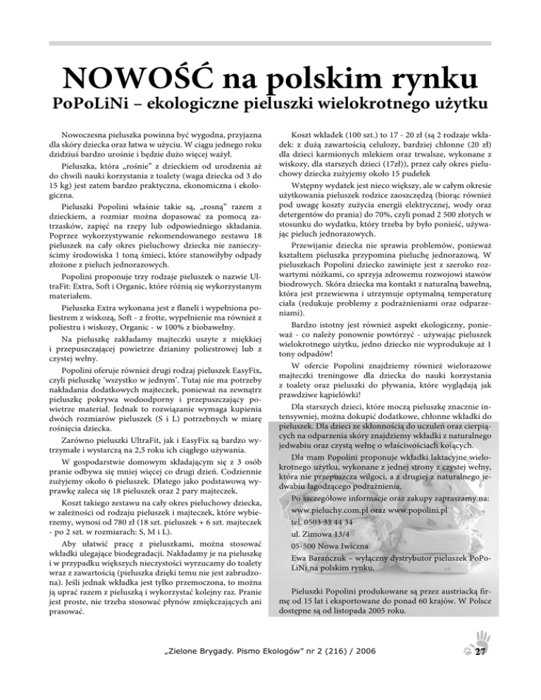 NOWOŚĆ na polskim rynku PoPoLiNi – ekologiczne pieluszki wielokrotnego użytku Nowoczesna pieluszka powinna być wygodna, przyjazna dla skóry dziecka oraz łatwa w użyciu. W ciągu jednego roku dzidziuś bardzo urośnie i będzie dużo więcej ważył. Pieluszka, która „rośnie” z dzieckiem od urodzenia aż do chwili nauki korzystania z toalety (waga dziecka od 3 do 15 kg) jest zatem bardzo praktyczna, ekonomiczna i ekologiczna. Pieluszki Popolini właśnie takie są, „rosną” razem z dzieckiem, a rozmiar można dopasować za pomocą zatrzasków, zapięć na rzepy lub odpowiedniego składania. Poprzez wykorzystywanie rekomendowanego zestawu 18 pieluszek na cały okres pieluchowy dziecka nie zanieczyścimy środowiska 1 toną śmieci, które stanowiłyby odpady złożone z pieluch jednorazowych. Popolini proponuje trzy rodzaje pieluszek o nazwie UltraFit: Extra, Soft i Organic, które różnią się wykorzystanym materiałem. Pieluszka Extra wykonana jest z flaneli i wypełniona poliestrem z wiskozą, Soft - z frotte, wypełnienie ma również z poliestru i wiskozy, Organic - w 100% z biobawełny. Na pieluszkę zakładamy majteczki uszyte z miękkiej i przepuszczającej powietrze dzianiny poliestrowej lub z czystej wełny. Popolini oferuje również drugi rodzaj pieluszek EasyFix, czyli pieluszkę ‘wszystko w jednym’. Tutaj nie ma potrzeby nakładania dodatkowych majteczek, ponieważ na zewnątrz pieluszkę pokrywa wodoodporny i przepuszczający powietrze materiał. Jednak to rozwiązanie wymaga kupienia dwóch rozmiarów pieluszek (S i L) potrzebnych w miarę rośnięcia dziecka. Zarówno pieluszki UltraFit, jak i EasyFix są bardzo wytrzymałe i wystarczą na 2,5 roku ich ciągłego używania. W gospodarstwie domowym składającym się z 3 osób pranie odbywa się mniej więcej co drugi dzień. Codziennie zużyjemy około 6 pieluszek. Dlatego jako podstawową wyprawkę zaleca się 18 pieluszek oraz 2 pary majteczek. Koszt takiego zestawu na cały okres pieluchowy dziecka, w zależności od rodzaju pieluszek i majteczek, które wybierzemy, wynosi od 780 zł (18 szt. pieluszek + 6 szt. majteczek - po 2 szt. w rozmiarach: S, M i L). Aby ułatwić pracę z pieluszkami, można stosować wkładki ulegające biodegradacji. Nakładamy je na pieluszkę i w przypadku większych nieczystości wyrzucamy do toalety wraz z zawartością (pieluszka dzięki temu nie jest zabrudzona). Jeśli jednak wkładka jest tylko przemoczona, to można ją uprać razem z pieluszką i wykorzystać kolejny raz. Pranie jest proste, nie trzeba stosować płynów zmiękczających ani prasować. Koszt wkładek (100 szt.) to 17 - 20 zł (są 2 rodzaje wkładek: z dużą zawartością celulozy, bardziej chłonne (20 zł) dla dzieci karmionych mlekiem oraz trwalsze, wykonane z wiskozy, dla starszych dzieci (17zł)), przez cały okres pieluchowy dziecka zużyjemy około 15 pudełek Wstępny wydatek jest nieco większy, ale w całym okresie użytkowania pieluszek rodzice zaoszczędzą (biorąc również pod uwagę koszty zużycia energii elektrycznej, wody oraz detergentów do prania) do 70%, czyli ponad 2 500 złotych w stosunku do wydatku, który trzeba by było ponieść, używając pieluch jednorazowych. Przewijanie dziecka nie sprawia problemów, ponieważ kształtem pieluszka przypomina pieluchę jednorazową. W pieluszkach Popolini dziecko zawinięte jest z szeroko rozwartymi nóżkami, co sprzyja zdrowemu rozwojowi stawów biodrowych. Skóra dziecka ma kontakt z naturalną bawełną, która jest przewiewna i utrzymuje optymalną temperaturę ciała (redukuje problemy z podrażnieniami oraz odparzeniami). Bardzo istotny jest również aspekt ekologiczny, ponieważ - co należy ponownie powtórzyć - używając pieluszek wielokrotnego użytku, jedno dziecko nie wyprodukuje aż 1 tony odpadów! W ofercie Popolini znajdziemy również wielorazowe majteczki treningowe dla dziecka do nauki korzystania z toalety oraz pieluszki do pływania, które wyglądają jak prawdziwe kąpielówki! Dla starszych dzieci, które moczą pieluszkę znacznie intensywniej, można dokupić dodatkowe, chłonne wkładki do pieluszek. Dla dzieci ze skłonnością do uczuleń oraz cierpiących na odparzenia skóry znajdziemy wkładki z naturalnego jedwabiu oraz czystą wełnę o właściwościach kojących. Dla mam Popolini proponuje wkładki laktacyjne wielokrotnego użytku, wykonane z jednej strony z czystej wełny, która nie przepuszcza wilgoci, a z drugiej z naturalnego jedwabiu łagodzącego podrażnienia. Po szczegółowe informacje oraz zakupy zapraszamy na: www.pieluchy.com.pl oraz www.popolini.pl tel. 0503 33 44 34 ul. Zimowa 13/4 05-500 Nowa Iwiczna Ewa Barańczuk – wyłączny dystrybutor pieluszek PoPoLiNi na polskim rynku. Pieluszki Popolini produkowane są przez austriacką firmę od 15 lat i eksportowane do ponad 60 krajów. W Polsce dostępne są od listopada 2005 roku. „Zielone Brygady. Pismo Ekologów” nr 2 (216) / 2006 27