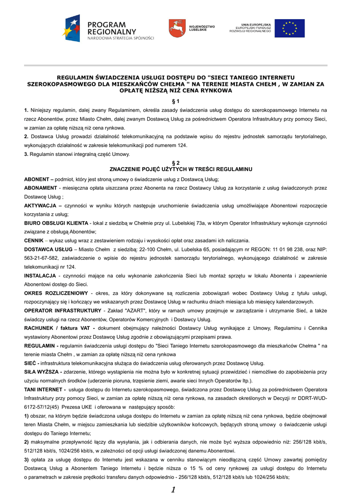 REGULAMIN ŚWIADCZENIA USŁUGI DOSTĘPU DO "SIECI TANIEGO INTERNETU SZEROKOPASMOWEGO DLA MIESZKAŃCÓW CHEŁMA " NA TERENIE MIASTA CHEŁM , W ZAMIAN ZA OPŁATĘ NIŻSZĄ NIŻ CENA RYNKOWA §1 1. Niniejszy regulamin, dalej zwany Regulaminem, określa zasady świadczenia usług dostępu do szerokopasmowego Internetu na rzecz Abonentów, przez Miasto Chełm, dalej zwanym Dostawcą Usług za pośrednictwem Operatora Infrastruktury przy pomocy Sieci, w zamian za opłatę niższą niż cena rynkowa. 2. Dostawca Usług prowadzi działalność telekomunikacyjną na podstawie wpisu do rejestru jednostek samorządu terytorialnego, wykonujących działalność w zakresie telekomunikacji pod numerem 124. 3. Regulamin stanowi integralną część Umowy. §2 ZNACZENIE POJĘĆ UŻYTYCH W TREŚCI REGULAMINU ABONENT – podmiot, który jest stroną umowy o świadczenie usług z Dostawcą Usług; ABONAMENT - miesięczna opłata uiszczana przez Abonenta na rzecz Dostawcy Usług za korzystanie z usług świadczonych przez Dostawcę Usług ; AKTYWACJA – czynności w wyniku których następuje uruchomienie świadczenia usług umożliwiające Abonentowi rozpoczęcie korzystania z usług; BIURO OBSŁUGI KLIENTA - lokal z siedzibą w Chełmie przy ul. Lubelskiej 73a, w którym Operator Infrastruktury wykonuje czynności związane z obsługą Abonentów; CENNIK – wykaz usług wraz z zestawieniem rodzaju i wysokości opłat oraz zasadami ich naliczania. DOSTAWCA USŁUG – Miasto Chełm z siedzibą: 22-100 Chełm, ul. Lubelska 65, posiadającym nr REGON: 11 01 98 238, oraz NIP: 563-21-67-582, zaświadczenie o wpisie do rejestru jednostek samorządu terytorialnego, wykonującego działalność w zakresie telekomunikacji nr 124. INSTALACJA - czynności mające na celu wykonanie zakończenia Sieci lub montaż sprzętu w lokalu Abonenta i zapewnienie Abonentowi dostęp do Sieci. OKRES ROZLICZENIOWY - okres, za który dokonywane są rozliczenia zobowiązań wobec Dostawcy Usług z tytułu usługi, rozpoczynający się i kończący we wskazanych przez Dostawcę Usług w rachunku dniach miesiąca lub miesięcy kalendarzowych. OPERATOR INFRASTRUKTURY - Zakład "AZART", który w ramach umowy przejmuje w zarządzanie i utrzymanie Sieć, a także świadczy usługi na rzecz Abonentów, Operatorów Komercyjnych i Dostawcy Usług. RACHUNEK / faktura VAT - dokument obejmujący należności Dostawcy Usług wynikające z Umowy, Regulaminu i Cennika wystawiony Abonentowi przez Dostawcę Usług zgodnie z obowiązującymi przepisami prawa. REGULAMIN - regulamin świadczenia usługi dostępu do "Sieci Taniego Internetu szerokopasmowego dla mieszkańców Chełma " na terenie miasta Chełm , w zamian za opłatę niższą niż cena rynkowa SIEĆ - infrastruktura telekomunikacyjna służąca do świadczenia usług oferowanych przez Dostawcę Usług. SIŁA WYŻSZA - zdarzenie, którego wystąpienia nie można było w konkretnej sytuacji przewidzieć i niemożliwe do zapobieżenia przy użyciu normalnych środków (uderzenie pioruna, trzęsienie ziemi, awarie sieci Innych Operatorów Itp.). TANI INTERNET - usługa dostępu do Internetu szerokopasmowego, świadczona przez Dostawcę Usług za pośrednictwem Operatora Infrastruktury przy pomocy Sieci, w zamian za opłatę niższą niż cena rynkowa, na zasadach określonych w Decyzji nr DDRT-WUD6172-57/12(45) Prezesa UKE i oferowana w następujący sposób: 1) obszar, na którym będzie świadczona usługa dostępu do Internetu w zamian za opłatę niższą niż cena rynkowa, będzie obejmował teren Miasta Chełm, w miejscu zamieszkania lub siedzibie użytkowników końcowych, będących stroną umowy o świadczenie usługi dostępu do Taniego Internetu; 2) maksymalne przepływność łączy dla wysyłania, jak i odbierania danych, nie może być wyższa odpowiednio niż: 256/128 kbit/s, 512/128 kbit/s, 1024/256 kbit/s, w zależności od opcji usługi świadczonej danemu Abonentowi. 3) opłata za usługę dostępu do Internetu jest wskazana w cenniku stanowiącym nieodłączną część Umowy zawartej pomiędzy Dostawcą Usług a Abonentem Taniego Internetu i będzie niższa o 15 % od ceny rynkowej za usługi dostępu do Internetu o parametrach w zakresie prędkości transferu danych odpowiednio - 256/128 kbit/s, 512/128 kbit/s lub 1024/256 kbit/s; 4) łączny czas trwania połączenia z Internetem w trakcie pojedynczej sesji, nie będzie dłuższy niż 6 godzin. UMOWA - umowa o świadczenie usług zawarta w formie pisemnej między Abonentem a Dostawcą Usług. USŁUGI DODATKOWE - usługi, które Abonent może dodatkowo zlecić. Dostawca Usług będzie świadczyć te usługi w miarę możliwości technicznych; ZAKOŃCZENIE SICI - fizyczny punkt w Lokalu Abonenta, w którym otrzymuje on dostęp do Sieci; ZAMAWIAJĄCY - podmiot ubiegający się o zawarcie Umowy. §3 WARUNKI ZAWARCIA UMOWY. 1. Przez zawarcie Umowy Dostawca Usług zobowiązuje się do świadczenia usługi dostępu do szerokopasmowego Internetu, za pośrednictwem Operatora Infrastruktury przy pomocy Sieci, w zamian za opłatę niższą niż cena rynkowa, zgodnie z Umową i Regulaminem, a Abonent zobowiązuje się do terminowego regulowania płatności oraz przestrzegania przepisów prawa, postanowień Umowy i Regulaminu. 2. Umowę w imieniu Dostawcy Usług zawiera osoba przez niego umocowana. 3. Abonent będący osobą prawną zawiera Umowę poprzez osoby upoważnione do jej reprezentowania. 4. Przy zawieraniu Umowy Zamawiający winien udostępnić i udokumentować Dostawcy Usług następujące dane: imię (imiona), nazwisko (nazwiska), adres zamieszkania (adres do korespondencji), telefon kontaktowy, nr PESEL, oraz posiadanie tytułu prawnego do lokalu, w którym zainstalowane ma być świadczona usługa, a osoba prawna: nazwę firmy, odpis z rejestru i nr NIP oraz posiadanie tytułu prawnego do lokalu, w którym będzie świadczona usługa. 5. Zamawiający składa w Biurze Obsługi Klienta wniosek o zawarcie Umowy z Dostawc