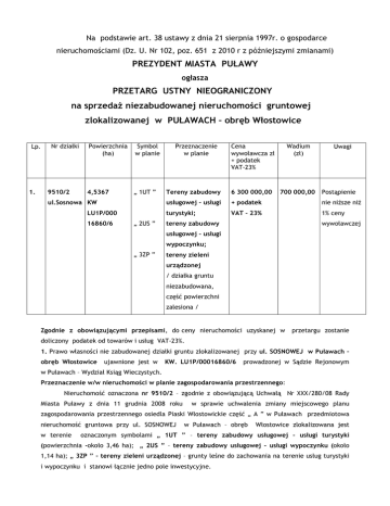 Na podstawie art. 38 ustawy z dnia 21 sierpnia 1997r. o gospodarce nieruchomościami (Dz. U. Nr 102, poz. 651 z 2010 r z późniejszymi zmianami) PREZYDENT MIASTA PUŁAWY ogłasza PRZETARG USTNY NIEOGRANICZONY na sprzedaż niezabudowanej nieruchomości gruntowej zlokalizowanej w PUŁAWACH – obręb Włostowice Lp. 1. Nr działki 9510/2 Powierzchnia (ha) Symbol w planie 4,5367 „ 1UT ” ul.Sosnowa KW LU1P/000 16860/6 „ 2US ” Przeznaczenie w planie Cena wywoławcza zł + podatek VAT-23% Wadium (zł) Tereny zabudowy 6 300 000,00 700 000,00 usługowej – usługi + podatek nie niższe niż turystyki; VAT – 23% 1% ceny tereny zabudowy Uwagi Postąpienie wywoławczej usługowej – usługi wypoczynku; „ 3ZP ” tereny zieleni urządzonej / działka gruntu niezabudowana, część powierzchni zalesiona / Zgodnie z obowiązującymi przepisami, do ceny nieruchomości uzyskanej w przetargu zostanie doliczony podatek od towarów i usług VAT-23%. 1. Prawo własności nie zabudowanej działki gruntu zlokalizowanej przy ul. SOSNOWEJ w Puławach – obręb Włostowice ujawnione jest w KW. LU1P/00016860/6 prowadzonej w Sądzie Rejonowym w Puławach – Wydział Ksiąg Wieczystych. Przeznaczenie w/w nieruchomości w planie zagospodarowania przestrzennego: Nieruchomość oznaczona nr 9510/2 – zgodnie z obowiązującą Uchwałą Nr XXX/280/08 Rady Miasta Puławy z dnia 11 grudnia 2008 roku w sprawie uchwalenia zmiany miejscowego planu zagospodarowania przestrzennego osiedla Piaski Włostowickie część „ A ” w Puławach przedmiotowa nieruchomość gruntowa przy ul. SOSNOWEJ w terenie w Puławach – obręb Włostowice zlokalizowana jest oznaczonym symbolami „ 1UT ” – tereny zabudowy usługowej – usługi turystyki (powierzchnia -około 3,46 ha); „ 2US ” – tereny zabudowy usługowej – usługi wypoczynku (około 1,14 ha); „ 3ZP ” – tereny zieleni urządzonej – grunty leśne do zachowania na terenie usług turystyki i wypoczynku i stanowi łącznie jedno pole inwestycyjne. Zmiana miejscowego planu zagospodarowania przestrzennego osiedla Piaski Włostowickie część „ A ” polegała na uwzględnieniu w zapisach planu opracowanej wstępnej koncepcji urbanistyczno – architektonicznej ośrodka sportowo-rekreacyjnego w Puławach. Nieruchomość gruntowa w części zalesiona, istniejący las stanowi około 20 % całej powierzchni. Nieruchomość przy ul. SOSNOWEJ posiada bezpośredni dostęp do drogi publicznej drogi gminnej – w budowie; wyposażonej w elementy infrastruktury technicznej: wodociąg, kanalizację sanitarną i deszczową , energię elektryczną oraz sieć gazową Niezabudowana nieruchomość przy ul. SOSNOWEJ w Puławach – obręb Włostowice zlokalizowana jest w bezpośrednim sąsiedztwie nowopowstającej zabudowy wielorodzinnej, zabudowy jednorodzinnej oraz terenów zalesionych i zakrzewionych. Na przedmiotowej nieruchomości nie ciążą żadne ograniczone prawa rzeczowe ani roszczenia osób trzecich i nie istnieją ograniczenia w rozporządzaniu nią oraz nie istnieją warunki powstania hipoteki przymusowej obciążającej nieruchomość z mocy art. 34 i 35 ustawy z dnia 29 sierpnia 1997 r ordynacja podatkowa. Przetarg odbędzie się w dniu 28 września 2012 r, o godzinie 1200, w sali konferencyjnej w Urzędzie Miasta Puławy przy ul. Lubelskiej 5. W przetargu mogą uczestniczyć krajowe i zagraniczne osoby fizyczne i prawne, jeżeli wpłacą wadium. Wadium w pieniądzu należy wpłacić na konto Urzędu Miasta Puławy nr 15 1560 1195 2311 0970 9957 0004 w GETIN BANK SA nie później niż w dniu 24 września 2012r. (oryginał o dokonanym przelewie potwierdzony przez bank – należy przedstawić komisji przetargowej przed otwarciem przetargu tj. w trakcie ustalania listy licytantów). Za datę wpłacenia wadium uważa się wpływ wymaganej kwoty na w/w rachunek. Terminy zagospodarowania nieruchomości. Rozpoczęcie inwestycji (tj. wybudowanie fundamentów) maksymalnie 2 lata od podpisania umowy notarialnej. Zakończenie budowy maksymalnie 5 lat od dnia podpisania umowy notarialnej. W notarialnej umowie sprzedaży nieruchomości zostanie zastrzeżone na rzecz gminy Miasto Puławy prawo odkupu na okres 5 lat ( art. 593 k.c. ) w razie niedotrzymania któregokolwiek z ustalonych terminów zagospodarowania nieruchomości, odstąpienia od wskazanego celu zabudowy lub niedotrzymania innych warunków umowy. W przypadku niedotrzymania któregokolwiek z ustalonych terminów zagospodarowania nieruchomości gruntowej, w terminie 5 lat od daty podpisania umowy sprzedaży oraz niezrealizowania przeznaczenia nieruchomości, nabywca nieruchomości zapłaci gminie Miasto Puławy kary umowne, w każdym z wymienionych przypadków w wysokości 10 % ceny nabycia, bez względu na to, czy gmina Miasto Puławy poniesie z tego tytułu szkodę i w jakiej wysokości. Co do obowiązku zapłaty kar umownych, nabywca nieruchomości podda się egzekucji zgodnie z art. 777 § 1 pkt.5 k.p.c. Zapłata kar umownych zabezpieczona będzie poprzez ustanowienie na zbywanej nieruchomości hipoteki umownej w kwocie równej 10 % ceny sprzedaży nieruchomości. Jeżeli nabywca nie rozpocznie budowy w terminie 5 lat od dnia podpisania aktu notarialnego, nieruchomość po upływie tego terminu zostanie sprzedana gminie Miasto Puławy ( prawo odkupu ) na warunkach określonych w art. 593, art. 594, art. 595 k.c. Osoba ustalona jako nabywca nieruchomości zobowiązana jest przed wyznaczonym terminem podpisania umowy notarialnej zapłacić kwotę równą 100% ceny nieruchomości osiągniętej w przetargu, pomniejszonej o wpłacone wadium. Nie uiszczenie tej kwoty spowoduje odstąpienie od zawarcia umowy i przepadek wadium. Wpłata powinna nastąpić nie później niż na 2 dni przed podpisaniem umowy sprzedaży. Za datę wpłaty uważa się wpływ wymaganej należności na rachunek Urzędu Miasta Puławy. Jeżeli osoba ustalona jako nabywca nieruchomości nie przystąpi bez usprawiedliwienia do