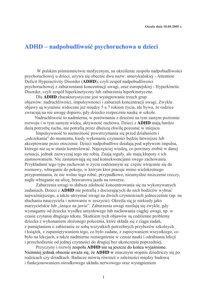 Ossala dnia 10.05.2005 r. ADHD – nadpobudliwość psychoruchowa u dzieci W polskim piśmiennictwie medycznym, na określenie zespołu nadpobudliwości psychoruchowej u dzieci, uŜywa się obecnie dwu nazw: amerykańskiej - Attention Deficit Hyperactivity Disorder (ADHD), czyli zespół nadpobudliwości psychoruchowej z zaburzeniami koncentracji uwagi, oraz europejskiej - Hyperkinetic Disorder, czyli zespół hiperkinetyczny lub zaburzenia hiperkinetyczne. Dla ADHD charakterystyczne jest występowanie trzech grup objawów: nadruchliwości, impulsywności i zaburzeń koncentracji uwagi. Zwykle objawy są wyraźnie widoczne juŜ między 5 a 7 rokiem Ŝycia, ale bywa, Ŝe rodzice zwracają na nie uwagę dopiero, gdy dziecko rozpocznie naukę w szkole. Nadruchliwość to nadmierna, w porównaniu z dziećmi na tym samym poziomie rozwoju i w tym samym wieku, aktywność ruchowa. Dzieci z ADHD mają bardzo duŜą potrzebę ruchu, nie potrafią przez dłuŜszą chwilę pozostać w miejscu. Impulsywność to niemoŜność powstrzymania się przed działaniem i „odczekania” do momentu, kiedy wykonanie czynności będzie łatwiejsze lub akceptowane przez otoczenie. Dzieci nadpobudliwe działają pod wpływem impulsu, którego nie są w stanie kontrolować. Najczęściej wiedzą, co powinny zrobić w danej sytuacji, jednak zazwyczaj tego nie robią. Znają reguły, ale mają kłopoty z ich zastosowaniem. Nie zastanawiają się nad konsekwencjami swego zachowania. Przykładami tego typu zachowań w Ŝyciu codziennym są: częste wtrącanie się do rozmowy, wbieganie do pokoju, w którym ktoś pracuje mimo wielokrotnego przypominania, Ŝe nie wolno tego robić, przypadkowe, nieumyślne niszczenie rzeczy, nagłe wbieganie na ulicę, brawurowa jazda na rowerze. Zaburzenia uwagi to słabsza zdolność koncentrowania się na wykonywanych zadaniach. Dzieci z ADHD nie potrafią z docierających do nich bodźców wybrać najwaŜniejszego, a takŜe utrzymać uwagi na dwóch czynnościach jednocześnie (np. na słuchaniu nauczyciela i notowaniu w zeszycie). Określa się je niekiedy jako marzycielskie lub „śniące na jawie”. Zaburzenia uwagi nasilają się zwykle, gdy wymagamy od dziecka wysiłku umysłowego lub zachowania ciągłej uwagi, np. w czasie czytania długiego tekstu. Skutkiem tych objawów są codzienne problemy dziecka z wykonaniem złoŜonego polecenia, które składa się z ciągu zadań, z pamiętaniem o zabieraniu ze sobą wszystkich potrzebnych przyborów szkolnych i ksiąŜek, z zapamiętywaniem tego, co było zadane, z zapisywaniem wszystkiego, co było na lekcjach, a takŜe nadmierne roztargnienie w czasie nauki i odrabiania lekcji i przechodzenie od jednej czynności do drugiej bez ukończenia poprzedniej. Przyczyny i rozwój zespołu ADHD nie są jeszcze do końca wyjaśnione. Niemniej jednak obecnie uwaŜa się, Ŝe ADHD w znacznym stopniu dziedziczy się po rodzicach czy dziadkach. Badacze mówią równieŜ o zaleŜności między budową i funkcjonowaniem ośrodkowego układu nerwowego oraz wystąpieniem 1 nadpobudliwości. Wymienia się takŜe wiele czynników środowiskowych, które mogą nasilać objawy ADHD – np. ekspozycja dziecka na szkodliwe czynniki w czasie ciąŜy (dym papierosowy), problemy okołoporodowe. Obecnie (inaczej niŜ jeszcze kilkanaście lat temu) uwaŜa się, Ŝe ADHD nie jest wynikiem uszkodzenia układu nerwowego, lecz opóźnionym dojrzewaniem niektórych struktur mózgu. Za takim wyjaśnieniem przemawia zmniejszanie się nasilenia lub ustępowanie objawów wraz z wiekiem u znacznej liczby pacjentów. Na poziomie biochemicznym, u osób z ADHD dochodzi prawdopodobnie do osłabienia działania dwu substancji (dopaminy i noradrenaliny) uczestniczących w przekazywaniu pobudzeń w układnie nerwowym. Leki stosowane w farmakoterapii ADHD zwiększają aktywność tych substancji w mózgu. Zespół nadpobudliwości psychoruchowej występuje na całym świecie i we wszystkich kulturach. Jego częstość wśród dzieci w wieku 7-13 lat jest oceniana na 35%, z przewagą występowania u chłopców. Niestety, tylko ok. 20% pacjentów jest objętych specjalistycznym leczeniem. Klasyfikacje zaburzeń psychicznych – europejska i amerykańska nieco inaczej ujmują nadpobudliwość psychoruchową. W klasyfikacji amerykańskiej między innymi wyróŜniono trzy podtypy ADHD: podtyp, w którym dominują zaburzenia uwagi, podtyp z przewaŜającą nadruchliwością i impulsywnością oraz podtyp mieszany. U chłopców dominuje podtyp mieszany a u dziewczynek – z zaburzeniami uwagi. Nie u wszystkich dzieci prezentujących opisane objawy diagnozowane jest ADHD. WaŜne dodatkowe kryteria rozpoznania nadpobudliwości psychoruchowej to: pojawienie się objawów przed 7 rokiem Ŝycia, prezentowanie objawów w co najmniej dwu środowiskach, w których przebywa dziecko (np. w szkole i w domu), oraz znaczne nasilenie objawów, które prowadzi do cierpienia i upośledzenia funkcjonowania dziecka. Obraz nadpobudliwości psychoruchowej zmienia się w czasie; im dziecko starsze, tym mniej nasilone stają się objawy nadruchliwości i impulsywności, tym zaś wyraźniejsze – zaburzenia uwagi. Część pacjentów „wyrasta” z ADHD. Szacuje się, Ŝe w okresie dojrzewania objawy wygasają u około 30% dzieci. Tylko ok. kilka procent pierwszoklasistów z nadpobudliwością będzie miało pełne kliniczne objawy ADHD w dorosłym Ŝyciu. Niemniej jednak około połowa z nich nadal będzie zauwaŜać u siebie pojedyncze objawy tego zaburzenia. Zespół nadpobudliwości psychoruchowej z zaburzeniami koncentracji uwagi moŜe się wiązać z występowaniem wielu dodatkowych problemów – między innymi depresji, niskiej samooceny, specyficznych trudności szkolnych, zachowań opozycyjno – buntowniczych, zaburzeń zachowania. Rozpoznanie nadpobudliwości psychoruchowej u Twojego dziecka nie oznacza, Ŝe te problemy muszą u niego wystąpić. Dziecko naleŜy jednak szczególnie wspi