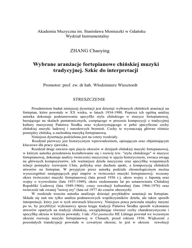 Akademia Muzyczna im. Stanisława Moniuszki w Gdańsku Wydział Instrumentalny ZHANG Chaoying Wybrane aranżacje fortepianowe chińskiej muzyki tradycyjnej. Szkic do interpretacji Promotor: prof. zw. dr hab. Włodzimierz Wiesztordt STRESZCZENIE Przedmiotem badań niniejszej dysertacji jest dziesięć wybranych chińskich aranżacji na fortepian, które powstały w XX wieku, w latach 1934-1980. Poprzez ich ogólną analizę autorka dokonuje podsumowania specyfiki stylu chińskiego w muzyce fortepianowej, bazującego na skalach pentatonicznych, czerpiącego w procesie kompozycji z tradycyjnej kultury muzycznej Państwa Środka oraz wykorzystującego w pełni specyficzne cechy chińskiej muzyki ludowej i narodowych brzmień. Cechy te wyznaczają główne różnice pomiędzy chińską, a zachodnią muzyką fortepianową. Niniejsza dysertacja podzielona jest na cztery rozdziały. Rozdział pierwszy jest historycznym wprowadzeniem, opisującym oraz objaśniającym kluczowe dla pracy zjawiska. Rozdział drugi zawiera opis pięciu okresów w dziejach chińskiej muzyki fortepianowej, w którym autorka przedstawia kształtowanie się i rozwój tzw. "stylu chińskiego" w muzyce fortepianowej, dokonuje analizy twórczości muzycznej w ujęciu historycznym, zwraca uwagę na głównych kompozytorów, ich ważniejsze dzieła muzyczne oraz specyfikę wzajemnych relacji pomiędzy rozwojem Chin, polityką oraz duchem epoki, a kompozycją chińskich utworów na fortepian. W przyjętym przez autorkę podziale chronologicznym można wyszczególnić następujących pięć etapów w twórczości muzyki fortepianowej: wczesny okres twórczości muzyki fortepianowej (lata przed 1936 r.), okres wojny z Japonią oraz wojny o wyzwolenie (lata 1937-1949), okres siedemnastu lat po ustanowieniu Chińskiej Republiki Ludowej (lata 1949-1966), czasy rewolucji kulturalnej (lata 1966-1976) oraz twórczość tak zwanej "nowej ery" (lata od 1977 do czasów obecnych). W rozdziale trzecim autorka analizuje dziesięć przykładów aranżacji na fortepian. Składa się nań nie tylko analiza podstawowych współczynników dzieła, ale także sposób interpretacji, który jest w tych utworach kluczowy. Niniejsza praca powstała między innymi po to, by przybliżyć wykonawcy spoza kręgu tradycji Państwa Środka sposób wykonania utworów opartych na tradycji chińskiej, uwzględniając również cechy charakterystyczne i specyfikę okresu w którym powstały. I tak: Flet pastuszka HE Lütinga powstał we wczesnym okresie rozwoju muzyki fortepianowej w Chinach, przed rokiem 1936. Większość z pozostałych transkrypcji powstała w czwartym okresie, to jest w okresie rewolucji kulturalnej, w latach 1966-1976. Należą do nich: Trzy strofy o kwitnieniu śliwy, Sto ptaków wielbiących feniksa, Kolorowe chmury goniące księżyc i Czerwone lilie w rozkwicie Wang Jianzhonga, Flety i bębny o zachodzie słońca Li Yinghaia, Księżyc odbijający się w Er-Quan Chu Wanghua oraz Spokojne jezioro w świetle jesiennego księżyca Chen Peixuna. Z trzeciego okresu rozwoju muzyki fortepianowej w Chinach, przypadającego na lata 1949-1966 pochodzi aranżacja Sprzedaż towarów drobnych Chen Peixuna, natomiast reprezentatywną dla piątego okresu, po roku 1977 jest kompozycja Wiosenny taniec Sun Yiqianga. Drugi z okresów, lata 1937-1949 nie jest reprezentowany w niniejszej pracy. W okresie tym powstawały wprawdzie drobne utwory fortepianowe, ale główne zapotrzebowanie społeczne koncentrowało się wokół muzyki chóralnej. W rozdziale czwartym autorka dokonuje podsumowania cech chińskich aranżacji na fortepian napisanych w "stylu chińskim" takich jak: budowa formalna, melodyka, harmonia, zmienności rytmu, faktury muzycznej, barwy dźwięku, imitacyjnego charakteru ozdobników. W aneksach dołączonych do niniejszej pracy znajdują się noty biograficzne kompozytorów, których dzieła stanowią przedmiot niniejszej pracy, ryciny wraz z krótkim opisem tradycyjnych instrumentów chińskich, na których wykonywano oryginalne kompozycje, będące podstawą aranżacji, kopie wykonywanych i analizowanych utworów oraz płyta CD z zapisem dzieła artystycznego. 1.He Lüting (贺绿汀) – Flet pastuszka ( chiń. 《牧童短笛》) 2.Chen Peixun(陈培勋)- Sprzedaż towarów drobnych ( chiń.《卖杂货》) 3.Wang Jianzhong (王建中) - Trzy strofy o kwitnieniu śliwy (chiń.《梅花三弄》) 4.Wang Jianzhong (王建中) - Sto ptaków wielbiących feniksa (chiń . 《百鸟朝凤》) 5.Wang Jianzhong (王建中) - Kolorowe chmury goniące księżyc chiń. 《彩云追月》) 6.Wang Jianzhong (王建中) - Czerwone lilie w rozkwicie ( chiń. 《山丹丹开花红艳艳》 ) 7.Li Yinghai (黎英海)- Flety i bębny o zachodzie słońca ( chiń.《夕阳箫鼓》) 8.Chu Wanghua (储望华)- Księżyc odbijający się w Er-Quan ( chiń. 《二泉映月》) 9.Chen Peixun(陈培勋)- Spokojne jezioro w świetle jesiennego księżyca ( chiń. 《平湖 秋月》) 10.Sun Yiqiang (孙以强) - Wiosenny taniec (chiń. 《春舞》)