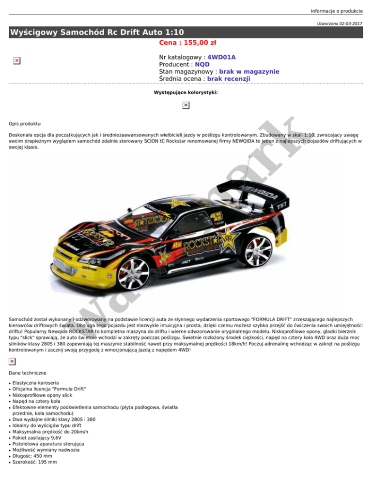 Informacje o produkcie Utworzono 02-03-2017 Wyścigowy Samochód Rc Drift Auto 1:10 Cena : 155,00 zł Nr katalogowy : 4WD01A Producent : NQD Stan magazynowy : brak w magazynie Średnia ocena : brak recenzji Występujące kolorystyki: Opis produktu at er m ar k Doskonała opcja dla początkujących jak i średniozaawansowanych wielbicieli jazdy w poślizgu kontrolowanym. Zbudowany w skali 1:10, zwracający uwagę swoim drapieżnym wyglądem samochód zdalnie sterowany SCION tC Rockstar renomowanej firmy NEWQIDA to jeden z najlepszych pojazdów driftujących w swojej klasie. w Samochód został wykonany i odzworowany na podstawie licencji auta ze słynnego wydarzenia sportowego "FORMULA DRIFT" zrzeszającego najlepszych kierowców driftowych świata. Obsługa tego pojazdu jest niezwykle intuicyjna i prosta, dzięki czemu możesz szybko przejść do ćwiczenia swoich umiejętności driftu! Popularny Newqida ROCKSTAR to kompletna maszyna do driftu i wierne odwzorowanie oryginalnego modelu. Niskoprofilowe opony, gładki bierznik typu "slick" sprawiają, że auto świetnie wchodzi w zakręty podczas poślizgu. Świetnie rozłożony środek ciężkości, napęd na cztery koła 4WD oraz duża moc silników klasy 280S i 380 zapewniają tej maszynie stabilność nawet przy maksymalnej prędkości 18km/h! Poczuj adrenalinę wchodząc w zakręt na poślizgu kontrolowanym i zacznij swoją przygodę z wmocjonującą jazdą z napędem 4WD! Dane techniczne ● ● ● ● ● ● ● ● ● ● ● ● ● Elastyczna karoseria Oficjalna licencja "Formula Drift" Niskoprofilowe opony slick Napęd na cztery koła Efektowne elementy podświetlenia samochodu (płyta podłogowa, światła przednie, koła samochodu) Dwa wydajne silniki klasy 280S i 380 Idealny do wyścigów typu drift Maksymalna prędkość do 20km/h Pakiet zasilający 9,6V Pistoletowa aparatura sterująca Możliwość wymiany nadwozia Długośc: 450 mm Szerokość: 195 mm ● Wysokość: 140 mm Skład zestawu ● ● ● er m ar k ● Licencjonowany Nissan Skyline GT-R Aparatura zdalnego sterowania Pakiet zasilający 9,6V Oryginalne opakowanie Opony do rajdów na licencji Hankook Opony do driftu na licencji Hankook at ● w ●