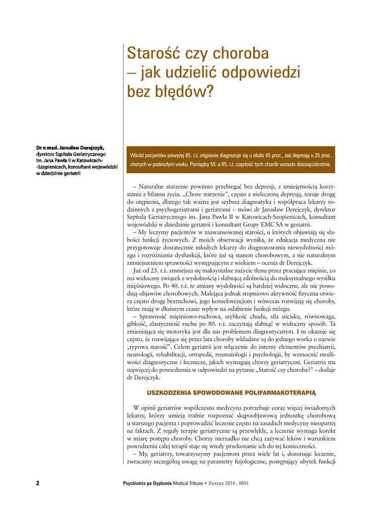 Starość czy choroba – jak udzielić odpowiedzi bez błędów? Dr n med. Jarosław Derejczyk, dyrektor Szpitala Geriatrycznego im. Jana Pawła II w Katowicach-Szopienicach, konsultant wojewódzki w dziedzinie geriatrii Wśród pacjentów powyżej 85. r.ż. otępienie diagnozuje się u około 45 proc., zaś depresję u 25 proc. chorych w podeszłym wieku. Pomiędzy 55. a 85. r.ż. częstość tych chorób wzrasta dziesięciokrotnie. – Naturalne starzenie powinno przebiegać bez depresji, z umiejętnością korzystania z bilansu życia. „Chore starzenie”, często z nieleczoną depresją, toruje drogę do otępienia, dlatego tak ważna jest szybsza diagnostyka i współpraca lekarzy rodzinnych z psychogeriatrami i geriatrami – mówi dr Jarosław Derejczyk, dyrektor Szpitala Geriatrycznego im. Jana Pawła II w Katowicach-Szopienicach, konsultant wojewódzki w dziedzinie geriatrii i konsultant Grupy EMC SA w geriatrii. – My leczymy pacjentów w zaawansowanej starości, u których objawiają się słabości funkcji życiowych. Z moich obserwacji wynika, że edukacja medyczna nie przygotowuje dostatecznie młodych lekarzy do diagnozowania niewydolności mózgu i rozróżniania dysfunkcji, które już są stanem chorobowym, a nie naturalnym zmniejszeniem sprawności występującym z wiekiem – ocenia dr Derejczyk. Już od 25. r.ż. zmniejsza się maksymalne zużycie tlenu przez pracujące mięśnie, co ma widoczny związek z wydolnością i słabnącą zdolnością do maksymalnego wysiłku mięśniowego. Po 40. r.ż. te zmiany wydolności są bardziej widoczne, ale nie powodują objawów chorobowych. Malejąca jednak stopniowo aktywność fizyczna otwiera często drogę bezruchowi, jego konsekwencjom i wówczas rozwijają się choroby, które mają w dłuższym czasie wpływ na osłabienie funkcji mózgu. – Sprawność mięśniowo-ruchowa, szybkość chodu, siła uścisku, równowaga, gibkość, elastyczność ruchu po 80. r.ż. zaczynają słabnąć w widoczny sposób. Ta zmieniająca się motoryka jest dla nas problemem diagnostycznym. I tu okazuje się często, że rozwijające się przez lata choroby wkładane są do jednego worka o nazwie „typowa starość”. Celem geriatrii jest włączenie do interny elementów psychiatrii, neurologii, rehabilitacji, ortopedii, reumatologii i psychologii, by wzmocnić możliwości diagnostyczne i lecznicze, jakich wymagają chorzy geriatryczni. Geriatria ma najwięcej do powiedzenia w odpowiedzi na pytanie „Starość czy choroba?” – dodaje dr Derejczyk. Uszkodzenia spowodowane polifarmakoterapią W opinii geriatrów współczesna medycyna potrzebuje coraz więcej świadomych lekarzy, którzy umieją trafnie rozpoznać skąpoobjawową jednostkę chorobową u starszego pacjenta i poprowadzić leczenie często na zasadach medycyny nieopartej na faktach. Z reguły terapie geriatryczne są przewlekłe, a leczenie wymaga korekt w miarę postępu choroby. Chorzy nierzadko nie chcą zażywać leków i warunkiem powodzenia całej terapii staje się wtedy przekonanie ich do tej konieczności. – My, geriatrzy, towarzyszymy pacjentom przez wiele lat i, dozorując leczenie, zwracamy szczególną uwagę na parametry fizjologiczne, postępujący ubytek funkcji 2 Psychiatria po Dyplomie Medical Tribune • Xxxxxx 2014 - 0041 poznawczych, spadek beztłuszczowej masy ciała czy gorszy z wiekiem metabolizm przyjmowanych leków – komentuje dr Derejczyk i sugeruje, że takie podejście jest szczególnie potrzebne w geriatrii oraz psychogeriatrii. – Jesteśmy często uczniami lekarzy neurofarmakologów i doświadczonych psychiatrów w zakresie ich specjalistycznej wiedzy dotyczącej np. farmakokinetyki leków psychotropowych, prokognitywnych, antydepresyjnych czy neurotymików. My oczywiście też je aplikujemy pacjentom, ale zwykle w mniejszych dawkach, ze względu na osłabioną neurotransmisję, występującą wielochorobowość i duże ryzyko interakcji. Z większą ostrożnością podchodzimy do stosowania benzodiazepin, które najczęściej odstawiamy z powodu działań ubocznych. Wymieniamy doświadczenia, konsultujemy poszczególne przypadki, ale bywa, że w szczególnie trudnych przypadkach to za mało. Pomiędzy geriatrią a psychiatrią istnieje potrzebna przestrzeń dyskusji wokół trudnego starszego chorego, którą wypełnia psychogeriatria i dobra interna w wydaniu, jakie proponuje geriatria – dodaje dr Derejczyk. Tymczasem z powodu uszkodzeń powodowanych polifarmakoterapią do szpitali trafia od 20 do 30 proc. pacjentów po 80. r.ż. Z tego też powodu geriatrzy, śledząc wnikliwie opracowania badawcze, wydzielili listę leków, które trzeba podawać ze świadomością ryzyka, bardzo ostrożnie lub nie podawać ich w ogóle. Lista obejmuje dużą grupę leków, które powinny być znane każdemu specjaliście leczącemu osoby starsze (www.americangeriatrics.org/beers criteria). Nie może się ona ograniczać do prowadzenia rutynowych badań laboratoryjnych. Wymagana jest częstsza kontrola ciśnienia krwi w pozycji leżącej i stojącej badanego, konieczne jest także wykonanie badań wykluczających zaburzenia rytmu serca (neuroleptyki i leki uspokajające wpływają na pracę serca, co w badaniu z zastosowaniem elektrokardiogramu wyraża się wydłużeniem odstępu QT, powodując niebezpieczne zaburzenia rytmu serca). W przypadku pacjentów zażywających statyny warto dodatkowo wykonać na początku i w trakcie leczenia badanie oceniające stężenie enzymu mięśniowej kinazy kreatynowej. Zespoły poneuroleptyczne i miopatie to wspólne problemy psychiatrów i geriatrów. Lista zagrożeń i ostrzeżeń związanych z leczeniem chorób neurodegeneracyjnych jest długa. – Jeśli pacjentowi z wymienionymi dolegliwościami, wynikającymi z wielu chorób, podamy kolejne leki obciążające wątrobę i mózg, możemy doprowadzić do polekowych zespołów parkinsonowskich, nokautując już bardzo słabe przekaźnictwo dopamino
