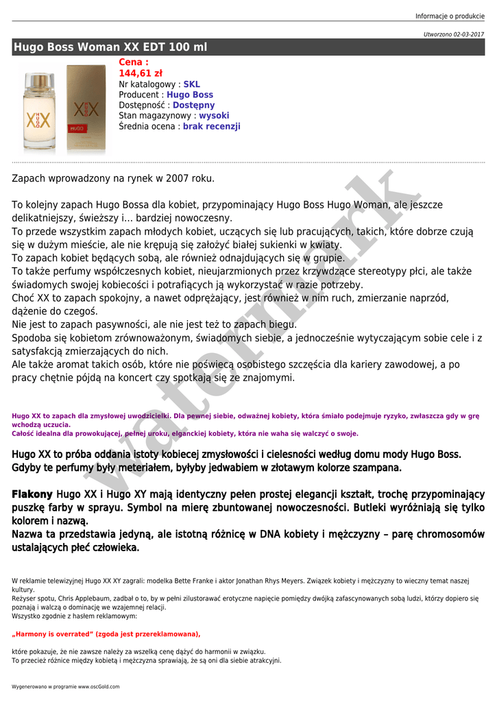 Informacje o produkcie Utworzono 02-03-2017 Hugo Boss Woman XX EDT 100 ml Cena : 144,61 zł Nr katalogowy : SKL Producent : Hugo Boss Dostępność : Dostępny Stan magazynowy : wysoki Średnia ocena : brak recenzji er m ar k Zapach wprowadzony na rynek w 2007 roku. at To kolejny zapach Hugo Bossa dla kobiet, przypominający Hugo Boss Hugo Woman, ale jeszcze delikatniejszy, świeższy i… bardziej nowoczesny. To przede wszystkim zapach młodych kobiet, uczących się lub pracujących, takich, które dobrze czują się w dużym mieście, ale nie krępują się założyć białej sukienki w kwiaty. To zapach kobiet będących sobą, ale również odnajdujących się w grupie. To także perfumy współczesnych kobiet, nieujarzmionych przez krzywdzące stereotypy płci, ale także świadomych swojej kobiecości i potrafiących ją wykorzystać w razie potrzeby. Choć XX to zapach spokojny, a nawet odprężający, jest również w nim ruch, zmierzanie naprzód, dążenie do czegoś. Nie jest to zapach pasywności, ale nie jest też to zapach biegu. Spodoba się kobietom zrównoważonym, świadomych siebie, a jednocześnie wytyczającym sobie cele i z satysfakcją zmierzających do nich. Ale także aromat takich osób, które nie poświecą osobistego szczęścia dla kariery zawodowej, a po pracy chętnie pójdą na koncert czy spotkają się ze znajomymi. Hugo XX to zapach dla zmysłowej uwodzicielki. Dla pewnej siebie, odważnej kobiety, która śmiało podejmuje ryzyko, zwłaszcza gdy w grę wchodzą uczucia. Całość idealna dla prowokującej, pełnej uroku, elganckiej kobiety, która nie waha się walczyć o swoje. w Hugo XX to próba oddania istoty kobiecej zmysłowości i cielesności według domu mody Hugo Boss. Gdyby te perfumy były meteriałem, byłyby jedwabiem w złotawym kolorze szampana. Flakony Hugo XX i Hugo XY mają identyczny pełen prostej elegancji kształt, trochę przypominający puszkę farby w sprayu. Symbol na mierę zbuntowanej nowoczesności. Butleki wyróżniają się tylko kolorem i nazwą. Nazwa ta przedstawia jedyną, ale istotną różnicę w DNA kobiety i mężczyzny – parę chromosomów ustalających płeć człowieka. W reklamie telewizyjnej Hugo XX XY zagrali: modelka Bette Franke i aktor Jonathan Rhys Meyers. Związek kobiety i mężczyzny to wieczny temat naszej kultury. Reżyser spotu, Chris Applebaum, zadbał o to, by w pełni zilustorawać erotyczne napięcie pomiędzy dwójką zafascynowanych sobą ludzi, którzy dopiero się poznają i walczą o dominację we wzajemnej relacji. Wszystko zgodnie z hasłem reklamowym: „Harmony is overrated” (zgoda jest przereklamowana), które pokazuje, że nie zawsze należy za wszelką cenę dążyć do harmonii w związku. To przecież różnice między kobietą i mężczyzna sprawiają, że są oni dla siebie atrakcyjni. Wygenerowano w programie www.oscGold.com Woda toaletowa o orzeźwiającym, prowokującym i zmysłowym aromacie pełnym owocowych i kwiatowych nut. w at er m ar k Nuty zapachowe: nuta głowy: liczi, mandarynka, pomarańcza nuta serca: ryż basmati, jaśmin, róża nuta bazy: drzewo sandałowe, ambra, piżmo.