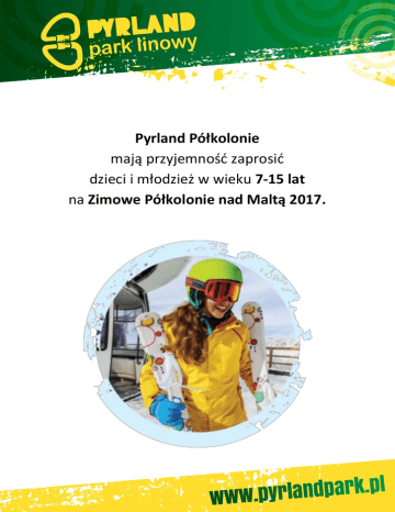 Pyrland Półkolonie mają przyjemnośd zaprosid dzieci i młodzież w wieku 7-15 lat na Zimowe Półkolonie nad Maltą 2017. Jeśli chcesz by Twoje dziecko spędziło atrakcyjnie i bezpiecznie wolny czas w ferie zimowe 2017 pod okiem wykwalifikowanej kadry, zapisz je na Zimowe Półkolonie nad Maltą organizowane przez Pyrland Park Linowy. Nasze półkolonie są zatwierdzone przez Kuratorium Oświaty. Jesteśmy pasjonatami zdrowego trybu życia. Pragniemy upowszechniad model czynnego spędzania czasu dzięki współpracy z instruktorami i animatorami Pyrland Parku Linowego. Poprzez pokazanie zróżnicowanych form aktywności chcemy dad dzieciom możliwośd znalezienia pasji na resztę życia. Na początku turnusu przeprowadzimy autorski program integracyjnych gier sportoworekreacyjnych Team Building, który ma na celu wytworzenie pozytywnych relacji współdziałania w grupie. Dla pozytywnej rozgrzewki skorzystamy też z Parku Trampolin – Jump Arena. Aktywnie spędzimy czas na stoku narciarskim ucząc się jazdy na Nartach z najlepszymi instruktorami. Zrealizujemy zajęcia na Ścianie Wspinaczkowej Climbing Spot – profesjonalne połączenie fantastycznej zabawy ruchowej z elementami technik wspinaczkowych. We wszystkich działaniach ważna będzie aktywnośd fizyczna, dobra zabawa i nauka, ale też odpowiedzialnośd za własne zachowanie czy przełamywanie słabości. Ważny będzie śmiech, ale również rozwój koordynacji ruchowej. Chcemy pokazad młodzieży, że aktywny tryb życia jest świetną alternatywą dla bezsensownego przesiadywania w domu lub na podwórku. Zgłębimy też świat gier planszowych – uruchomimy szare komórki odpowiedzialne za kreatywnośd czy strategię. Ponadto chcemy przeprowadzid zajęcia z pierwszej pomocy żeby nauczyd młodzież odpowiedzialności za życie drugiego człowieka. Ucząc się ratowad inne życie nabieramy szacunku do własnego. Odwiedzimy Palmiarnię oraz przeprowadzimy warsztaty archeologiczne w Muzeum Archeologicznym. DOBRA ZABAWA PRZEZ NAUKĘ i NAUKA PRZEZ ZABAWĘ – to potrafimy robid najlepiej! ZAPRASZAMY! ORGANIZATOR: Marcin Przybył Pyrland ul. Drewsa 8, 61-606 Poznao, PL NIP: 9721209172. LOKALIZACJA: Miejsce zbiórki i odbioru dzieci oraz miejsce obiadu: Szkoła Podstawowa nr 6, os. Rusa 56, 61-245 Poznao. Miejsce zajęd: Ścianka Wspinaczkowa Climbing Spot, Hala AZS, ul. Pułaskiego 30 (Wjazd od ul. Przepadek) 60-607 Poznao. Szkoła Podstawowa nr 6, os. Rusa 56, 61-245 Poznao. Stok Narciarski, ul. Wiankowa 2, 61-131 Poznao. Jump Arena – park trampolin, Galeria Giant, ul. Bolesława Krzywoustego 68 Poznao. W PROGRAMIE: Narty Jump Arena – park trampolin Ścianka Wspinaczkowa Animacje oraz program gier integracyjnych Team Building Świat gier planszowych Pierwsza pomoc Warsztaty archeologiczne w Muzeum Wycieczka do Palmiarni z przewodnikiem Zajęcia sportowe oraz plastyczne PRZYKŁADOWY GRAFIK: PONIEDZIAŁEK WTOREK ŚRODA CZWARTEK PIĄTEK Przejazd do Muzeum (8:30-9:30) Przejazd do AZS (8:30-9:30) zbiórka/animacje (7:30-8:30) Integracja - animacje (8:30-9:30) Przejazd do Palmiarni (8:30-9:30) Przejazd do AZS (8:30-9:30) II ŚNIADANIE (9:30-10:00) Team Buiding - zajęcia sportowe (10:00-12:30) Palmiarnia (10:00-11:30) Ściana Wspinaczkowa (10:00-11:30) Muzeum Archeologiczne (10:00-11:30) Ściana Wspinaczkowa (10:00-11:30) Przejazd do SP6 (11:30-12:30) Przejazd do SP6 (11:30-12:30) Przejazd do SP6 (11:30-12:30) Przejazd do SP6 (11:30-12:30) OBIAD (12:30-13:15) Przejazd do Jump Areny (13:15-13:45) Przejście na Narty (13:15-13:45) Jump Arena (14:00-15:30) Zajęcia Narciarskie (14:00-16:00) Przejazd do SP 6 (15:30-16:00) Przejście do SP 6 (16:00-16:30) PODWIECZOREK (16:00-16:30) PODWIECZOREK (16:30-16:45) Przejście na Narty (13:15-13:45) Gry planszowe (13:15-16:00) PODWIECZOREK (16:00-16:30) Zajęcia Narciarskie (14:00-16:00) Kurs Pierwszej Pomocy (13:15-14:45) Podsumowanie półkolonii (14:45-15:15) Przejście do SP 6 (16:00-16:30) Gry planszowe (15:15-16:15) PODWIECZOREK (16:30-16:45) PODWIECZOREK (16:15-16:30) Odbiór/zajęcia na Sali/zajęcia plastyczne (16:30-17:30) WYŻYWIENIE: Zapewniamy 3 posiłki dziennie: drugie śniadanie, obiad i podwieczorek. Obiad podany będzie w stołówce Szkoły Podstawowej nr 6. Posiłki będą przygotowywane i dostarczane przez profesjonalną firmę cateringową na co dzieo obsługującą poznaoskie szkoły i przedszkola. Uczestnicy półkolonii będą mieli stały dostęp do napojów i owoców. Dostosujemy jadłospis do wszelkich indywidualnych potrzeb (spowodowanych alergią, czy specjalną dietą zdrowotną) zapisanych na kartach zgłoszeniowych do półkolonii. TERMINY TURNUSÓW I GODZINY: Zimowe półkolonie nad Maltą odbędą się w dwóch tygodniowych (5 dni, poniedziałek - piątek) turnusach od 30.01. do 10.02.2017 r. Zapewniamy pełną opiekę nad uczestnikami półkolonii w godzinach od 7:30 do 17:30. Dzieci można przywozid w godzinach od 7:30 do 8:30, odbierad w godzinach od 16:30 do 17:30 – SP nr 6. Terminy turnusów: 1. 30.01.2017 – 03.02.2017 2. 06.02.2017 – 10.02.2017 JAKOŚD I BEZPIECZEOSTWO: Wszystkie turnusy Zimowych półkolonii nad Maltą organizowane przez Marcin Przybył Pyrland są zgłaszane i zatwierdzane przez Kuratorium Oświaty. Wychowawcy/Kierownik półkolonii posiadają wszystkie wymagane kwalifikacje i ukooczone kursy niezbędne do pracy z dziedmi i młodzieżą. Ponadto mają wieloletnie doświadczenie związane z organizacją obozów, półkolonii i prowadzeniem animacji/zajęd dla dzieci i młodzieży. A co najważniejsze mają pasję i odpowiednie podejście. Uczestnicy półkolonii będą objęci ubezpieczeniem NNW. OPŁATY I PROMOCJE: Cena: 649zł za wybrany turnus - dodatkowej opłacie podlega dieta specjalna wynikająca z powodów zdrowotnych (do indywidualnej wyceny) Promocje (można łączyd): rabat 5% na drugie i kolejne dzieci z rodzeostwa rabat 5% przy zapisie na drugi turnus Zarezerwowany wcześniej turnus, można zamienid na inny po