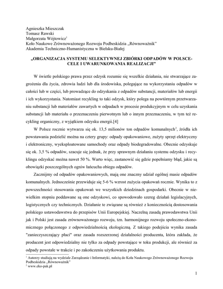 Agnieszka Mieszczak Tomasz Rawski Małgorzata Wójtowicz1 Koło Naukowe Zrównoważonego Rozwoju Podbeskidzia „Równoważnik” Akademia Techniczno-Humanistyczna w Bielsku-Białej „ORGANIZACJA SYSTEMU SELEKTYWNEJ ZBIÓRKI ODPADÓW W POLSCECELE I UWARUNKOWANIA REALIZACJI” W świetle polskiego prawa przez odzysk rozumie się wszelkie działania, nie stwarzające zagrożenia dla życia, zdrowia ludzi lub dla środowiska, polegające na wykorzystaniu odpadów w całości lub w części, lub prowadzące do odzyskania z odpadów substancji, materiałów lub energii i ich wykorzystania. Natomiast recykling to taki odzysk, który polega na powtórnym przetwarzaniu substancji lub materiałów zawartych w odpadach w procesie produkcyjnym w celu uzyskania substancji lub materiału o przeznaczeniu pierwotnym lub o innym przeznaczeniu, w tym też recykling organiczny, z wyjątkiem odzysku energii.[4] W Polsce rocznie wytwarza się ok. 13,5 milionów ton odpadów komunalnych 2, źródła ich powstawania podzielić można na cztery grupy: odpady opakowaniowe, zużyty sprzęt elektryczny i elektroniczny, wyeksploatowane samochody oraz odpady biodegradowalne. Obecnie odzyskuje się ok. 3,5 % odpadów, szacuje się jednak, że przy sprawnym działaniu systemu odzysku i recyklingu odzyskać można nawet 50 %. Warto więc, zastanowić się gdzie popełniamy błąd, jakie są obowiązki poszczególnych ogniw łańcucha obiegu odpadów. Zacznijmy od odpadów opakowaniowych, mają one znaczny udział ogólnej masie odpadów komunalnych. Jednocześnie przewiduje się 5-6 % wzrost zużycia opakowań rocznie. Wynika to z powszechności stosowania opakowań we wszystkich dziedzinach gospodarki. Obecnie w niewielkim stopniu poddawane są one odzyskowi, co spowodowało szereg działań legislacyjnych, logistycznych czy technicznych. Działanie te związane są również z koniecznością dostosowania polskiego ustawodawstwa do przepisów Unii Europejskiej. Naczelną zasadą prawodawstwa Unii jak i Polski jest zasada zrównoważonego rozwoju, tzn. harmonijnego rozwoju społeczno-ekonomicznego połączonego z odpowiedzialnością ekologiczną. Z takiego podejścia wynika zasada "zanieczyszczający płaci" oraz zasada rozszerzonej działalności producenta, która zakłada, że producent jest odpowiedzialny nie tylko za odpady powstające w toku produkcji, ale również za odpady powstałe w trakcie i po zakończeniu użytkowania produktu. 1 Autorzy studiują na wydziale Zarządzanie i Informatyki, należą do Koła Naukowego Zrównoważonego Rozwoju Podbeskidzia „Równoważnik” 2 www.eko-pak.pl 1 W przypadku opakowań i odpadów opakowaniowych zasady te znalazły odzwierciedlenie w dyrektywie Rady i Parlamentu Europejskiego z dnia 20 grudnia 1994 r. w sprawie opakowań i odpadów opakowaniowych. Przekładając te zasady na prawo polskie przyjęto założenie, że obowiązki w zakresie gospodarowania odpadami opakowaniowymi rozłożone są na poszczególnych uczestników "łańcucha opakowaniowego" tzn. producentów opakowań, producentów produktów w opakowaniach (tj. producentów wykorzystujących opakowania do pakowania produktów), handel zarówno hurtowy, jak i detaliczny oraz użytkowników, jak również administrację publiczną. Do podstawowych ustaw określających te obowiązki należą: - ustawa z dnia 11 maja 2001 r. o opakowaniach i odpadach opakowaniowych - ustawa z dnia 11 maja 2001 r. o obowiązkach przedsiębiorców w zakresie gospodarowania niektórymi odpadami oraz o opłacie produktowej i opłacie depozytowej, - ustawa z dnia 13 września 1996 r. o utrzymaniu czystości i porządku w gminach, - ustawa z dnia 27 kwietnia 2001 r. o odpadach, i wiele innych. Zacznijmy od obowiązków producentów i importerów opakowań. Do ich obowiązków należy właściwe projektowanie i wytwarzanie opakowań - masa i objętość opakowań, możliwość wielokrotnego użytku, przydatność na odzysk i recykling, ograniczona zawartość metali ciężkich i innych substancji niebezpiecznych, oznakowanie opakowań - rodzaj materiałów wykorzystanych do produkcji opakowania, możliwość wielokrotnego użytku opakowania, przydatność opakowania do recyklingu (ustawa o opakowaniach... - art. 5, 6). Kolejnym ogniwem są producenci i importerzy produktów w opakowaniach, ich zadaniem jest zapewnienie odzysku, a w szczególności recyklingu odpadów opakowaniowych, osiągnięcie docelowych poziomów odzysku i recyklingu odpadów opakowaniowych (ust. o obowiązkach...). Głównym obowiązkiem sprzedawców produktów w opakowaniach jest przekazywanie użytkownikom informacji w zakresie dostępnych systemów zwrotu, zbierania i odzysku, w tym recyklingu, właściwego postępowania z odpadami opakowaniowymi, znaczenia oznaczeń stosowanych na opakowaniach (ustawa o opakowaniach ... - art. 12). Użytkownicy produktów w opakowaniach ( w zakresie użytkowania środków niebezpiecznych) zobowiązani są do zwrotu sprzedawcy opakowań wielokrotnego użytku i odpadów opakowaniowych (ustawa o opakowaniach ... - art. 17). Obowiązkiem gminnej administracji samorządowej (organ wykonawczy, rada gminy) jest przygotowanie i uchwalenie, a następnie aktualizacja gminnego planu gospodarki odpadami jako elementu gminnego programu ochrony środowiska - również w zakresie odpadów opako2 waniowych, przygotowywanie sprawozdań z realizacji gminnego planu gospodarki odpadami (ustawa o odpadach), organizowanie selektywnego zbierania, segregacji i magazynowania odpadów komunalnych (ustawa o utrzymaniu ...-art. 3), obowiązki te są podobne dla poszczególnych szczebli administracji publicznej. W analizie pominięte zostały kwestie formalne, takie jak wydawanie zezwoleń czy też składanie raportów. Ministerstwo Środowiska poinformowało, że w roku 2006 poziom odzysku dla wszystkich odpadów opakowaniowych został ustalony, zgodnie z rozp. Ministra Środowiska z dnia 24 maja 2005 r. w sprawie rocznych poziomów odzysku i re