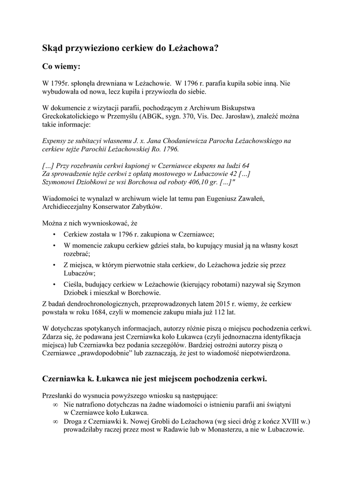 Skąd przywieziono cerkiew do Leżachowa? Co wiemy: W 1795r. spłonęła drewniana w Leżachowie. W 1796 r. parafia kupiła sobie inną. Nie wybudowała od nowa, lecz kupiła i przywiozła do siebie. W dokumencie z wizytacji parafii, pochodzącym z Archiwum Biskupstwa Greckokatolickiego w Przemyślu (ABGK, sygn. 370, Vis. Dec. Jarosław), znaleźć można takie informacje: Expensy ze subitacyi własnemu J. x. Jana Chodaniewicza Parocha Leżachowskiego na cerkiew tejże Parochii Leżachowskiej Ro. 1796. […] Przy rozebraniu cerkwi kupionej w Czerniawce ekspens na ludzi 64 Za sprowadzenie tejże cerkwi z opłatą mostowego w Lubaczowie 42 […] Szymonowi Dziobkowi ze wsi Borchowa od roboty 406,10 gr. […]" Wiadomości te wynalazł w archiwum wiele lat temu pan Eugeniusz Zawałeń, Archidiecezjalny Konserwator Zabytków. Można z nich wywnioskować, że • Cerkiew została w 1796 r. zakupiona w Czerniawce; • W momencie zakupu cerkiew gdzieś stała, bo kupujący musiał ją na własny koszt rozebrać; • Z miejsca, w którym pierwotnie stała cerkiew, do Leżachowa jedzie się przez Lubaczów; • Cieśla, budujący cerkiew w Leżachowie (kierujący robotami) nazywał się Szymon Dziobek i mieszkał w Borchowie. Z badań dendrochronologicznych, przeprowadzonych latem 2015 r. wiemy, że cerkiew powstała w roku 1684, czyli w momencie zakupu miała już 112 lat. W dotychczas spotykanych informacjach, autorzy różnie piszą o miejscu pochodzenia cerkwi. Zdarza się, że podawana jest Czerniawka koło Łukawca (czyli jednoznaczna identyfikacja miejsca) lub Czerniawka bez podania szczegółów. Bardziej ostrożni autorzy piszą o Czerniawce „prawdopodobnie” lub zaznaczają, że jest to wiadomość niepotwierdzona. Czerniawka k. Łukawca nie jest miejscem pochodzenia cerkwi. Przesłanki do wysnucia powyższego wniosku są następujące: • Nie natrafiono dotychczas na żadne wiadomości o istnieniu parafii ani świątyni w Czerniawce koło Łukawca. • Droga z Czerniawki k. Nowej Grobli do Leżachowa (wg sieci dróg z kończ XVIII w.) prowadziłaby raczej przez most w Radawie lub w Monasterzu, a nie w Lubaczowie. Analiza źródeł, rozwiązanie zagwozdki. Co mówią mapy. Temat pochodzenia leżachowskiej cerkwi został przedstawiony na forum Grupy Turystycznej Roztocze (GTR) przez dociekliwego Wojtka Pysz, gdzie szybko wzbudził zainteresowanie i szybko znalazł (?) rozwiązanie. Pierwszym krokiem było przypuszczenie, że chodzi o inną Czerniawkę (nie tę k. Łukawca) a drugim krokiem, wytypowanie okolic Hruszowa, jako tej właściwej Czerniawki. Wkrótce pojawiają się bardziej konkretne informacje. Bardzo szybko jeden z uczestników forum, Stanisław Baran, dostrzegł na mapie topograficznej Galicji z lat 1779-1783 (tzw. mapa Miega), że w miejscu opisanym Czarna łąka zaznaczona jest świątynia. Widać tu małą osadę w pobliżu Hruszowa, a nieco dalej od Niemirowa. Rys. 1. Na fragmencie mapy, w lewym, dolnym rogu Hruszów, po prawej stronie Niemirów a strzałką zaznaczona Czarna łąka. Rys. 2. Na powiększeniu widoczny napis Czarna łąka i oznaczenie świątyni. Według legendy mapy, tak oznaczane są kościoły otoczone murami (Kirchen mit Mauern umgeben). Na mapach późniejszych, w tym samym miejscu, ani jego pobliżu nie ma już zaznaczonej świątyni. Na mapie z lat 1806-1869 nie ma już Czarnej łąki, ale jest Czerniawka. W końcu XIX w. pojawia się tam karczma (WH = Wirtshaus). Na mapach WIG z lat 30. XX w. Czerniawka jest przysiółkiem o 15 domach a na mapach współczesnych jest tam tylko las. Miejsce to położne jest kilkaset metrów na wschód od obecnej granicy państwowej PL-UA w kierunku nieczynnej kopalni siarki koło Niemirowia. W ten sposób mamy dość wiarygodne potwierdzenie faktu, że miejscowości (przysiółku) zwanej Czerniawka, była kiedyś świątynia, a na pocz. XIX w. już jej nie było. Droga z tej Czerniawki do Leżachowa prowadzi przez most na Lubaczówce w Lubaczowie. Potwierdzenia ze źródeł pisanych. 1. W 1621 roku bracia: Michał, Mikołaj, Wasyl, Daniło, Samuel i Ksenofont Lityńscy wydali dla o. Antoniego przywilej na założenie w hruszowskim lesie, nad rzeczką Czerniawką, monasteru św. Trójcy. Pięć lat później, w 1626 roku, zgromadzenie to zostało przyłączone do erygowanego właśnie klasztoru bazyliańskiego, położonego na terenie ówczesnego hruszowskiego przysiółka Szczepłoty. Na nowym miejscu monaster znacznie się rozwinął. (Janusz Mazur, Muzeum Kresów w Lubaczowie). 2. Niegdyś stał tu klasztor bazyliański, założony w r. 1626 przez Adama Lityńskiego. W akcie fundacyjnym oświadcza on „iż fundując monaster na czernce wyzn. religii greckiej, na gruncie swym dziedzicznym we wsi Hruszowie, na przysiółku rzeczonym Szczepłoty,[....] (Słownik geograficzny Królestwa Polskiego i innych krajów słowiańskich, s. 846-847.) Po założeniu monasteru wybudowano prawdopodobnie cerkiew. Gdy w 1926 r. mnisi wyprowadzili się do monasteru w Szczepłotach, budynek cerkwi mógł się stać niepotrzebny. Cerkiew w Czerniawce mogła też być wykorzystywana, a sprzedano ją dopiero po kasacie klasztoru, która miała miejsce w 1788 r.