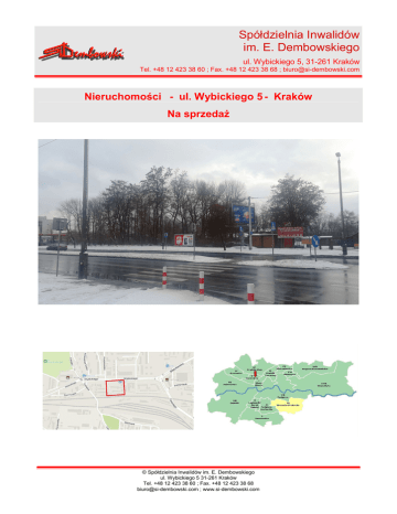 Spółdzielnia Inwalidów im. E. Dembowskiego ul. Wybickiego 5, 31-261 Kraków Tel. +48 12 423 38 60 ; Fax. +48 12 423 38 68 ; [email protected] Nieruchomości - ul. Wybickiego 5 - Kraków Na sprzedaż © Spółdzielnia Inwalidów im. E. Dembowskiego ul. Wybickiego 5 31-261 Kraków Tel. +48 12 423 38 60 ; Fax. +48 12 423 38 68 [email protected] ; www.si-dembowski.com 1. Przedmiot sprzedaży 1. Nieruchomość nr 1: • Prawo użytkowania wieczystego nieruchomości gruntowej zabudowanej budynkiem biurowym, stanowiącej działkę nr 361/2, położoną przy ul. Wybickiego 5 w Krakowie • Prawo użytkowania wieczystego nieruchomości gruntowej zabudowanej budynkami i budowlami przemysłowymi stanowiącej działkę nr 361/3, położoną przy ul. Wybickiego 5 w Krakowie • Prawo użytkowania wieczystego nieruchomości gruntowej zabudowanej budynkami i budowlami przemysłowymi, stanowiącej działkę nr 361/5, położonej przy ul. Wybickiego 5 w Krakowie 2. Nieruchomość nr 2: • Prawo użytkowania wieczystego nieruchomości gruntowej zabudowanej na podstawie umowy dzierżawy stacją paliw PKN ORLEN, stanowiącej działkę nr 361/4, położoną przy ul. Wybickiego 3E w Krakowie 2. Opis nieruchomości Obie nieruchomości położone są w dzielnicy Krowodrza w centralnej części Krakowa. Zlokalizowane są przy ulicy Wybickiego oraz sąsiadują ze sobą bezpośrednio. Nieruchomości znajdują się bliskiej odległości Starego Miasta. Dojazd do nieruchomości odbywa się z ulicy Wybickiego. Dojazd do nieruchomości komunikacją publiczną możliwy jest z wykorzystaniem tramwajów, autobusów oraz PKP. W odległości 800 m znajduje się przystanek PKP Kraków – Łobzów umożliwiający dojazd do Lotniska Balice w 12 minut. Otoczenie nieruchomości stanowi zabudowa z funkcją mieszkalno – usługową. W pobliżu znajdują się liczne sklepy oraz galerie handlowe. 3. Dane historyczne Od roku 1961 cały teren stanowiący przedmiot sprzedaży, wykorzystywany był pod działalność produkcyjną i usługową realizowaną przez Spółdzielnię. Do działalności tej zaliczało się m. in.: obróbka skrawaniem, przetwórstwo tworzyw sztucznych, produkcja cięgieł giętkich dla przemysłu motoryzacyjnego, montaż wyrobów metalowych, wykonywanie pokryć galwanicznych. Obecnie teren Nieruchomości nr 1 obejmujący działki 361/2, 361/3, 361/5 wykorzystywany jest nadal w ramach prowadzonej działalności produkcyjnej Spółdzielni. Nieruchomość nr 2 stanowiącą działkę 361/4 wydzierżawiono spółce PKN Orlen i w 2013 została zabudowana stacją paliw. Na działce nr 361/5 znajdują się pozostałości fortu rdzenia N10 „Prądnik Biały”, który stanowił standardowy fort obrony bliskiej nowego rdzenia „Twierdzy Kraków”. Pozostałości te obejmują budynek koszarowy na planie prostokąta o wymiarach około 40 x 8 m umiejscowiony w centralnej części działki oraz relikty schronu pogotowia (na zdjęciu w punkcie 8 zaznaczone kolorem niebieskim). Zabytki te objęte są ochroną konserwatorską Miejskiego Konserwatora Zabytków Miasta Krakowa. W listopadzie 2016 roku Miejski Konserwator Zabytków wydał zalecenia konserwatorskie dotyczące zagospodarowania działki 361/5 (do wglądu) wyłączając z zabudowy część działki na północ od fortu N10 z zachowaniem reliktów schronu pogotowia. © Spółdzielnia Inwalidów im. E. Dembowskiego ul. Wybickiego 5 31-261 Kraków Tel. +48 12 423 38 60 ; Fax. +48 12 423 38 68 [email protected] ; www.si-dembowski.com 4. Stan prawny nieruchomości Nieruchomość nr 1 objęta jest: 1. Księgą Wieczystą nr KR1P/00215957/8 prowadzoną przez IV Wydział Ksiąg Wieczystych Sądu Rejonowego dla Krakowa – Podgórza. DZIAŁ I-0 „Oznaczenie nieruchomości” Numer działki: 361/2 Obręb: 44 Położenie: województwo - małopolskie, powiat - M. Kraków, gmina – Kraków M., miasto – Kraków, dzielnica - Krowodrza obszar: 264 m2 Numer działki: 361/3 Obręb: 44 Położenie: województwo - małopolskie, powiat - M. Kraków, gmina – Kraków M., miasto – Kraków, dzielnica - Krowodrza obszar: 3871 m2 DZIAŁ I – SP – „Spis spraw związanych z własnością”: Prawo użytkowania wieczystego, Okres użytkowania: 2034-03-30 DZIAŁ II – „Własność” Właściciel: Gmina Kraków Użytkownik wieczysty: Spółdzielnia Inwalidów im. E. Dembowskiego z siedzibą w Krakowie DZIAŁ III – „Prawa roszczenia i ograniczenia” Brak wpisów DZIAŁ IV – „Hipoteki” Rodzaj hipoteki – hipoteka umowna Suma: 750000,00 zł Złożono wniosek o wykreślenie hipoteki umownej. 2. Księgą Wieczystą nr KR1P/00181772/9 prowadzoną przez IV Wydział Ksiąg Wieczystych Sądu Rejonowego dla Krakowa – Podgórza. DZIAŁ I-0 „Oznaczenie nieruchomości” Numer działki: 361/5 Obręb: 44 Położenie: województwo - małopolskie, powiat - M. Kraków, gmina – Kraków M., miasto – Kraków, dzielnica - Krowodrza obszar: 1,1833 ha DZIAŁ I – SP – „Spis spraw związanych z własnością”: Prawo użytkowania wieczystego, Okres użytkowania: 2034-03-30 © Spółdzielnia Inwalidów im. E. Dembowskiego ul. Wybickiego 5 31-261 Kraków Tel. +48 12 423 38 60 ; Fax. +48 12 423 38 68 [email protected] ; www.si-dembowski.com DZIAŁ II – „Własność” Właściciel: Gmina Kraków Użytkownik wieczysty: Spółdzielnia Inwalidów im. E. Dembowskiego z siedzibą w Krakowie DZIAŁ III – „Prawa roszczenia i ograniczenia” Brak wpisów DZIAŁ IV – „Hipoteki” Brak wpisów Nieruchomość nr 2 Księgą Wieczystą nr KR1P/00366593/1 prowadzoną przez IV Wydział Ksiąg Wieczystych Sądu Rejonowego dla Krakowa – Podgórza. DZIAŁ I-0 „Oznaczenie nieruchomości” Numer działki: 361/4 Obręb: 44 Położenie: województwo - małopolskie, powiat - M. Kraków, gmina – Kraków M., miasto – Kraków, dzielnica - Krowodrza obszar: 0,2583 ha DZIAŁ I – SP – „Spis spraw związanych z własnością”: Prawo użytkowania wieczystego, Okres użytkowania:
