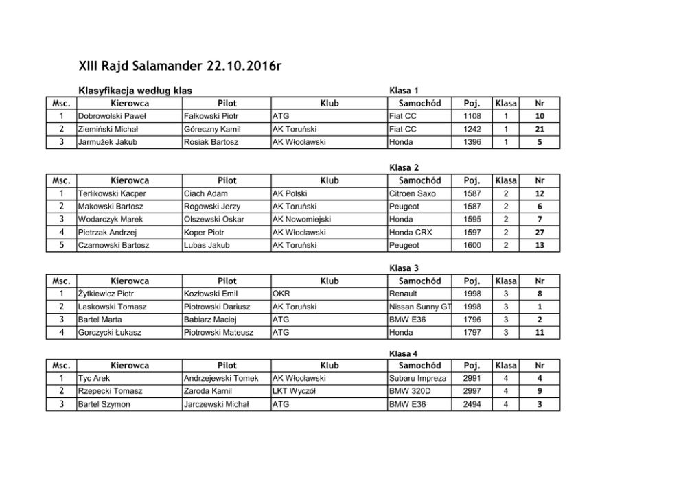 XIII Rajd Salamander 22.10.2016r Klasyfikacja według klas Msc. Kierowca 1 Dobrowolski Paweł 2 Ziemiński Michał Jarmużek Jakub 3 Msc. 1 2 3 4 5 Msc. 1 2 3 4 Kierowca Pilot Klub Klasa 1 Samochód Poj. Klasa Fałkowski Piotr ATG Fiat CC 1108 1 Góreczny Kamil AK Toruński Fiat CC 1242 1 Rosiak Bartosz AK Włocławski Honda 1396 1 Klasa 2 Samochód Poj. Klasa Pilot Klub Terlikowski Kacper Ciach Adam AK Polski Citroen Saxo 1587 2 Makowski Bartosz Rogowski Jerzy AK Toruński Peugeot 1587 2 Wodarczyk Marek Olszewski Oskar AK Nowomiejski Honda 1595 2 Pietrzak Andrzej Koper Piotr AK Włocławski Honda CRX 1597 2 Czarnowski Bartosz Lubas Jakub AK Toruński Peugeot 1600 2 Klasa 3 Samochód Poj. Klasa Kierowca Pilot Klub Żytkiewicz Piotr Kozłowski Emil OKR Renault 1998 3 Laskowski Tomasz Piotrowski Dariusz AK Toruński Nissan Sunny GTI 1998 3 Bartel Marta Babiarz Maciej ATG BMW E36 1796 3 Gorczycki Łukasz Piotrowski Mateusz ATG Honda 1797 3 Nr 10 21 5 Nr 12 6 7 27 13 Nr 8 1 2 11 Klasa 4 Msc. Kierowca Tyc Arek 1 2 Rzepecki Tomasz 3 Bartel Szymon Samochód Poj. Klasa Andrzejewski Tomek Pilot AK Włocławski Klub Subaru Impreza 2991 4 Zaroda Kamil LKT Wyczół BMW 320D 2997 4 Jarczewski Michał ATG BMW E36 2494 4 Nr 4 9 3