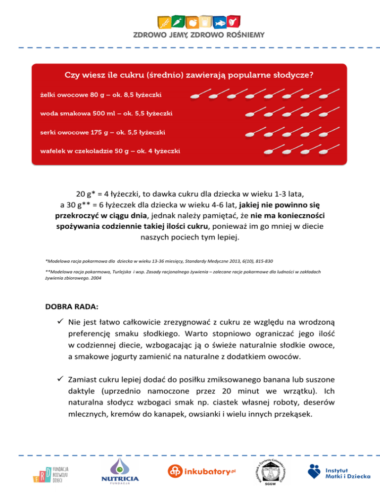 20 g* = 4 łyżeczki, to dawka cukru dla dziecka w wieku 1-3 lata, a 30 g** = 6 łyżeczek dla dziecka w wieku 4-6 lat, jakiej nie powinno się przekroczyć w ciągu dnia, jednak należy pamiętać, że nie ma konieczności spożywania codziennie takiej ilości cukru, ponieważ im go mniej w diecie naszych pociech tym lepiej. *Modelowa racja pokarmowa dla dziecka w wieku 13-36 miesięcy, Standardy Medyczne 2013, 6(10), 815-830 **Modelowa racja pokarmowa, Turlejska i wsp. Zasady racjonalnego żywienia – zalecane racje pokarmowe dla ludności w zakładach żywienia zbiorowego. 2004 DOBRA RADA: Nie jest łatwo całkowicie zrezygnować z cukru ze względu na wrodzoną preferencję smaku słodkiego. Warto stopniowo ograniczać jego ilość w codziennej diecie, wzbogacając ją o świeże naturalnie słodkie owoce, a smakowe jogurty zamienić na naturalne z dodatkiem owoców. Zamiast cukru lepiej dodać do posiłku zmiksowanego banana lub suszone daktyle (uprzednio namoczone przez 20 minut we wrzątku). Ich naturalna słodycz wzbogaci smak np. ciastek własnej roboty, deserów mlecznych, kremów do kanapek, owsianki i wielu innych przekąsek. PRZEPISY NA WARTOŚCIOWE SŁODYCZE DLA DZIECI: Kakaowy krem do pieczywa (mała miseczka ok.260 g → 8/9 porcji): • daktyle (50 g) • 1 awokado • 1 banan • 1 łyżka kakao (10 g) Sposób przygotowania: Daktyle moczymy przez 20 minut we wrzątku. Owoce obieramy, dodajemy kakao i całość miksujemy na gładki krem. Granola jabłkowa (ok.300 g → 10 porcji): • 2 szklanki płatków owsianych (220 g) • 3 łyżki ziaren słonecznika (30 g) • 3 łyżki wiórków kokosowych (18 g) • 2 jabłka (300 g) • 2 łyżeczki cynamonu (8 g) • *opcjonalnie – orzechy lub rodzynki (ok. 4 łyżek – 60 g) Sposób przygotowania: Mieszamy w misce płatki, cynamon, wiórki kokosowe i nasiona słonecznika. Jabłka miksujemy blenderem i dodajemy do reszty składników. Posklejaną masę przekładamy na blaszkę wyłożona papierem do pieczenia i pieczemy w temp. 160⁰C przez ok. 30-40 minut aż będzie chrupka, mieszając co 10 minut. Granolę przechowujemy w szczelnie zamkniętym słoiku. Ciastka bananowe 3-składnikowe (ok.15 sztuk): • 2 szklanki płatków owsianych (220 g) • 0,5 szklanki mleka (120 ml) • 2 większe, dojrzałe banany • *ewentualne 1 płaska łyżeczka sody • **odrobina tłuszczu do wysmarowania papieru do pieczenia Sposób przygotowania: Wszystkie składniki miksujemy. Odstawiamy na kilka minut. Ciasto układamy dużą łyżką na blaszce wyłożonej papierem do pieczenia. Pieczemy w temp. 180⁰C (opiekanie góra – dół) przez ok.15 minut. Po tym czasie odwracamy na drugą stronę i dopiekamy jeszcze przez 5 minut. Budyń jaglany (2 porcje): • ⅓ szklanki kaszy jaglanej (60 g) • 1 ½ szklanki wody (360 ml) • szczypta soli • ½ szklanki mleka (120 ml) • miód do smaku • 4 jabłka (600 g) • ⅓ szklanki płatków migdałów/kokos (ok. 30 g) Sposób przygotowania: Jabłka obieramy, kroimy i dusimy pod przykryciem ok.5 minut. Migdały prażymy na patelni. Gotujemy osoloną kaszę, aż się całkiem rozgotuje. Pod koniec gotowania dodajemy mleko i miód. Całość zdejmujemy z kuchenki i miksujemy na gładką masę. Nakładamy do miseczek, dodajemy łyżkę jabłek i migdały. Kisiel owocowy (2 porcje): • herbata owocowa (200 ml) • ½ litra wody • 2 łyżeczki mąki ziemniaczanej (24 g) • odrobina miodu do smaku • świeże owoce (najlepiej sezonowe) Sposób przygotowania: Gotujemy herbatę na wolnym ogniu, powoli dodając miód z mąką, tak aby napar zgęstniał. Zdejmujemy z ognia i dodajemy świeże owoce. Praliny z kaszy jaglanej (ok.40 pralin): • 2 szklanki ugotowanej kaszy jaglanej (380 g ugotowanej → ok.125 g suchej przed ugotowaniem) • 1 szklanka rodzynek (140 g) • 5 daktyli (25 g) • 2 łyżki posiekanych orzechów włoskich (20 g) Dodatkowo do obtoczenia pralin: • wiórki kokosowe • mielone orzechy • kakao • płatki migdałowe Sposób przygotowania: Rodzynki i daktyle zalewamy 2 szklankami wrzątku, odstawiamy na 15 minut, po czym odsączamy. Odsączone owoce miksujemy, dodajemy ugotowaną kaszę jaglaną i jeszcze raz krótko miksujemy do połączenia składników. Pozostawiamy do ostudzenia. Na talerzyki wysypujemy wiórki kokosowe, kakao, mielone orzechy. Z masy formujemy kulki wielkości orzecha włoskiego i obtaczamy w przygotowanych dodatkach. Podajemy od razu lub przechowujemy w lodówce, maksymalnie do 3 dni.