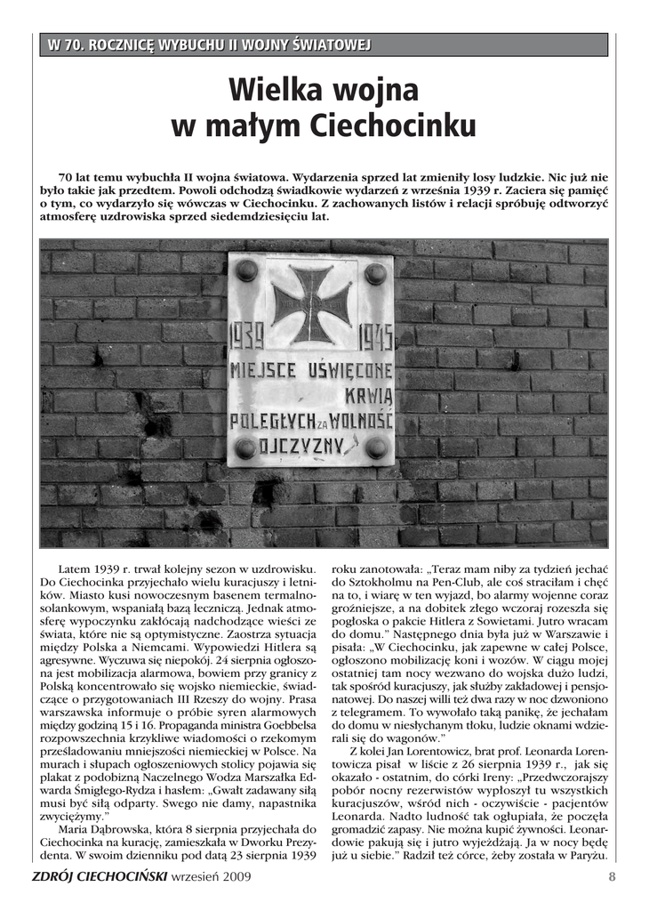W 70. ROCZNIC¢ WYBUCHU II WOJNY ÂWIATOWEJ Wielka wojna w ma∏ym Ciechocinku 70 lat temu wybuch∏a II wojna Êwiatowa. Wydarzenia sprzed lat zmieni∏y losy ludzkie. Nic ju˝ nie by∏o takie jak przedtem. Powoli odchodzà Êwiadkowie wydarzeƒ z wrzeÊnia 1939 r. Zaciera si´ pami´ç o tym, co wydarzy∏o si´ wówczas w Ciechocinku. Z zachowanych listów i relacji spróbuj´ odtworzyç atmosfer´ uzdrowiska sprzed siedemdziesi´ciu lat. Latem 1939 r. trwa∏ kolejny sezon w uzdrowisku. Do Ciechocinka przyjecha∏o wielu kuracjuszy i letników. Miasto kusi nowoczesnym basenem termalnosolankowym, wspania∏à bazà leczniczà. Jednak atmosfer´ wypoczynku zak∏ócajà nadchodzàce wieÊci ze Êwiata, które nie sà optymistyczne. Zaostrza sytuacja mi´dzy Polska a Niemcami. Wypowiedzi Hitlera sà agresywne. Wyczuwa si´ niepokój. 24 sierpnia og∏oszona jest mobilizacja alarmowa, bowiem przy granicy z Polskà koncentrowa∏o si´ wojsko niemieckie, Êwiadczàce o przygotowaniach III Rzeszy do wojny. Prasa warszawska informuje o próbie syren alarmowych mi´dzy godzinà 15 i 16. Propaganda ministra Goebbelsa rozpowszechnia krzykliwe wiadomoÊci o rzekomym przeÊladowaniu mniejszoÊci niemieckiej w Polsce. Na murach i s∏upach og∏oszeniowych stolicy pojawia si´ plakat z podobiznà Naczelnego Wodza Marsza∏ka Edwarda Âmig∏ego-Rydza i has∏em: „Gwa∏t zadawany si∏à musi byç si∏à odparty. Swego nie damy, napastnika zwyci´˝ymy.” Maria Dàbrowska, która 8 sierpnia przyjecha∏a do Ciechocinka na kuracj´, zamieszka∏a w Dworku Prezydenta. W swoim dzienniku pod datà 23 sierpnia 1939 ZDRÓJ CIECHOCI¡SKI wrzesieƒ 2009 roku zanotowa∏a: „Teraz mam niby za tydzieƒ jechaç do Sztokholmu na Pen-Club, ale coÊ straci∏am i ch´ç na to, i wiar´ w ten wyjazd, bo alarmy wojenne coraz groêniejsze, a na dobitek z∏ego wczoraj rozesz∏a si´ pog∏oska o pakcie Hitlera z Sowietami. Jutro wracam do domu.” Nast´pnego dnia by∏a ju˝ w Warszawie i pisa∏a: „W Ciechocinku, jak zapewne w ca∏ej Polsce, og∏oszono mobilizacj´ koni i wozów. W ciàgu mojej ostatniej tam nocy wezwano do wojska du˝o ludzi, tak spoÊród kuracjuszy, jak s∏u˝by zak∏adowej i pensjonatowej. Do naszej willi te˝ dwa razy w noc dzwoniono z telegramem. To wywo∏a∏o takà panik´, ˝e jecha∏am do domu w nies∏ychanym t∏oku, ludzie oknami wdzierali si´ do wagonów.” Z kolei Jan Lorentowicz, brat prof. Leonarda Lorentowicza pisa∏ w liÊcie z 26 sierpnia 1939 r., jak si´ okaza∏o - ostatnim, do córki Ireny: „Przedwczorajszy pobór nocny rezerwistów wyp∏oszy∏ tu wszystkich kuracjuszów, wÊród nich - oczywiÊcie - pacjentów Leonarda. Nadto ludnoÊç tak og∏upia∏a, ˝e pocz´∏a gromadziç zapasy. Nie mo˝na kupiç ˝ywnoÊci. Leonardowie pakujà si´ i jutro wyje˝d˝ajà. Ja w nocy b´d´ ju˝ u siebie.” Radzi∏ te˝ córce, ˝eby zosta∏a w Pary˝u. 8 30 sierpnia 1939 r. prezydent RP Ignacy MoÊcicki og∏asza dekret o mobilizacji powszechnej. Pierwszym dniem mobilizacji wyznaczono czwartek, 31 sierpnia. WÊród goÊci wyczuwa si´ niepokój. Niektórzy kuracjusze przerywajà swój pobyt w uzdrowisku i wyje˝d˝ajà w poÊpiechu do swoich domów. Ci, którzy zostali, 1 wrzeÊnia, kiedy wiadomo ju˝, ˝e Niemcy zaatakowali Polsk´, przera˝eni opuszczajà Ciechocinek. Jak wspomina∏ Eustachiusz Drobniewski: „Wyje˝d˝ali, czym si´ da: doro˝kami, furmankami: p∏acà ogromne pieniàdze, by jak najszybciej znaleêç si´ w domu, po∏àczyç z bliskimi. Pociàgi nie kursujà ju˝ regularnie. Liga Obrony Powietrznej Paƒstwa (LOPP) zaleca oklejanie paskami papieru szyb w oknach, co ma chroniç je przed wypadaniem w czasie bombardowania. Kopane sà rowy przeciwlotnicze na trawnikach ko∏o ∏azienek. Ju˝ pierwszego dnia wojny 1939 roku o Êwicie, kiedy samoloty nieprzyjacielskie zrzuci∏y w pobli˝u Ciechocinka pierwsze bomby, wiadomym si´ sta∏o, ˝e hitlerowcy nikogo i niczego nie b´dà oszcz´dzaç. Niemcy zajmujà Ciechocinek. Panujà terror i Êmierç. Trwajà aresztowania i rozstrzelania, padajà ofiary na warzelni soli, przy hali targowej, przy Szkole Powszechnej (obecnie Podstawowej), w pobliskim lesie, na ulicach prowadzone sà tzw. „∏apanki”, a zatrzymani w nich wywo˝eni sà do obozów koncentracyjnych i na przymusowe roboty do Niemiec. Wysiedla si´ Polaków z ich domów, pozbawia mienia. Pierwsze du˝e wysiedlenie mieszkaƒców Ciechocinka z ich rodzinnych siedlisk ma miejsce 11 grudnia 1939 r. Ciechociniacy w bydl´cych wagonach transportowani sà do S´dziszowa ko∏o J´drzejowa. Na d∏ugie lata okupacji Ciechocinek staje si´ miastem uzdrowiskowym dla Niemców. Nazywa si´ Hermannsbad.” („Zdrój Ciechociƒski”, wrzesieƒ 1999 r.) Z kolei jedna z mieszkanek ul. Narutowicza wspomina: „Do III klasy gimnazjum w roku szkolnym 1939/40 ju˝ nie posz∏am. 1 wrzeÊnia 1939 roku to poczàtek wojny z Niemcami. Ale w∏aÊciwie rozpocz´∏a ju˝ 24 sierpnia, to jest od dnia, w którym zosta∏a og∏oszona mobilizacja pierwsza ludzi, koni, wozów, samochodów i motocykli. 31 sierpnia og∏oszono mobilizacj´ powszechnà. Wojn´ ju˝ sygnalizujà ze wszystkich stron Polski. Nasza szko∏a podstawowa zosta∏a zamkni´ta do odwo∏ania. Sezon letni zosta∏ przerwany, kuracjusze z poÊpiechem wyje˝d˝ajà do domów w obawie, ˝e zostanie przerwana komunikacja i nie dostanà si´ do swoich miast. Ju˝ 1 wrzeÊnia zwo˝à l˝ej rannych do Ciechocinka. 2 wrzeÊnia zosta∏y zrzucone bomby w Ciechocinku nad Wis∏à. 4 wrzeÊnia bombardowany by∏ Aleksandrów, tory kolejowe zosta∏y zepsute. W wielu punktach Ciechocinka wykopano schrony. Wszystkie urz´dy sà ju˝ nieczynne. Urz´dnicy z rodzinami wyjechali, bojàc si´ Niemców. W Êlad za nimi wyjecha∏o du˝o ciechociniaków. Inni po prostu pieszo uciekali, ciàgnàc na wózkach dobytek i dzieci. Ma∏o osób zosta∏o, wÊród nich ja z matkà. Drogà w pobli˝u Ciechocin