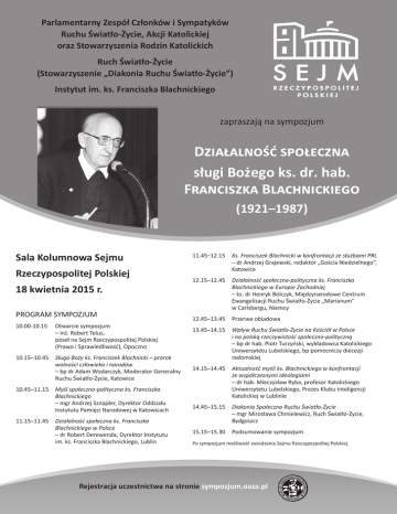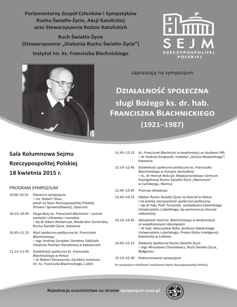 Parlamentarny Zespół Członków i Sympatyków Ruchu Światło-Życie, Akcji Katolickiej oraz Stowarzyszenia Rodzin Katolickich Ruch Światło-Życie (Stowarzyszenie „Diakonia Ruchu Światło-Życie”) Instytut im. ks. Franciszka Blachnickiego zapraszają na sympozjum Działalność społeczna sługi Bożego ks. dr. hab. Franciszka Blachnickiego (1921–1987) Sala Kolumnowa Sejmu Rzeczypospolitej Polskiej 18 kwietnia 2015 r. PROGRAM SYMPOZJUM 10.00-10.15 Otwarcie sympozjum – inż. Robert Telus, poseł na Sejm Rzeczypospolitej Polskiej (Prawo i Sprawiedliwość), Opoczno 10.15–10.45 Sługa Boży ks. Franciszek Blachnicki – prorok wolności człowieka i narodów – bp dr Adam Wodarczyk, Moderator Generalny Ruchu Światło-Życie, Katowice 10.45–11.15 Myśl społeczno-polityczna ks. Franciszka Blachnickiego – mgr Andrzej Sznajder, Dyrektor Oddziału Instytutu Pamięci Narodowej w Katowicach 11.15–11.45 Działalność społeczna ks. Franciszka Blachnickiego w Polsce – dr Robert Derewenda, Dyrektor Instytutu im. ks. Franciszka Blachnickiego, Lublin 11.45–12.15 Ks. Franciszek Blachnicki w konfrontacji ze służbami PRL – dr Andrzej Grajewski, redaktor „Gościa Niedzielnego”, Katowice 12.15–12.45 Działalność społeczno-polityczna ks. Franciszka Blachnickiego w Europie Zachodniej – ks. dr Henryk Bolczyk, Międzynarodowe Centrum Ewangelizacji Ruchu Światło-Życie „Marianum” w Carlsbergu, Niemcy 12.45–13.45 Przerwa obiadowa 13.45–14.15 Wpływ Ruchu Światło-Życie na Kościół w Polsce i na polską rzeczywistość społeczno-polityczną – bp dr hab. Piotr Turzyński, wykładowca Katolickiego Uniwersytetu Lubelskiego, bp pomocniczy diecezji radomskiej 14.15–14.45 Aktualność myśli ks. Blachnickiego w konfrontacji ze współczesnymi ideologiami – dr hab. Mieczysław Ryba, profesor Katolickiego Uniwersytetu Lubelskiego, Prezes Klubu Inteligencji Katolickiej w Lublinie 14.45–15.15 Diakonia Społeczna Ruchu Światło-Życie – mgr Mirosława Chmielewicz, Ruch Światło-Życie, Bydgoszcz 15.15–15.30 Podsumowanie sympozjum Po sympozjum możliwość zwiedzania Sejmu Rzeczypospolitej Polskiej. Rejestracja uczestnictwa na stronie sympozjum.oaza.pl