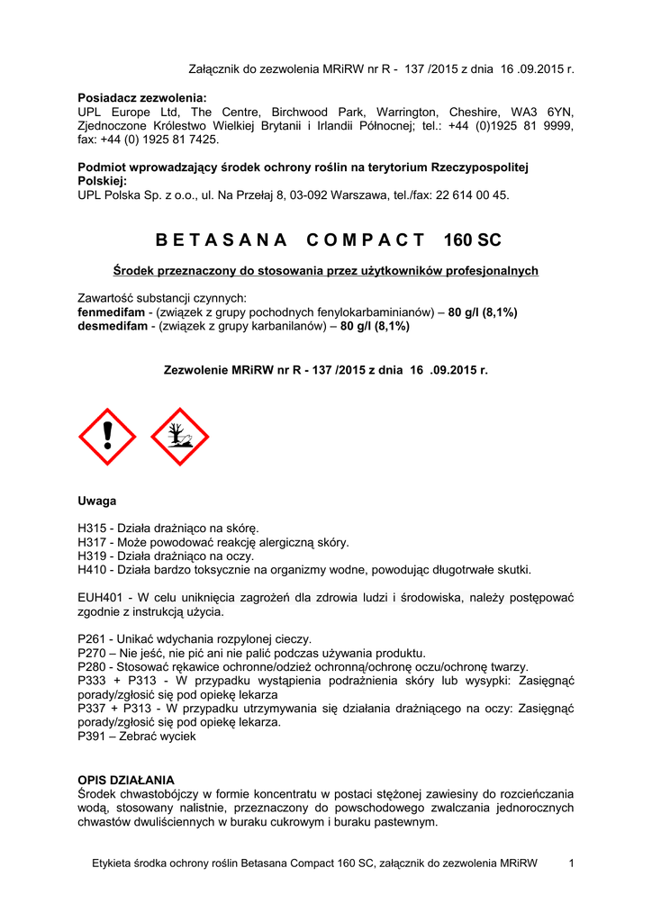 Załącznik do zezwolenia MRiRW nr R - 137 /2015 z dnia 16 .09.2015 r. Posiadacz zezwolenia: UPL Europe Ltd, The Centre, Birchwood Park, Warrington, Cheshire, WA3 6YN, Zjednoczone Królestwo Wielkiej Brytanii i Irlandii Północnej; tel.: +44 (0)1925 81 9999, fax: +44 (0) 1925 81 7425. Podmiot wprowadzający środek ochrony roślin na terytorium Rzeczypospolitej Polskiej: UPL Polska Sp. z o.o., ul. Na Przełaj 8, 03-092 Warszawa, tel./fax: 22 614 00 45. BETASANA COMPACT 160 SC Środek przeznaczony do stosowania przez użytkowników profesjonalnych Zawartość substancji czynnych: fenmedifam - (związek z grupy pochodnych fenylokarbaminianów) – 80 g/l (8,1%) desmedifam - (związek z grupy karbanilanów) – 80 g/l (8,1%) Zezwolenie MRiRW nr R - 137 /2015 z dnia 16 .09.2015 r. Uwaga H315 - Działa drażniąco na skórę. H317 - Może powodować reakcję alergiczną skóry. H319 - Działa drażniąco na oczy. H410 - Działa bardzo toksycznie na organizmy wodne, powodując długotrwałe skutki. EUH401 - W celu uniknięcia zagrożeń dla zdrowia ludzi i środowiska, należy postępować zgodnie z instrukcją użycia. P261 - Unikać wdychania rozpylonej cieczy. P270 – Nie jeść, nie pić ani nie palić podczas używania produktu. P280 - Stosować rękawice ochronne/odzież ochronną/ochronę oczu/ochronę twarzy. P333 + P313 - W przypadku wystąpienia podrażnienia skóry lub wysypki: Zasięgnąć porady/zgłosić się pod opiekę lekarza P337 + P313 - W przypadku utrzymywania się działania drażniącego na oczy: Zasięgnąć porady/zgłosić się pod opiekę lekarza. P391 – Zebrać wyciek OPIS DZIAŁANIA Środek chwastobójczy w formie koncentratu w postaci stężonej zawiesiny do rozcieńczania wodą, stosowany nalistnie, przeznaczony do powschodowego zwalczania jednorocznych chwastów dwuliściennych w buraku cukrowym i buraku pastewnym. Etykieta środka ochrony roślin Betasana Compact 160 SC, załącznik do zezwolenia MRiRW 1 Środek pobierany jest przez liście chwastów. Najskuteczniej zwalcza chwasty znajdujące się w fazie do 2-4 liści. Środek przeznaczony jest do stosowania przy użyciu samobieżnych lub ciągnikowych opryskiwaczy polowych. Chwasty wrażliwe np.: gwiazdnica pospolita, jasnota purpurowa, komosa biała, tasznik pospolity, tobołki polne Chwasty średnio wrażliwe np.: fiołek polny Chwasty odporne np.: maruna bezwonna, przytulia czepna, rdest powojowaty, samosiewy rzepaku. STOSOWANIE ŚRODKA Burak cukrowy, burak pastewny (plantacje produkcyjne) W zależności od możliwości technologicznych gospodarstwa i przebiegu pogody zalecane są następujące warianty stosowania środka Betasana Compact 160 SC w systemie powschodowego zwalczania chwastów. 1. Niezależnie od fazy rozwojowej buraka; chwasty w fazie liścieni − pierwszy zabieg: Betasana Compact 160 SC – zalecana dawka: 2 l/ha − drugi zabieg: Betasana Compact 160 SC – zalecana dawka: 2 l/ha − trzeci zabieg: Betasana Compact 160 SC – zalecana dawka: 2 l/ha Odstęp pomiędzy zabiegami: 5-10 dni 2. Od fazy 2 liści właściwych buraka; chwasty w fazie 2 liści − pierwszy zabieg: Betasana Compact 160 SC - zalecana dawka: 3 l/ha − drugi zabieg: Betasana Compact 160 SC - zalecana dawka: 3 l/ha Odstęp pomiędzy zabiegami: 7-10 dni. 3. W fazie 4 liści właściwych buraka; chwasty w fazie 2 liści lub w późniejszej fazie rozwojowej, tylko w przypadku niemożności wykonania zabiegu w dawkach dzielonych. Zabieg taki nie zabezpiecza plantacji przed powtórnym zachwaszczeniem. Zalecana dawka: 6 l/ha. Zalecana ilość wody: 200-300 l/ha. Zalecane opryskiwanie: drobnokropliste. NASTĘPSTWO ROŚLIN Środek rozkłada się w ciągu okresu wegetacji nie stwarzając zagrożenia dla roślin uprawianych następczo. W przypadku konieczności zaorania plantacji traktowanej środkiem (w wyniku uszkodzenia roślin przez przymrozki, choroby lub szkodniki) po wykonaniu uprawy przedsiewnej można uprawiać tylko buraki. ŚRODKI OSTROŻNOŚCI PRAKTYKĄ ROLNICZĄ I ZALECENIA STOSOWANIA ZWIĄZANE Z DOBRĄ 1. Niekorzystny dla wegetacji buraków przebieg pogody po opryskiwaniu może spowodować przejściowe zahamowanie wzrostu lub rozjaśnienie liści buraków. 2. Przedsiewne lub powschodowe traktowanie buraków z innymi herbicydami nie eliminuje z zastosowania środka Betasana Compact 160 SC. 3. Betasana Compact 160 SC stosowana w zabiegach systemowych zwalczania chwastów nie zawsze zapobiega zachwaszczeniu wtórnemu, szczególnie gdy chwasty ponownie kiełkują w drugiej połowie lata. 4. Środka nie stosować: − na plantacjach roślin chorych lub osłabionych przez szkodniki, − na rośliny mokre, Etykieta środka ochrony roślin Betasana Compact 160 SC, załącznik do zezwolenia MRiRW 2 − w temperaturze powietrza (mierzonej przy gruncie) poniżej 12 oC i powyżej o 25 C, − w okresie spodziewanych przymrozków, − w ilości wody większej niż 300 l/ha, − z dodatkiem środków zwiększających przyczepność. 5. Podczas stosowania środka nie dopuścić do: − znoszenia cieczy użytkowej na sąsiednie plantacje roślin uprawnych, − nakładania się cieczy użytkowej na stykach pasów zabiegowych i uwrociach. SPORZĄDZANIE CIECZY UŻYTKOWEJ Przed przystąpieniem do sporządzania cieczy użytkowej dokładnie ustalić potrzebną jej ilość. W celu wyeliminowania przypadkowych zanieczyszczeń innymi środkami ochrony roślin, opryskiwacz wymyć 10% roztworem sody lub węgla aktywnego. Sporządzając ciecz użytkową środka do zbiornika opryskiwacza (napełnionego małą ilością wody) najpierw wlać odmierzoną ilość środka. Opróżnione opakowania przepłukać trzykrotnie wodą, a popłuczyny wlać do zbiornika opryskiwacza z cieczą użytkową. Zbiornik opryskiwacza uzupełnić wodą do potrzebnej ilości, dokładnie mieszając. Wąż doprowadzający wodę do zbiornika wprowadzić do samego dna tego zbiornika. Większą ilość wody może spowodować wykrystalizowanie środka, co prowadzi do za
