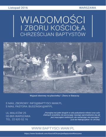 Listopad 2016 WARSZAWA WIADOMOŚCI I ZBORU KOŚCIOŁA CHRZEŚCIJAN BAPTYSTÓW Wyjazd zborowy na placówkę 1 Zboru w Baryczy. E-MAIL ZBOROWY: [email protected] E-MAIL PASTORA: [email protected] UL.WALICÓW 25 00-865 WARSZAWA TEL. 22 620 52 16 „Poznajmy też jedni drugich w celu pobudzenia miłości oraz szlachetnych uczynków, nie porzucając naszego zgromadzania się, jak jest zwyczajem niektórych, ale zachęcając się nawzajem.” (List do Hebrajczyków 10: 24-25a). WWW.BAPTYSCI.WAW.PL https://www.facebook.com/KosciolChrzecijanBaptystowWarszawa LISTOPAD WT.1 ŚR. 2 CZW.3 PT.4 SOB.5 ND.6 PON.7 WT.8 ŚR. 9 CZW.10 PT.11 SOB.12 ND.13 PON.14 WT.15 ŚR. 16 CZW.17 PT.18 SOB.19 ND.20 PON.21 WT.22 ŚR. 23 CZW.24 PT.25 SOB.26 ND.27 PON.28 WT.29 ŚR. 30 1 2.11 [śr] godz. 14:00-17:00 7.11 [pon] godz. 11:00 Dyżur duszpasterski 14-17, grupa Gedeonitów godz 17:00. Spotkanie kobiet. Sala przy kuchni. 2.11 [śr] godz. 18:00 Izrael w Księdze Izajasza. Wykład pastora Lecha Macieszczaka. 2.11 [śr] godz. 19:10 - 20:00 9.11 [śr] godz. 14:00 - 17:00 Dyżur duszpasterski 14-17, grupa Gedeonitów godz 17:00. 9.11 [śr] godz. 18:00 i 19:10 Grupa biblijna z pastorem. Nabożeństwo środowe - 18:00 Grupa biblijna z pastorem - 19:10 2.11 [śr] godz. 19:00 - 22:00 9.11 [śr] godz. 19:00 - 22:00 Grupa wstawienniczo modlitewna, sala Alfy. Grupa wstawienniczo modlitewna, sala Alfy. 3.11 [czw] godz. 19:00 10.11 [czw] godz. 19:00 Grupa biblijna 20+ Klub Enter. Samuel Skrzypkowski. Grupa biblijna 20+ Klub Enter. Samuel Skrzypkowski. 4.11 [pt] - 5.11 [sob] 11.11 [pt] godz. 18:00 Konferencja „Sekrety Mądrych Ojców” w Radości. Grupa młodszej młodzieży ,,Wiarygodni”. 4.11 [pt] godz. 18:00 12.11 [sob] godz. 12:00 Grupa młodszej młodzieży ,,Wiarygodni”. Grupa biblijno-modlitewna, budynek administracyjny, sala Alfy na parterze. – prowadzi Monika Sikorska. 5.11 [sob] godz. 12:00 Grupa biblijno-modlitewna, budynek administracyjny, sala Alfy na parterze. – prowadzi Monika Sikorska. 6.11 [nd] godz. 9:00 Grupa biblijna w Sali Alfa godz. 9:00, grupa biblijna u Pastora godz. 9:00, grupa modlitewna godz. 9:00 sala przy kuchni. Dorota Sadowska. 13.11 [nd] godz. 9:00 i 9:15 Grupa biblijna w Sali Alfa godz. 9:00, grupa biblijna u Pastora godz. 9:00, grupa modlitewna godz. 9:00 sala przy kuchni. Dorota Sadowska. 13.11 [nd] godz. 10:00 Nabożeństwo prowadzi pastor Marek Budziński. 6.11 [nd] godz. 10:00 14.11 [pon] godz. 11:00 Nabożeństwo połączone z Wieczerzą Pańską. Kazanie pastor Olesandr Marchenko z Kijowa. Spotkanie kobiet. Sala przy kuchni. 6.11 [nd] godz. 16:00 Wyjazd chóru zborowego do Zboru w Zelowie z okazji Jubileuszu 150 – lecia powstania zboru i 120- lecia budynku zborowego. 16.11 [śr] godz. 14:00 - 17:00 Dyżur duszpasterski 14-17, grupa Gedeonitów godz 17:00. 16.11 [śr] godz. 18:00 Spotkanie modlitewne w ramach Światowego Dnia Modlitwy Kobiet Baptystycznych. 16.11 [śr] godz. 19:10 23.11 [śr] godz. 18:00 Grupa biblijna z pastorem. Rozważanie z Listu do Koryntian 16.11 [śr] godz. 19:00 - 22:00 23.11 [śr] godz. 19:10 Grupa wstawienniczo modlitewna, sala Alfy. Grupa biblijna z pastorem. 17.11 [czw] godz. 11:00 23.11 [śr] godz. 19:00 - 22:00 Herbatka Seniora. Budynek administracyjny, sala przy kuchni. Prowadzi br. Konstanty Wiazowski. Grupa wstawienniczo modlitewna, sala Alfy. 17.11 [czw] godz. 19:00 Grupa biblijna 20+ Klub Enter. Samuel Skrzypkowski. 18.11 [pt] godz. 18:00 Spotkanie Rady Zboru z katechumenami godz 18 pok. Rady zboru. 18.11 [pt] godz. 18:00 24.11 [czw] godz. 19:00 Grupa biblijna 20+ Klub Enter. Samuel Skrzypkowski.grupa młodzieżowa godzina 18:00. Sala przy kuchni. 25.11 [pt] godz. 18:00 Grupa młodszej młodzieży ,,Wiarygodni”. 26.11 [sob] godz. 12:00 Grupa młodszej młodzieży ,,Wiarygodni”. Grupa biblijno-modlitewna, budynek administracyjny, sala Alfy na parterze. – prowadzi Monika Sikorska. 19.11 [sob] godz. 12:00 27.11 [nd] godz. 9:00 i 9:15 Grupa biblijno-modlitewna, budynek administracyjny, sala Alfy na parterze. – prowadzi Monika Sikorska. Grupa biblijna w Sali Alfa godz. 9:00, grupa biblijna u Pastora godz. 9:00, grupa modlitewna godz. 9:00 sala przy kuchni. Dorota Sadowska. 19.11 [sob] Kurs w Żyrardowie Kurs w Żyrardowie dla osób, które chcą pomagać i zorganizować, Gwiazdkową Niespodziankę”. 27.11 [nd] godz. 10:00 Nabożeństwo POŁĄCZONE Z Chrztem w wieku świadomym. 20.11 [nd] godz. 9:00 i 9:15 27.11 [nd] godz. 14:00 Grupa biblijna w Sali Alfa godz. 9:00, grupa biblijna u Pastora godz. 9:00, grupa modlitewna godz. 9:00 sala przy kuchni. Dorota Sadowska. Odwiedziny Zbór Chiński. Nabożeństwo o 14:00 Wólka Kosowska. Kazanie pastor M. Budziński. 20.11 [nd] godz. 10:00 Nabożeństwo prowadzi pastor Marek Budziński. Kazanie prezb. Konstanty Wiazowski. 20.11 [nd] Konferencja Zboru Świadectwa osób do Chrztu Wiary. 21.11 [pon] godz. 11:00 Spotkanie kobiet. Sala przy kuchni. 23.11 [śr] godz. 14:00 - 17:00 Dyżur duszpasterski 14-17, grupa Gedeonitów godz 17:00. 28.11 [pon] godz. 11:00 Spotkanie kobiet. Sala przy kuchni. 30.11 [śr] godz. 14:00 - 17:00 Dyżur duszpasterski 14-17, grupa Gedeonitów godz 17:00. 30.11 [śr] godz. 18:00 Społeczność środowa Film pt, „Kobieta jadąca na bestii”. 30.11 [śr] godz. 19:10 Grupa biblijna z pastorem. 30.11 [śr] godz. 19:00 - 22:00 Grupa wstawienniczo modlitewna, sala Alfy. 2 NABOŻEŃSTWA Niedzielne: godz. 10:00 Środowe: godz. 18:00 W JĘZYKU WIETNAMSKIM: niedziela w godz. 16:00, br. Hung tel. 889 931 735. W JĘZYKU CHIŃSKIM: niedziela, godz. 14:00 Wólka Kosowska, br. Tian tel. 604 898 277. MŁODZIEŻOWE W JĘZYKU CHIŃSKIM: niedziela, godz. 10:00 ul Waliców 25, budynek administracyjny, pierwsze piętro, br. Hanping tel. 603 821 812. W JĘZYKU ROSYJSKIM: niedziela, godz. 13:30, ul. Waliców 25 www.baptist.pl, br. Andreii, tel. 729 633 385. Spotkania kobiece sobota 17:00 - 19:00, sala przy kuchni. PLACÓWKI 1 ZKCHB: 1) PLACÓWKA W BARYCZY Barycz 82, 26-200 Końskie www.baptysc