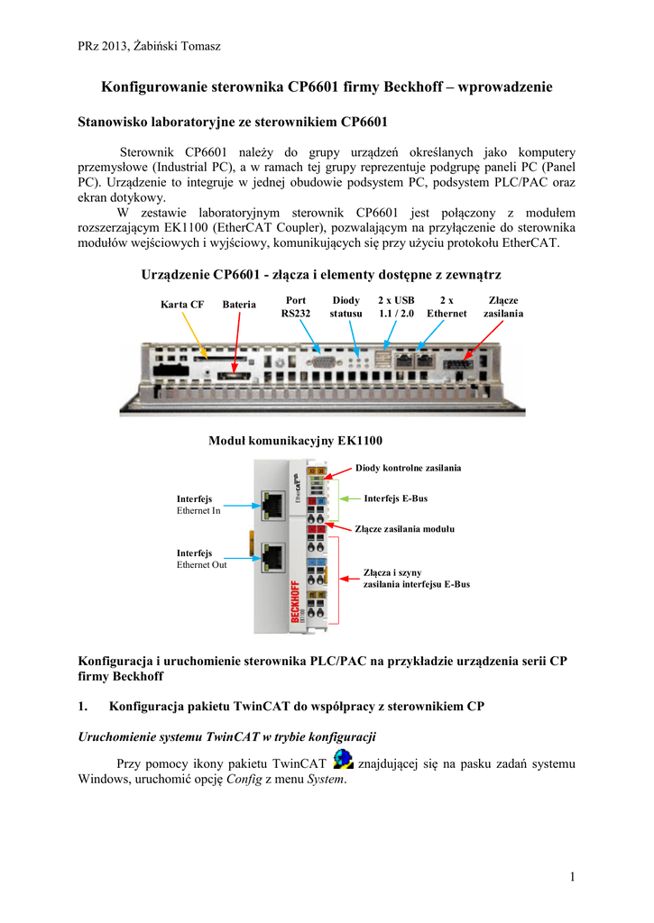 PRz 2013, Żabiński Tomasz Konfigurowanie sterownika CP6601 firmy Beckhoff – wprowadzenie Stanowisko laboratoryjne ze sterownikiem CP6601 Sterownik CP6601 należy do grupy urządzeń określanych jako komputery przemysłowe (Industrial PC), a w ramach tej grupy reprezentuje podgrupę paneli PC (Panel PC). Urządzenie to integruje w jednej obudowie podsystem PC, podsystem PLC/PAC oraz ekran dotykowy. W zestawie laboratoryjnym sterownik CP6601 jest połączony z modułem rozszerzającym EK1100 (EtherCAT Coupler), pozwalającym na przyłączenie do sterownika modułów wejściowych i wyjściowy, komunikujących się przy użyciu protokołu EtherCAT. Urządzenie CP6601 - złącza i elementy dostępne z zewnątrz Karta CF Bateria Port RS232 Diody statusu 2 x USB 1.1 / 2.0 2x Ethernet Złącze zasilania Moduł komunikacyjny EK1100 Diody kontrolne zasilania Interfejs Ethernet In Interfejs E-Bus Złącze zasilania modułu Interfejs Ethernet Out Złącza i szyny zasilania interfejsu E-Bus Konfiguracja i uruchomienie sterownika PLC/PAC na przykładzie urządzenia serii CP firmy Beckhoff 1. Konfiguracja pakietu TwinCAT do współpracy z sterownikiem CP Uruchomienie systemu TwinCAT w trybie konfiguracji Przy pomocy ikony pakietu TwinCAT znajdującej się na pasku zadań systemu Windows, uruchomić opcję Config z menu System. 1 PRz 2013, Żabiński Tomasz Klawisz myszy otwiera okno Tryb konfiguracji Tryby pracy TwinCAT są sygnalizowane odpowiednimi kolorami ikony programu: - zielony – uruchomiony, - czerwony – zatrzymany, - niebieski - tryb konfiguracji, - żółty - w trakcie uruchamiania. Konfiguracja połączenia sieciowego Komunikacja ze sterownikiem za pośrednictwem interfejsu Ethernet wymaga odpowiedniej konfiguracji sieci. Protokoły sieciowe sterownika oraz komputera PC z pakietem TwinCAT muszą być tak skonfigurowane, aby urządzenia znajdowały się w tej samej sieci (odpowiedni adres IP i maska podsieci – aby zweryfikować poprawność konfiguracji można wykorzystać instrukcję ping). Adres IP przydzielony dla sterownika zapisany jest na etykiecie przyklejonej do zestawu laboratoryjnego. Jeżeli sterownik nie odpowiada na polecenie ping wywołane z tym adresem, należy zgłosić to prowadzącemu. Jeżeli sterownik odpowiada na rozkaz ping, należy przejść do punktu Konfiguracja połączenia w pakiecie TwinCAT. Domyślna nazwa sterownika, odczytywana po ustanowieniu połączenia, składa się z napisu CP_ oraz ostatnich trzech bajtów MAC-ID umieszczonego na sterowniku (np. CP_142433). Konfiguracja połączenia w pakiecie TwinCAT Przy pomocy ikony znajdującej się na pasku zadań Windows, należy uruchomić pakiet System Manager a następnie wybrać opcję New z menu File. Klawisz myszy otwiera okno 2 PRz 2013, Żabiński Tomasz W celu zdefiniowania połączenia, w oknie General dla SYSTEM-Configuration wybrać opcję Choose Target.... Następnie uruchomić procedurę automatycznego wyszukiwania sterowników znajdujących się w sieci Ethernet – przycisk Search (Ethernet).... W oknie Add Route Dialog określić typ warstwy transportowej (Transport Type) jako TCP/IP oraz zaznaczyć opcję IP Address (jak na poniższym rysunku) następnie uruchomić opcję wyszukiwania rozgłoszeniowego – przycisk Broadcast Search. Jeżeli sterownik zostanie odnaleziony, w oknie Add Route Dialog pojawi się odpowiedni wpis zawierający nazwę urządzenia (Host Name) oraz informacje o adresach IP, AMS oraz wersji urządzenia. Brak symbolu X w polu Connected oznacza, że nie odbyło się logowanie do sterownika. W polu Router Name (Target) można dokonać zmiany nazwy sterownika (np. CP_SalaD2), która będzie identyfikowała skonfigurowane połączenie. W kolejnym kroku należy nacisnąć przycisk Add Route. W efekcie pojawi się okno logowania, w którym należy nacisnąć przycisk OK dla użytkownika Administrator bez hasła (jeżeli nie zostało wcześniej zdefiniowane). Gdy logowanie się powiedzie, w polu Connected pojawi się symbol X. W kolejnym kroku należy zamknąć okno Add Route Dialog przy pomocy przycisku Close oraz wybrać zdefiniowane połączenie dla aktualnego projektu, co spowoduje połączenie się System 3 PRz 2013, Żabiński Tomasz Manager ze sterownikiem. W tym celu należy zaznaczyć, przy pomocy myszki, nazwę zdefiniowanego połączenia i wybór zatwierdzić przyciskiem OK. Od tego momentu okno pakietu System Manager pozwala sterować podsystemem PLC sterownika. Jeżeli odpowiednie urządzenie nie zostanie wykryte, należy sprawdzić czy sterownik jest dostępny w sieci np. instrukcją ping i odpowiednio skonfigurować komputer PC (adresy IP, maska sieci). W przypadku, gdy sterownik nie zostanie wyszukany w sieci, a odpowiada na instrukcję ping, możliwe jest wyszukanie sterownika bezpośrednio poprzez wpisanie jego adresu IP w polu zaznaczonym na poniższym rysunku i naciśniecie przycisku Enter Host Name/IP:. Dalsze czynności należy wykonywać analogicznie jak opisano powyżej. W przypadku, gdy komunikacja ze sterownikiem powiodła się, w systemie TwinCAT dodany zostanie obiekt AMS Router identyfikujący zdefiniowane połączenie. Informacje o aktualnie istniejących AMS Router, można uzyskać wykorzystując ikonę TwinCAT Properties. znajdującą się na pasku zadań Windows i uruchamiając okno TwinCAT System 4 PRz 2013, Żabiński Tomasz Klawisz myszy otwiera okno Wybór opcji Properties Dodany AMS Router W oknie Remote Computers powinien znajdować się opis wpisany uprzednio jako nazwa sterownika. Tak skonfigurowane połączenie może być wykorzystywane w przyszłości bez konieczności ponownego definiowania struktury komunikacyjnej. Po wykonaniu powyższych operacji system TwinCAT jest gotowy do współpracy ze sterownikiem CP. Aktualny tryb pracy systemu TwinCAT w sterowniku jest sygnalizowany w pasku statusu okna TwinCAT System Manager, jak pokazano na poniższych rysunkach. W celu wyszukania urządzeń połączonych ze sterownikiem, system w st
