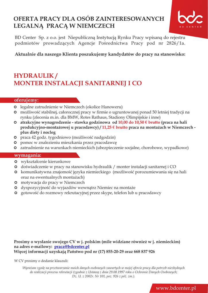 OFERTA PRACY DLA OSÓB ZAINTERESOWANYCH LEGALNĄ PRACĄ W NIEMCZECH BD Center Sp. z o.o. jest Niepubliczną Instytucją Rynku Pracy wpisaną do rejestru podmiotów prowadzących Agencje Pośrednictwa Pracy pod nr 2826/1a. Aktualnie dla naszego Klienta poszukujemy kandydatów do pracy na stanowisko: HYDRAULIK / MONTER INSTALACJI SANITARNEJ I CO oferujemy: ˘ legalne zatrudnienie w Niemczech (okolice Hanoweru) ˘ możliwość stabilnej, całorocznej pracy w firmie o ugruntowanej ponad 50 letniej tradycji na rynku (zlecenia m.in. dla BMW, Rotes Rathaus, Stadiony Olimpijskie i inne) ˘ atrakcyjne wynagrodzenie - stawka godzinowa od 10,00 do 10,50 € brutto (praca na hali produkcyjno-montażowej u pracodawcy) / 11,25 € brutto praca na montażach w Niemczech plus diety i nocleg ˘ praca 42 godz. tygodniowo (możliwość nadgodzin) ˘ pomoc w znalezieniu mieszkania przez pracodawcę ˘ zatrudnienie na warunkach niemieckich (ubezpieczenie socjalne, chorobowe, wypadkowe) wymagania: ˘ wykształcenie kierunkowe ˘ doświadczenie w pracy na stanowisku hydraulik / monter instalacji sanitarnej i CO ˘ komunikatywna znajomość języka niemieckiego (możliwość porozumiewania się na hali oraz na ewentualnych montażach) ˘ motywacja do pracy w Niemczech ˘ dyspozycyjność do wyjazdów wewnątrz Niemiec na montaże ˘ gotowość do rozmowy rekrutacyjnej przez skype, telefon lub u pracodawcy Prosimy o wysłanie swojego CV w j. polskim (mile widziane również w j. niemieckim) na adres e-mailowy: [email protected] Więcej informacji uzyskają Państwo pod nr (17) 855-20-29 oraz 668 837 926 W CV prosimy o dodanie klauzuli: Wyrażam zgodę na przetwarzanie moich danych osobowych zawartych w mojej ofercie pracy dla potrzeb niezbędnych do realizacji procesu rekrutacji (zgodnie z Ustawą z dnia 29.08.1997 roku o Ochronie Danych Osobowych; Dz. U. z 2002r. Nr 101, poz. 926 z póź. zm.). www.bdcenter.pl