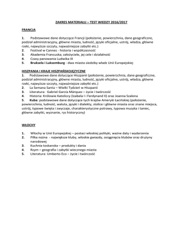 ZAKRES MATERIAŁU – TEST WIEDZY 2016/2017 FRANCJA 1. Podstawowe dane dotyczące Francji (położenie, powierzchnia, dane geograficzne, podział administracyjny, główne miasta, ludność, języki oficjalne, ustrój, władza, główne rzeki, najwyższe szczyty, najważniejsze zabytki etc.) 2. Festival w Cannes - historia i współczesność 3. Akademia Francuska; założyciele, jej cele i działalność 4. Czasy panowania Ludwika IX 5. Bruksela i Luksemburg - dwa miasta siedziby władz Unii Europejskiej HISZPANIA I KRAJE HISZPAŃSKOJĘZYCZNE 1. Podstawowe dane dotyczące Hiszpanii (położenie, powierzchnia, dane geograficzne, podział administracyjny, główne miasta, ludność, języki oficjalne, ustrój, władza, główne rzeki, najwyższe szczyty, najważniejsze zabytki etc.) 2. La Semana Santa – Wielki Tydzień w Hiszpanii 3. Literatura: Gabriel García Márquez – życie i twórczość 4. Historia: Królowie Katoliccy (Izabela I i Ferdynand II) oraz Joanna Szalona 5. Kuba: podstawowe dane dotyczące tych krajów Ameryki Łacińskiej (położenie, powierzchnia, ludność, waluta, języki i dialekty, stolice i główne miasta oraz znane miejsca, ustrój, typowe święta i zwyczaje, charakterystyczne potrawy, typowa muzyka i taniec, główne zabytki, wyznanie, rys historyczny) WŁOCHY 1. 2. 3. 4. 5. Włochy w Unii Europejskiej – postaci włoskiej polityki, ważne daty i wydarzenia Piłka nożna - największe kluby, włoskie gwiazdy, osiągnięcia klubów oraz drużyny narodowej Kuchnia toskanska – produkty i dania Rzym – geografia i zabytki wiecznego miasta Literatura: Umberto Eco – życie i twórczość