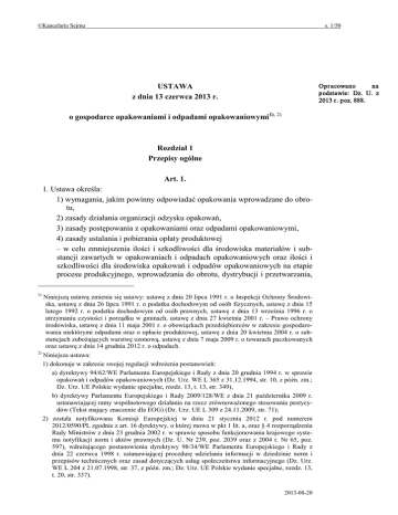 ©Kancelaria Sejmu s. 1/50 USTAWA z dnia 13 czerwca 2013 r. Opr acowano na podstawie: Dz. U. z 2013 r . poz. 888. o gospodarce opakowaniami i odpadami opakowaniowymi 1), 2) Rozdział 1 Przepisy ogólne Art. 1. 1. Ustawa określa: 1) wymagania, jakim powinny odpowiadać opakowania wprowadzane do obrotu, 2) zasady działania organizacji odzysku opakowań, 3) zasady postępowania z opakowaniami oraz odpadami opakowaniowymi, 4) zasady ustalania i pobierania opłaty produktowej – w celu zmniejszenia ilości i szkodliwości dla środowiska materiałów i substancji zawartych w opakowaniach i odpadach opakowaniowych oraz ilości i szkodliwości dla środowiska opakowań i odpadów opakowaniowych na etapie procesu produkcyjnego, wprowadzania do obrotu, dystrybucji i przetwarzania, Niniejszą ustawą zmienia się ustawy: ustawę z dnia 20 lipca 1991 r. o Inspekcji Ochrony Środowiska, ustawę z dnia 26 lipca 1991 r. o podatku dochodowym od osób fizycznych, ustawę z dnia 15 lutego 1992 r. o podatku dochodowym od osób prawnych, ustawę z dnia 13 września 1996 r. o utrzymaniu czystości i porządku w gminach, ustawę z dnia 27 kwietnia 2001 r. – Prawo ochrony środowiska, ustawę z dnia 11 maja 2001 r. o obowiązkach przedsiębiorców w zakresie gospodarowania niektórymi odpadami oraz o opłacie produktowej, ustawę z dnia 20 kwietnia 2004 r. o substancjach zubożających warstwę ozonową, ustawę z dnia 7 maja 2009 r. o towarach paczkowanych oraz ustawę z dnia 14 grudnia 2012 r. o odpadach. 2) Niniejsza ustawa: 1) dokonuje w zakresie swojej regulacji wdrożenia postanowień: a) dyrektywy 94/62/WE Parlamentu Europejskiego i Rady z dnia 20 grudnia 1994 r. w sprawie opakowań i odpadów opakowaniowych (Dz. Urz. WE L 365 z 31.12.1994, str. 10, z późn. zm.; Dz. Urz. UE Polskie wydanie specjalne, rozdz. 13, t. 13, str. 349), b) dyrektywy Parlamentu Europejskiego i Rady 2009/128/WE z dnia 21 października 2009 r. ustanawiającej ramy wspólnotowego działania na rzecz zrównoważonego stosowania pestycydów (Tekst mający znaczenie dla EOG) (Dz. Urz. UE L 309 z 24.11.2009, str. 71); 2) została notyfikowana Komisji Europejskiej w dniu 21 stycznia 2012 r. pod numerem 2012/0590/PL zgodnie z art. 16 dyrektywy, o której mowa w pkt 1 lit. a, oraz § 4 rozporządzenia Rady Ministrów z dnia 23 grudnia 2002 r. w sprawie sposobu funkcjonowania krajowego systemu notyfikacji norm i aktów prawnych (Dz. U. Nr 239, poz. 2039 oraz z 2004 r. Nr 65, poz. 597), wdrażającego postanowienia dyrektywy 98/34/WE Parlamentu Europejskiego i Rady z dnia 22 czerwca 1998 r. ustanawiającej procedurę udzielania informacji w dziedzinie norm i przepisów technicznych oraz zasad dotyczących usług społeczeństwa informacyjnego (Dz. Urz. WE L 204 z 21.07.1998, str. 37, z późn. zm.; Dz. Urz. UE Polskie wydanie specjalne, rozdz. 13, t. 20, str. 337). 1) 2013-08-20 ©Kancelaria Sejmu w szczególności przez wytwarzanie czystych produktów i stosowanie czystych technologii. 2. Ustawa określa prawa i obowiązki przedsiębiorców: 1) będących organizacjami odzysku opakowań; 2) dokonujących wewnątrzwspólnotowej dostawy: a) odpadów opakowaniowych, b) produktów w opakowaniach; 3) dystrybuujących produkty w opakowaniach; 4) eksportujących: a) odpady opakowaniowe, b) opakowania, c) produkty w opakowaniach; 5) prowadzących recykling lub inny niż recykling proces odzysku odpadów opakowaniowych; 6) wprowadzających opakowania; 7) wprowadzających produkty w opakowaniach. 3. Ustawa określa także obowiązki użytkowników środków niebezpiecznych będących środkami ochrony roślin. Art. 2. 1. W sprawach dotyczących gospodarki odpadami opakowaniowymi w zakresie nieuregulowanym w ustawie stosuje się przepisy ustawy z dnia 14 grudnia 2012 r. o odpadach (Dz. U. z 2013 r. poz. 21). 2. Przepisy ustawy nie naruszają przepisów określających wymagania dotyczące opakowań w zakresie warunków sanitarnych, bezpieczeństwa, ochrony zdrowia oraz wymogów transportowych dotyczących wyrobów pakowanych. Art. 3. 1. Opakowaniem w rozumieniu ustawy jest wyrób, w tym wyrób bezzwrotny, wykonany z jakiegokolwiek materiału, przeznaczony do przechowywania, ochrony, przewozu, dostarczania lub prezentacji produktów, od surowców do towarów przetworzonych. 2. Za opakowanie uważa się: 1) wyrób spełniający funkcje opakowania, o których mowa w ust. 1, bez uszczerbku dla innych funkcji, jakie opakowanie może spełniać, z wyłączeniem wyrobu, którego wszystkie elementy są przeznaczone do wspólnego użycia, spożycia lub usunięcia, stanowiącego integralną część produktu oraz niezbędnego do przechowywania, utrzymywania lub zabezpieczania produktu w całym cyklu i okresie jego funkcjonowania; 2) wyrób spełniający funkcje opakowania, o których mowa w ust. 1: a) wytworzony i przeznaczony do wypełniania w punkcie sprzedaży, b) jednorazowego użytku – sprzedany, wypełniony, wytworzony lub przeznaczony do wypełniania w punkcie sprzedaży; 3) część składową opakowania oraz złączony z opakowaniem element pomocniczy, spełniające funkcje opakowania, o których mowa w ust. 1, z tym że element pomocniczy przyczepiony bezpośrednio lub przymocowany do produktu uważa się za opakowanie, z wyłączeniem elementu stanowiącego 2013-08-20 s. 2/50 ©Kancelaria Sejmu integralną część produktu, który jest przeznaczony do wspólnego użycia lub usunięcia. 3. Minister właściwy do spraw środowiska określi, w drodze rozporządzenia, przykładowy wykaz wyrobów, w tym części składowych opakowań oraz złączonych z wyrobem elementów pomocniczych, które uznaje się albo nie uznaje się za opakowanie, kierując się potrzebą zapewnienia jednolitego uznawania wyrobów za opakowanie. Art. 4. Wyróżnia się następujące kategorie opakowań: 1) opakowania jednostkowe – służące do przekazywania produktu użytkownikowi w miejscu zakupu; 2) opakowania zbiorcze – zawierające wielokrotność opakowań j