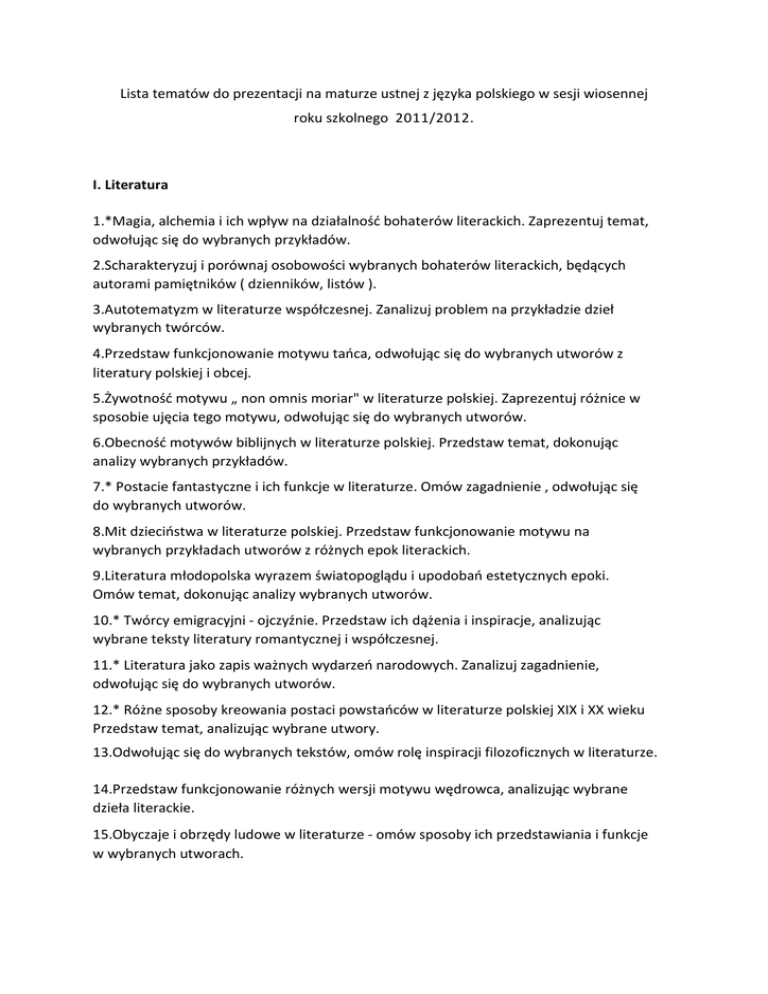 Lista tematów do prezentacji na maturze ustnej z języka polskiego w sesji wiosennej roku szkolnego 2011/2012. I. Literatura 1.*Magia, alchemia i ich wpływ na działalność bohaterów literackich. Zaprezentuj temat, odwołując się do wybranych przykładów. 2.Scharakteryzuj i porównaj osobowości wybranych bohaterów literackich, będących autorami pamiętników ( dzienników, listów ). 3.Autotematyzm w literaturze współczesnej. Zanalizuj problem na przykładzie dzieł wybranych twórców. 4.Przedstaw funkcjonowanie motywu tańca, odwołując się do wybranych utworów z literatury polskiej i obcej. 5.Żywotność motywu „ non omnis moriar" w literaturze polskiej. Zaprezentuj różnice w sposobie ujęcia tego motywu, odwołując się do wybranych utworów. 6.Obecność motywów biblijnych w literaturze polskiej. Przedstaw temat, dokonując analizy wybranych przykładów. 7.* Postacie fantastyczne i ich funkcje w literaturze. Omów zagadnienie , odwołując się do wybranych utworów. 8.Mit dzieciństwa w literaturze polskiej. Przedstaw funkcjonowanie motywu na wybranych przykładach utworów z różnych epok literackich. 9.Literatura młodopolska wyrazem światopoglądu i upodobań estetycznych epoki. Omów temat, dokonując analizy wybranych utworów. 10.* Twórcy emigracyjni - ojczyźnie. Przedstaw ich dążenia i inspiracje, analizując wybrane teksty literatury romantycznej i współczesnej. 11.* Literatura jako zapis ważnych wydarzeń narodowych. Zanalizuj zagadnienie, odwołując się do wybranych utworów. 12.* Różne sposoby kreowania postaci powstańców w literaturze polskiej XIX i XX wieku Przedstaw temat, analizując wybrane utwory. 13.Odwołując się do wybranych tekstów, omów rolę inspiracji filozoficznych w literaturze. 14.Przedstaw funkcjonowanie różnych wersji motywu wędrowca, analizując wybrane dzieła literackie. 15.Obyczaje i obrzędy ludowe w literaturze - omów sposoby ich przedstawiania i funkcje w wybranych utworach. 16.Różne ujęcia motywu zdrady w literaturze. Omów zagadnienie, analizując wybrane przykłady. 17.*Przedstaw i porównaj obrazy życia polskiej wsi w wybranych utworach literackich. 18. Utopie i antyutopie w literaturze - sposoby kreowania motywów i ich funkcje w literaturze. Omów na wybranych przykładach. 19.Przedstaw funkcje konfliktu pokoleń, odwołując się do wybranych przykładów z literatury. 20.Fascynacja brzydotą w literaturze. Opracuj temat, analizując wybrane utwory z różnych epok. 21.Literackie portrety idealistów i marzycieli. Zaprezentuj i porównaj kreacje bohaterów wybranych dzieł literackich. 22.Odwołując się do wybranych przykładów, przedstaw funkcjonowanie motywu przemiany wewnętrznej bohatera literackiego. 23.Porównaj sposób prezentacji motywu pracy w wybranych utworach literackich. 24.Dokonując analizy wybranego materiału literackiego, przedstaw funkcjonowanie motywu miłości w literaturze romantycznej i młodopolskiej. 25.Polemiki, spory, prowokacje - starcia pokoleń literackich. Omów zagadnienie, odwołując się do wybranych dzieł. 26.Różne ujęcia motywu miasta w literaturze. Omów zagadnienie, dokonując analizy wybranych utworów. 27.Przedstaw i porównaj obrazy rodziny w wybranych utworach literackich. II. Związki literatury z innymi dziedzinami sztuki. 1.*Motyw vanitas w poezji i malarstwie XVI i XVII wieku. Omów zagadnienie, analizując wybrane przykłady. 2.*Dzieło literackie a jego filmowa adaptacja. Porównaj i oceń wybrane przykłady. 3.* Przedstaw sposoby kreowania cywilizacji przyszłości, analizując wybrane dzieła literackie i filmowe. 4.*Biografie artystów jako temat literatury i sztuki. Przedstaw zagadnienie, odwołując się do wybranych przykładów. 5.*Muzyczne próby interpretacji poezji. Rozważ problem, analizując wybrane przykłady. 6.* Przedstaw różne sposoby kreowania portretu matki, odwołując się do wybranych tekstów kultury. 7.Fascynacja nowoczesnością w literaturze i sztuce XX wieku. Przedstaw temat, dokonując analizy wybranych przykładów. 8.Pejzaż romantyczny. Omów funkcjonowanie motywu, odwołując się do wybranych dzieł literackich i malarskich. 9.Porównaj sposoby prezentacji scen batalistycznych w wybranych dziełach literackich i malarskich. 10.* Starożytny Egipt jako inspiracja dla literatury i filmu. Omów zagadnienie, analizując wybrane przykłady. 11.Anioł jako motyw w literaturze i sztuce. Określ jego funkcje na podstawie analizy wybranych przykładów. 12.Symbolika stroju. Zanalizuj zagadnienie , odwołując się do przykładów z wybranych tekstów kultury. 13. Groteska w literaturze i malarstwie XX wieku. Przedstaw temat, dokonując analizy wybranych przykładów. 14. Inspiracje biblijne w kulturze. Scharakteryzuj je, analizując wybrane teksty kultury. 15. Analizując wybrane przykłady, przedstaw funkcjonowanie motywu arkadyjskiego w literaturze i malarstwie. 16. Artystyczne ujęcia obrazu młodości w literaturze i sztuce. Przedstaw różne sposoby realizacji tego motywu na wybranych przykładach. 17. Zaprezentuj i porównaj różne sposoby kreowania postaci chłopa w literaturze i sztuce, odwołując się do wybranych przykładów. 18. Odwołując się do wybranych utworów, zaprezentuj obraz totalitaryzmu w literaturze i sztuce XX wieku. III. Język. 1.Wpływ procesów językowych doby staropolskiej na kształt współczesnego języka polskiego. Omów problem na wybranych przykładach. 2.Przedstaw charakterystyczne cechy języka internautów na przykładach wypowiedzi z wybranych list dyskusyjnych. 3.Omów funkcje stylizacji biblijnej w wybranych utworach literackich różnych epok. 4.Język liryki miłosnej. Omów jego specyfikę, dokonując analizy wybranych przykładów. 5.Gwara szkolna jako swoista odmiana polszczyzny. Zanalizuj i przedstaw zjawisko, odwołując się do zgromadzonego materiału. 6.Funkcje neologizmów w utworze literackim. Omów temat, analizując wybrane utwory. 7.Na wybranych pr