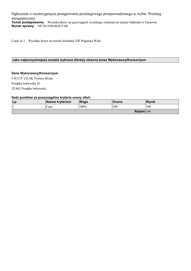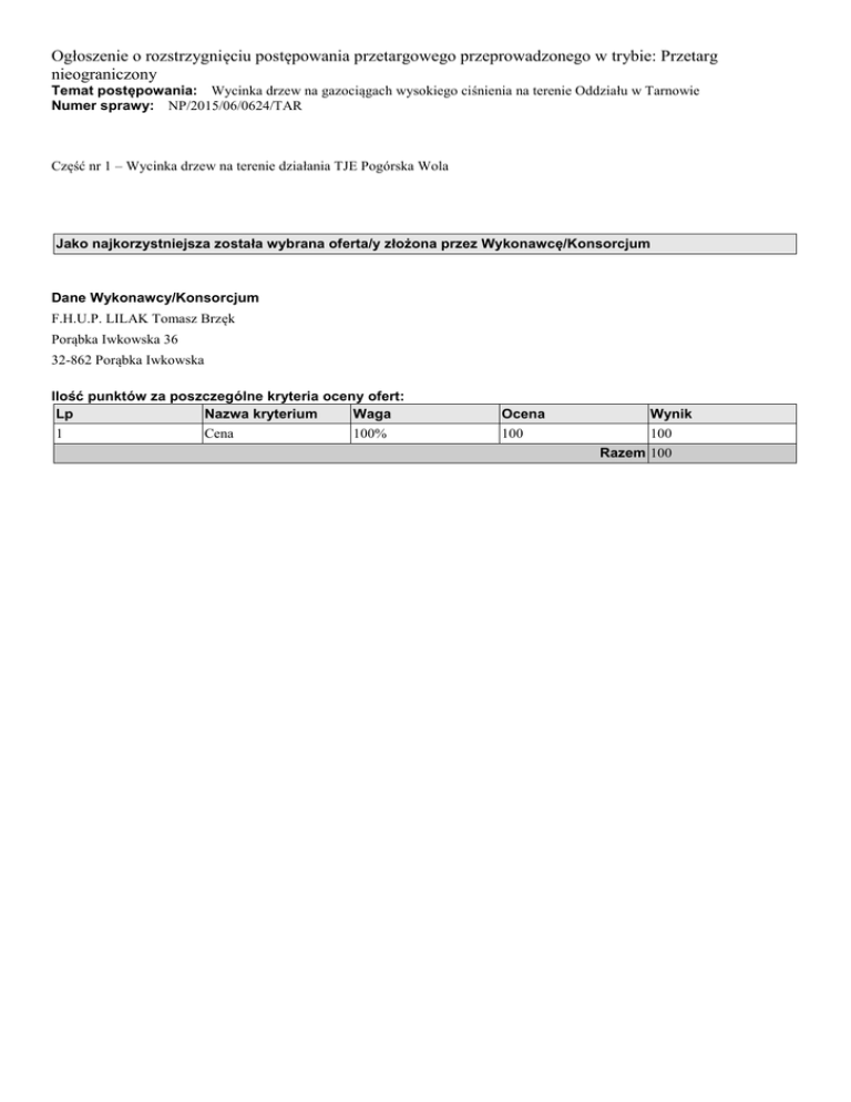 Ogłoszenie o rozstrzygnięciu postępowania przetargowego przeprowadzonego w trybie: Przetarg nieograniczony Temat postępowania: Wycinka drzew na gazociągach wysokiego ciśnienia na terenie Oddziału w Tarnowie Numer sprawy: NP/2015/06/0624/TAR Część nr 1 – Wycinka drzew na terenie działania TJE Pogórska Wola Jako najkorzystniejsza została wybrana oferta/y złożona przez Wykonawcę/Konsorcjum Dane Wykonawcy/Konsorcjum F.H.U.P. LILAK Tomasz Brzęk Porąbka Iwkowska 36 32-862 Porąbka Iwkowska Ilość punktów za poszczególne kryteria oceny ofert: Lp Nazwa kryterium Waga 1 Cena 100% Ocena 100 Wynik 100 Razem 100