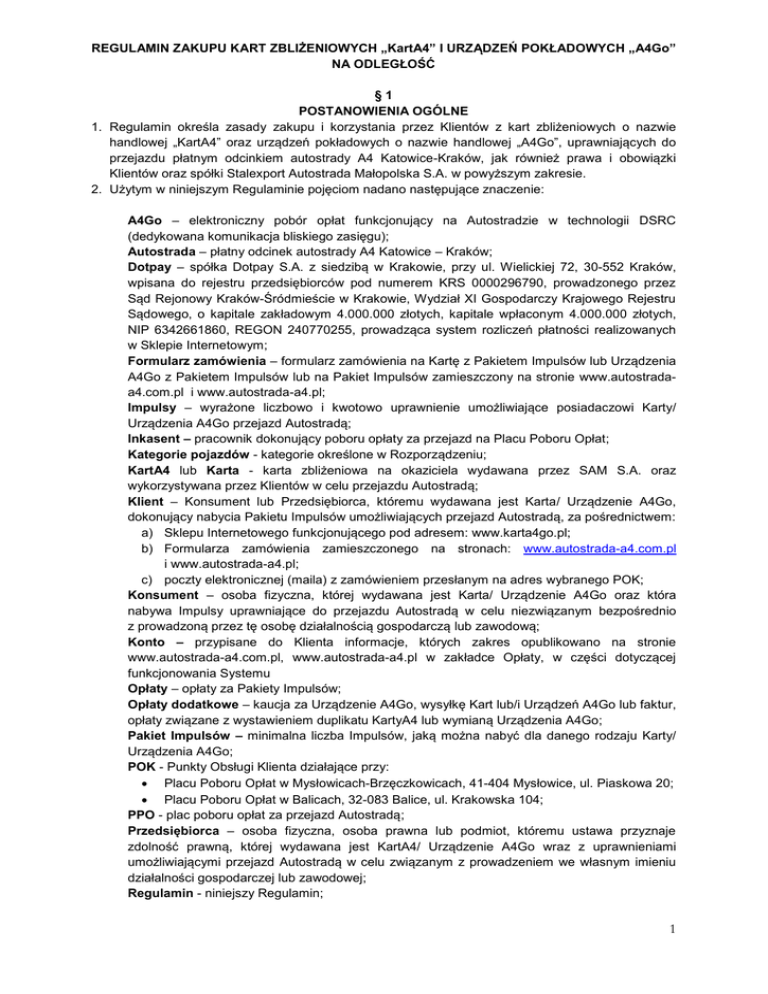 REGULAMIN ZAKUPU KART ZBLIŻENIOWYCH „KartA4” I URZĄDZEŃ POKŁADOWYCH „A4Go” NA ODLEGŁOŚĆ §1 POSTANOWIENIA OGÓLNE 1. Regulamin określa zasady zakupu i korzystania przez Klientów z kart zbliżeniowych o nazwie handlowej „KartA4” oraz urządzeń pokładowych o nazwie handlowej „A4Go”, uprawniających do przejazdu płatnym odcinkiem autostrady A4 Katowice-Kraków, jak również prawa i obowiązki Klientów oraz spółki Stalexport Autostrada Małopolska S.A. w powyższym zakresie. 2. Użytym w niniejszym Regulaminie pojęciom nadano następujące znaczenie: A4Go – elektroniczny pobór opłat funkcjonujący na Autostradzie w technologii DSRC (dedykowana komunikacja bliskiego zasięgu); Autostrada – płatny odcinek autostrady A4 Katowice – Kraków; Dotpay – spółka Dotpay S.A. z siedzibą w Krakowie, przy ul. Wielickiej 72, 30-552 Kraków, wpisana do rejestru przedsiębiorców pod numerem KRS 0000296790, prowadzonego przez Sąd Rejonowy Kraków-Śródmieście w Krakowie, Wydział XI Gospodarczy Krajowego Rejestru Sądowego, o kapitale zakładowym 4.000.000 złotych, kapitale wpłaconym 4.000.000 złotych, NIP 6342661860, REGON 240770255, prowadząca system rozliczeń płatności realizowanych w Sklepie Internetowym; Formularz zamówienia – formularz zamówienia na Kartę z Pakietem Impulsów lub Urządzenia A4Go z Pakietem Impulsów lub na Pakiet Impulsów zamieszczony na stronie www.autostradaa4.com.pl i www.autostrada-a4.pl; Impulsy – wyrażone liczbowo i kwotowo uprawnienie umożliwiające posiadaczowi Karty/ Urządzenia A4Go przejazd Autostradą; Inkasent – pracownik dokonujący poboru opłaty za przejazd na Placu Poboru Opłat; Kategorie pojazdów - kategorie określone w Rozporządzeniu; KartA4 lub Karta - karta zbliżeniowa na okaziciela wydawana przez SAM S.A. oraz wykorzystywana przez Klientów w celu przejazdu Autostradą; Klient – Konsument lub Przedsiębiorca, któremu wydawana jest Karta/ Urządzenie A4Go, dokonujący nabycia Pakietu Impulsów umożliwiających przejazd Autostradą, za pośrednictwem: a) Sklepu Internetowego funkcjonującego pod adresem: www.karta4go.pl; b) Formularza zamówienia zamieszczonego na stronach: www.autostrada-a4.com.pl i www.autostrada-a4.pl; c) poczty elektronicznej (maila) z zamówieniem przesłanym na adres wybranego POK; Konsument – osoba fizyczna, której wydawana jest Karta/ Urządzenie A4Go oraz która nabywa Impulsy uprawniające do przejazdu Autostradą w celu niezwiązanym bezpośrednio z prowadzoną przez tę osobę działalnością gospodarczą lub zawodową; Konto – przypisane do Klienta informacje, których zakres opublikowano na stronie www.autostrada-a4.com.pl, www.autostrada-a4.pl w zakładce Opłaty, w części dotyczącej funkcjonowania Systemu Opłaty – opłaty za Pakiety Impulsów; Opłaty dodatkowe – kaucja za Urządzenie A4Go, wysyłkę Kart lub/i Urządzeń A4Go lub faktur, opłaty związane z wystawieniem duplikatu KartyA4 lub wymianą Urządzenia A4Go; Pakiet Impulsów – minimalna liczba Impulsów, jaką można nabyć dla danego rodzaju Karty/ Urządzenia A4Go; POK - Punkty Obsługi Klienta działające przy: Placu Poboru Opłat w Mysłowicach-Brzęczkowicach, 41-404 Mysłowice, ul. Piaskowa 20; Placu Poboru Opłat w Balicach, 32-083 Balice, ul. Krakowska 104; PPO - plac poboru opłat za przejazd Autostradą; Przedsiębiorca – osoba fizyczna, osoba prawna lub podmiot, któremu ustawa przyznaje zdolność prawną, której wydawana jest KartA4/ Urządzenie A4Go wraz z uprawnieniami umożliwiającymi przejazd Autostradą w celu związanym z prowadzeniem we własnym imieniu działalności gospodarczej lub zawodowej; Regulamin - niniejszy Regulamin; 1 Rozporządzenie - Rozporządzenie Ministra Infrastruktury z dnia 29.04.2004 r. w sprawie opłat za przejazd autostradą (Dz. U. 04.102.1075), obowiązujące w stosunku do systemów pobierania opłat za przejazd autostradą ustalonych przed dniem wejścia w życie ustawy z dnia 7 listopada 2008 r. o zmianie Ustawy o drogach publicznych oraz niektórych innych ustaw (Dz.U. z dnia 9 grudnia 2008 r.); SAM S.A. lub Sprzedawca - spółka Stalexport Autostrada Małopolska S.A. z siedzibą w Mysłowicach przy ul. Piaskowej 20, (41 – 404) Mysłowice, wpisana do rejestru przedsiębiorców prowadzonego przez Sąd Rejonowy Katowice-Wschód w Katowicach, Wydział VIII Gospodarczy Krajowego Rejestru Sądowego pod numerem 26895, NIP 634 22 62 054, Regon: 273796214, Kapitał zakładowy: 66.753.000 zł wpłacony w całości, tel. 32 7627555; Sklep Internetowy lub Sklep - sklep o domenie www.karta4go.pl, za pomocą którego Klientowi wydawana jest KartA4/ Urządzenie A4Go, a także możliwe jest nabycie uprawnień w postaci Impulsów umożliwiających przejazd Autostradą; System – system informatyczny umożliwiający zarządzenie bazą Kont Klientów, rejestrujący wszelkie transakcje i operacje na Kontach, Kartach oraz Urządzeniach A4Go dokonywane w oparciu o niniejszy Regulamin jak i Regulamin zakupu kart zbliżeniowych „KartA4” i Urządzeń Pokładowych „A4Go” w Punktach Obsługi Klienta; Urządzenie A4Go – urządzenie pokładowe zainstalowane zgodnie z instrukcją dołączoną do urządzenia, przesyłające informacje o pojeździe do anten odbiorczych zainstalowanych na PPO Autostrady, przy użyciu którego możliwy jest przejazd. Własność Urządzenia A4Go pozostaje przy SAM S.A., a jest ono użyczane Klientowi po uiszczeniu kaucji określonej w niniejszym Regulaminie. §2 OPŁATY I OPŁATY DODATKOWE 1. Opłaty za poszczególne Pakiety Impulsów: dla Kart Liczba Impulsów w pakiecie Rabat 10% Kategoria 1 20 20 zł 180,00 zł Kategoria 2 20 33 zł 297,00 zł Kategoria 3 20 33 zł 297,00 zł Kategoria 4 20 53 zł 477,00 zł Liczba Impulsów w pakiecie Rabat 15% Kategoria 1 20 30 zł 170,00 zł Kategoria 2 20 49,50 zł 280,50 zł Kategoria 3 20 49,50 zł 280,50 zł Kategoria 4 20 79,50 zł 450,50 zł Rodzaj Karty Opłata za 1 p