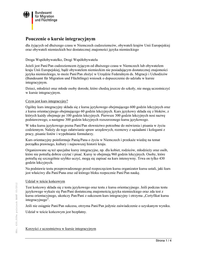 Pouczenie o kursie integracyjnym dla żyjących od dłuższego czasu w Niemczech cudzoziemców, obywateli krajów Unii Europejskiej oraz obywateli niemieckich bez dostatecznej znajomości języka niemieckiego Droga Współobywatelko, Drogi Współobywatelu Jeżeli jest Pani/Pan cudzoziemcem żyjącym od dłuższego czasu w Niemczech lub obywatelem kraju Unii Europejskiej, bądź obywatelem niemieckim nie posiadającym dostatecznej znajomości języka niemieckiego, to może Pani/Pan złożyć w Urzędzie Federalnym ds. Migracji i Uchodźców (Bundesamt für Migration und Flüchtlinge) wniosek o dopuszczenie do udziału w kursie integracyjnym. Dzieci, młodzież oraz młode osoby dorosłe, które chodzą jeszcze do szkoły, nie mogą uczestniczyć w kursie integracyjnym. Czym jest kurs integracyjny? Ogólny kurs integracyjny składa się z kursu językowego obejmującego 600 godzin lekcyjnych oraz z kursu orientacyjnego obejmującego 60 godzin lekcyjnych. Kurs językowy składa się z bloków, z których każdy obejmuje po 100 godzin lekcyjnych. Pierwsze 300 godzin lekcyjnych nosi nazwę podstawowego, a następne 300 godzin lekcyjnych rozszerzonego kursu językowego. W toku kursu językowego pozna Pani/Pan słownictwo potrzebne do mówienia i pisania w życiu codziennym. Należy do tego załatwianie spraw urzędowych, rozmowy z sąsiadami i kolegami z pracy, pisanie listów i wypełnianie formularzy. Kurs orientacyjny poinformuje Panią/Pana o życiu w Niemczech i przekaże wiedzę na temat porządku prawnego, kultury i najnowszej historii kraju. Organizowane są też specjalne kursy integracyjne, np. dla kobiet, rodziców, młodzieży oraz osób, które nie potrafią dobrze czytać i pisać. Kursy te obejmują 960 godzin lekcyjnych. Osoby, które potrafią się szczególnie szybko uczyć, mogą się zapisać na kurs intensywny. Trwa on tylko 430 godzin lekcyjnych. KNr. 630.009e polnisch BAMF 03/2012 Na podstawie testu przeprowadzonego przed rozpoczęciem kursu organizator kursu ustali, jaki kurs jest właściwy dla Pani/Pana oraz od którego bloku rozpocznie Pani/Pan naukę. Udział w teście końcowym Test końcowy składa się z testu językowego oraz testu z kursu orientacyjnego. Jeśli podczas testu językowego wykaże się Pan/Pani dostateczną znajomością języka niemieckiego oraz zda test z kursu orientacyjnego, ukończy Pan/Pani z sukcesem kurs integracyjny i otrzyma „Certyfikat kursu integracyjnego”. Jeśli nie osiągnie Pani/Pan sukcesu, otrzyma Pani/Pan jedynie zaświadczenie o uzyskanym wyniku. Udział w teście końcowym jest bezpłatny. Korzyści z uczestnictwa w kursie integracyjnym Strona 1 / 4 Pouczenie o kursie integracyjnym Urząd Federalny ds. Migracji i Uchodźców Cudzoziemcy, pochodzący z krajów, które nie należą do Unii Europejskiej, muszą spełnić pewne warunki, jeżeli pragną uzyskać prawo do bezterminowego pobytu w Niemczech. Zalicza się do nich m.in. dostateczną znajomość języka niemieckiego oraz podstawową znajomość porządku prawnego i społecznego, a także warunków życia w Niemczech. Pomyślne ukończenie kursu integracyjnego pozwala na spełnienie tych warunków. Oprócz tego możliwe jest wtedy ewentualnie wcześniejsze uzyskanie obywatelstwa. Ponadto znajomość języka niemieckiego nabyta podczas kursu integracyjnego ułatwia codzienne życie w Niemczech oraz zwiększa szanse na rynku pracy. Dopuszczenie do kursu integracyjnego wydane przez Urząd Federalny i zgłoszenie w instytucji prowadzącej kurs Prosimy o kompletne i czytelne wypełnienie wniosku o dopuszczenie na kurs. Z prośbą o pomoc przy składaniu wniosku można się zwrócić również do najbliższej instytucji prowadzącej kurs. Wypełniony wniosek prosimy przesłać do właściwego dla Pani/Pana miejsca zamieszkania oddziału regionalnego Urzędu Federalnego. Jeżeli zostanie Pani/Pan dopuszczony do udziału w kursie integracyjnym, to otrzyma Pani/Pan pisemne potwierdzenie z Urzędu Federalnego (uprawnienie do udziału w kursie). Jednocześnie otrzyma Pani/Pan wykaz instytucji prowadzących kursy integracyjne w pobliżu Pani/Pana miejsca zamieszkania. Dopuszczenie do kursu integracyjnego jest ważne przez dwa lata. W potwierdzeniu, w rubryce „Die Teilnahmeberechtigung ist gültig bis..” (uprawnienie do uczestnictwa ważne do ...) jest podany termin, przed upływem którego powinna(-ien) się Pani/Pan zgłosić na kurs integracyjny w instytucji prowadzącej kurs. W związku z tym prosimy o jak najszybsze zgłoszenie się na kurs i przedłożenie w instytucji prowadzącej kurs swojego uprawnienia do udziału w kursie! Instytucja prowadząca kurs powinna podać Pani/Panu przewidywany termin rozpoczęcia kursu. Kurs powinien się rozpocząć nie później niż w ciągu trzech miesięcy od momentu zgłoszenia się na kurs. Jeśli w tym terminie nie rozpocznie się żaden kurs, organizator kursu musi Panią/Pana o tym poinformować. Wtedy można samodzielnie zadecydować o dalszym czekaniu na kurs lub zgłoszeniu się do innej instytucji prowadzącej kurs. W tym przypadku organizator kursu musi zwrócić Pani/Panu uprawnienie do udziału w kursie. Przepisowe uczestnictwo w kursie Aby osiągnąć cel kursu integracyjnego, należy uczestniczyć w nim w przepisowy sposób. Oznacza to regularne uczestnictwo w lekcjach oraz udział w teście końcowym. Przepisowe uczestnictwo w kursie jest ważne również w przypadku zwrotu kosztów dojazdu lub późniejszego powtarzania godzin lekcyjnych kursu językowego. Na żądanie instytucja prowadząca kurs wydaje zaświadczenie o przepisowym uczestnictwie w kursie. Zmiana instytucji prowadzącej kurs jest zasadniczo możliwa tylko po zakończeniu bloku kursu. Koszty kursu integracyjnego Za udział w kursie trzeba zapłacić instytucji prowadzącej kurs opłatę w wysokości 1,20 euro za jedną godzinę lekcyjną. Opłatę należy uiścić za każdy blok kursu obejmujący 100 godzin lekcyjnych i przed rozpoczęciem kursu orient