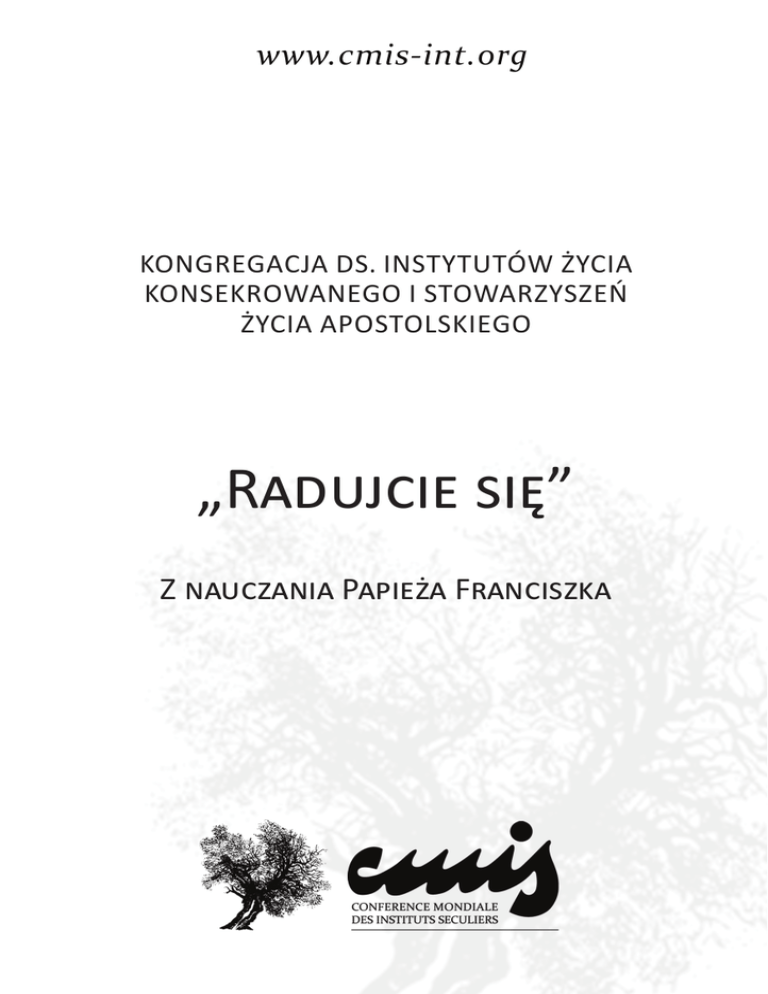 Kongregacja ds. Instytutów Życia Konsekrowanego i Stowarzyszeń Życia Apostolskiego „Radujcie się” Z nauczania Papieża Franciszka Kongregacja ds. Instytutów Życia Konsekrowanego i Stowarzyszeń Życia Apostolskiego „Radujcie się” Z nauczania Papieża Franciszka List Kongregacji Instytutów Życia Konsekrowanego (Prot. n. Sp.R. M 1/2014) Chciałem powiedzieć wam jedno słowo, tym słowem jest radość. Zawsze tam, gdzie są konsekrowani, zawsze jest radość! Papież Franciszek indeks Umiłowani, bracia i siostry ........................................ 5 I - Radujcie się, weselcie się, promieniujcie radością ......... 8 Wsłuchując się ...................................................... 9 To jest piękno .................................................... 12 Powołując was .................................................. 13 Odnalezieni, dogonieni, przemienieni ............... 16 W radości wiernego Tak ................................... 19 II - Pocieszajcie, pocieszajcie mój lud ..................... 23 Wsłuchując się .................................................. 24 Nieść uścisk Boga .............................................. 25 Czułość dobrze nam robi .................................... 26 Bliskość jako towarzyszenie ............................... 28 Niepokój miłości ................................................. 29 III - Do refleksji ..................................................... 32 Pytania papieża Franciszka ............................... 33 Bądź pozdrowiona, Matko radości ................... 36 Notatki ................................................................... 38 CONFÉRENCE MONDIALE DES INSTITUTS SÉCULIERS Umiłowani, bracia i siostry 1. „Radość Ewangelii napełnia serce i całe życie tych, którzy spotykają się z Jezusem. Z Jezusem Chrystusem radość zawsze rodzi się i odradza”[1]. Incipit adhortacji Evangelii gaudium wybrzmiewa w nauczaniu Papieża Franciszka z nadzwyczajną żywotnością, przyzywając cudowną tajemnicę Dobrej Nowiny, która gdy zostaje przyjęta w sercu człowieka, przemienia jego życie. Opowiada nam przypowieść o radości: spotkanie z Jezusem rozpala w nas pierwotne piękno, piękno oblicza, na którym jaśnieje chwała Ojca (por. 2 Kor 4,6), w owocu radości. Kongregacja Instytutów Życia Konsekrowanego i Stowarzyszeń Życia Apostolskiego zaprasza do refleksji nad czasem łaski, który został nam dany, nad szczególnym zaproszeniem, z którym Papież zwraca do życia konsekrowanego. Przyjęcie tego nauczania oznacza odnowienie egzystencji według Ewangelii, nie na sposób radykalny wedle modelu doskonałości będącej często separowaniem się, ale w przylgnięciu toto corde [całym sercem] do wydarzenia zbawczego spotkania, które przemienia życie: „Chodzi o pozostawienie wszystkiego, aby pójść za Panem. Nie, nie chcę powiedzieć: radykalnie. Radykalizm ewangeliczny nie jest cechą tylko zakonników: oczekuje się go od wszystkich. Ale zakonnicy idą za Panem w sposób szczególny, w sposób profetyczny. Oczekuję od was takiego świadectwa. Zakonnicy powinni być mężczyznami i kobietami zdolnymi obudzić świat”[2]. 5 www.cmis-int.org W ludzkiej skończoności, w ograniczeniach, w codzienności osoby konsekrowane żyją w wierności, pokazując radość, która w nich mieszka, i stają się wspaniałym świadectwem, skutecznym przepowiadaniem, towarzyszami i osobami bliskimi kobiet i mężczyzn, którzy razem z nimi zamieszkują historię i szukają Kościoła, jako ojczystego domu[3]. Franciszek z Asyżu, przyjmując Ewangelię jako formę życia, „przyczynił się do wzrostu wiary, odnowił Kościół; jednocześnie odnowił społeczeństwo, uczynił je bardziej braterskim, ale zawsze z Ewangelią, ze świadectwem. Głoście zawsze Ewangelię, a gdyby to było potrzebne, także słowami!”[4]. Nasuwają się nam liczne sugestie, gdy wsłuchujemy się w słowa Papieża, ale w sposób szczególny domaga się naszej odpowiedzi absolutna prostota, z jaką Papież Franciszek proponuje swoje nauczanie, dostosowując się do rozbrajającej autentyczności Ewangelii. Słowa sine glossa, rozsiewane szerokim gestem przez dobrego siewcę, który z zaufaniem nie dyskryminuje żadnego rodzaju ziemi. Autorytatywne zaproszenie skierowane do nas z lekkością zaufania, zaproszenie do tego, aby sprowadzić do zera argumenty instytucjonalne i osobiste usprawiedliwienia; prowokujące słowo, które stawia pod znakiem zapytania nasz sposób życia, czasem ociężały i senny, często na marginesie wyzwania gdybyście mieli wiarę jak ziarnko gorczycy (Łk 17,5). Zaproszenie, które pobudza naszego ducha, aby dać przestrzeń Słowu, które mieszka w nas, Duchowi, który stwarza i nieustannie odnawia Kościół. List ten znajduje uzasadnienie w takim właśnie zaproszeniu i pragnie zapoczątkować wspólną refleksję, jako proste narzędzie szczerej konfrontacji między Ewangelią a Życiem. Dykasterium inicjuje w ten sposób wspólną drogę, miejsce refleksji osobistej, braterskiej, w ramach instytutu, drogę ku 2015 rokowi, który 6 CONFÉRENCE MONDIALE DES INSTITUTS SÉCULIERS Kościół poświęca życiu konsekrowanemu. Z pragnieniem i zamiarem odważenia się na podjęcie decyzji ewangelicznych, owocujących odrodzeniem, płodnych w radość: „Prymat Boga nadaje ludzkiemu istnieniu pełnię sensu i radości, ponieważ człowiek został stworzony dla Boga i jest niespokojny, dopóki w Nim nie spocznie”[5]. 7 www.cmis-int.org Radujcie się, weselcie się, promieniujcie radością Radujcie się wraz z Jerozolimą, weselcie się, co ją miłujecie! Cieszcie się z nią bardzo wy wszyscy, którzyście się nad nią smucili. Tak bowiem mówi Pan: „Oto Ja skieruję do niej pokój jak rzekę i chwałę narodów - jak strumień wezbrany. Ich niemowlęta będą noszone na rękach i na kolanach będą pieszczone. Jak kogo pociesza własna matka, tak Ja was poci