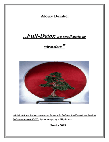 Alojzy Bombel „Full-Detox na spotkanie ze zdrowiem” „JeŜeli ciało nie jest oczyszczone, to im bardziej będziesz je odŜywiać, tym bardziej będziesz mu szkodzić !!!". Ojciec medycyny - Hipokrates Polska 2008 Witam Państwa! Decyzja o zakupie mojego poradnika była chyba jedną z najlepszych jaką udało się Państwu podjąć. Wierzę w to szczerze! Konsekwentne trzymanie się moich zaleceń i wykonywanie niŜej opisanych poleceń sprawi, Ŝe spojrzycie Państwo na świat z innej perspektywy, z tej lepszej. Omawianą poniŜej kurację najlepiej ordynować sobie co rok w czasie wiosennego przednówku (marzec/kwiecień) wówczas, gdy ubywa księŜyca. Terapia ta dobroczynnie wpływa na odnowę i siły witalne całego organizmu. Gdy cała przyroda budzi się po zimie, wówczas jest to najlepszy czas, aby odświeŜyć własny organizm, odtruć go z nazbieranych wieloletnich odpadów i rozpocząć rok z nowymi siłami! Kuracje moŜna wykonywać kaŜdą porą roku. Kuracja przedstawiona w niniejszym poradniku pozwala na wykonanie kompleksowego oczyszczenia organizmu. MoŜe na początek postaram przedstawić się Państwu kilka faktów mówiących w jaki sposób reaguje „zatruty” (zanieczyszczony) organizm. Proszę mi uwierzyć kaŜdy z nas w mniejszym lub większym stopniu ma organizm zanieczyszczony! „O higienie zewnętrznej kaŜdy wie z dzieciństwa, natomiast o higienie wewnętrznej my wiemy niewiele. Podczas gdy stan naszych wewnętrznych organów określa nasz wygląd zewnętrzny. Mało kto wie, Ŝe u dorosłej osoby w jelicie grubym znajduje się od 8 do 15 kg kamieni kałowych, które człowiek nosi przez całe Ŝycie a nie są mu do niczego potrzebne.” (Michał Tombak) Gdy organizm jest zanieczyszczony podstawowe procesy fizjologiczne są bardzo utrudnione. Krew jest gęsta od nadmiaru toksyn i w mniejszym stopniu jest ona w stanie transportować odŜywcze substancje do poszczególnych komórek, czego wynikiem są częste bóle, osłabienia, zmiany nastroju itd. 2 Jelito grube dla nas jest jak doniczka dla roślin, a strawiony pokarm gra rolę dobrze nawiezionej gleby. Człowiek - to drzewo. Ścianki jelita grubego są pokryte korzonkami, które podobnie jak korzenie rośliny, wsysają do krwi poŜyteczne substancje. KaŜda grupa korzonków odŜywia odpowiedni organ. Zbyteczne pozostałości są wydalane. To jest zrozumiałe. A co się dzieje z nie strawioną bryłką? Podczas następnego posiłku do niej dokleja się jeszcze jedna, potem jeszcze ... Nie strawiony pokarm przylepia się do ścianek jelita grubego. Człowiek nosi ich aŜ po kilka kilogramów. A co się dzieje z tymi produktami „przechowywanymi" przez wiele lat w temperaturze powyŜej 36oC nietrudno sobie wyobrazić. (Giennadij Małachow) Funkcjonujący nadal pod warstwą „brudów" układ wchłaniający jelita grubego dostarcza do ciała toksyny, substancje rakotwórcze, produkty gnicia. To się rozumie samo przez się, Ŝe z tych substancji nie zbuduje się nowych komórek. Rozchodzą się one z krwią po całym organizmie i stopniowo osiadają na ściankach naczyń krwionośnych, w stawach doprowadzając do stanów zapalnych organizm. Dlatego kategorycznie przynajmniej raz na rok powinniśmy przeprowadzać kompleksowe oczyszczanie organizmu by nie dopuścić do szerzenia się chorób i stanów zapalnych. Jeśli chcecie Państwo dowiedzieć się więcej o wyŜej wymienionych zagadnieniach odsyłam do ksiąŜki Michała Tombaka – „Jak Ŝyć długo i zdrowo” oraz Giennadija Małachowa– „Lecznicza głodówka”. 3 Zaczynamy! Pierwsze trzy tego typu kuracje powinniśmy przeprowadzać w komfortowych warunkach (wolne od szkoły, pracy, Ŝadnego stresu). Organizm w tych dniach będzie przechodził swoistego rodzaju procesy oczyszczania i związane z nimi zmęczenie będzie nam towarzyszyć przez kilka dni. Na początek najwaŜniejszym jest; „pozytywne podejście do sprawy”. Nie moŜecie podejmować się Ŝadnego wyzwania jeśli w gruncie samego siebie nie jesteście pewni, Ŝe to co robicie ma sens i da wam wiele korzyści. Musicie uwierzyć i z wielkim oddaniem dąŜyć do celu, tylko wtedy cel stanie się tak bliski jak nigdy dotąd. ZauwaŜcie jedną zasadnicza rzecz, dlaczego ludziom pesymistycznie nastawionym do Ŝycia jest trudniej? PoniewaŜ sami sobie wmawiają niepowodzenia, aŜ w końcu stany zaistniałe w ich głowach stają się rzeczywistością. Dlatego proszę o jedno, o jak najwięcej optymizmu w Waszym Ŝyciu, musicie nauczyć się śmiać nawet z najgorszych niepowodzeń a Wasze Ŝycie zmieni się i to bardzo. Moja kuracja składa się z 4 faz. 1. Faza przygotowania (czas dobrany indywidualnie ok. kilkunastu dni) 2. Faza wprowadzenia (czas trwania: 2-3 dni) 3. Faza właściwa - głodówka (czas trwania: 7 dni) 4. Faza regeneracji (czas trwania: 5-7 dni) 1. Faza przygotowania (czas trwania uzaleŜniony od nawyków Ŝywieniowych osoby przeprowadzającej kuracje) Jest to faza przygotowania organizmu do zmiany jaka nastąpi w późniejszym czasie. Nasze zanieczyszczone organizmy musimy po części odtruć i przygotować na „szok”. „Szok”? Szokiem stanie się fakt, iŜ w późniejszym czasie kuracji nasz organizm nie będzie dostawał Ŝadnego poŜywienia z zewnątrz, - tylko czysta woda. Wynikiem tego, 4 organizm sam zacznie „zdobywać” poŜywienie, poprzez trawienie wewnętrzne, na początek: tkanki tłuszczowej a później wszystkich niepotrzebnych i chorych komórek, które zalegają bezuŜytecznie w naszym organizmie. Długość tej fazy jest uzaleŜniona od naszych indywidualnych skłonności do niezdrowego odŜywiania, ilości sportu, naraŜenia na stres. Do wszystkiego tego co miało na nas niekorzystny wpływ w przeszłości. Jeśli jesteś osobą, która bardzo źle się odŜywiała, uprawiała mało sportu a stres towarzyszył Ci prawie codziennie będziesz musiał/a poświecić więcej czasu na przygotowanie nawet kilkanaście dni. Weganie i osoby prowadz