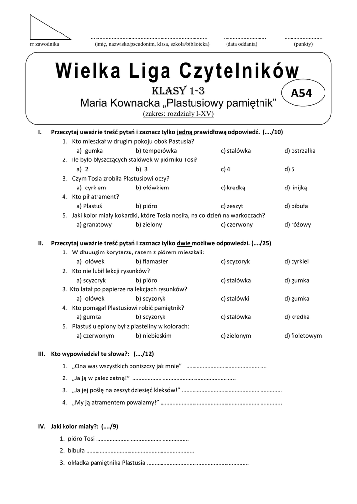 ………………………………………………………………….. nr zawodnika (imię, nazwisko/pseudonim, klasa, szkoła/biblioteka) ………………………. (data oddania) ……………………. (punkty) Wielka Liga Czytelników KLASY 1-3 Maria Kownacka „Plastusiowy pamiętnik” A54 (zakres: rozdziały I-XV) I. Przeczytaj uważnie treść pytań i zaznacz tylko jedną prawidłową odpowiedź. (…./10) 1. Kto mieszkał w drugim pokoju obok Pastusia? a) gumka b) temperówka c) stalówka d) ostrzałka 2. Ile było błyszczących stalówek w piórniku Tosi? a) 2 b) 3 c) 4 d) 5 3. Czym Tosia zrobiła Plastusiowi oczy? a) cyrklem b) ołówkiem c) kredką d) linijką 4. Kto pił atrament? a) Plastuś b) pióro c) zeszyt d) bibuła 5. Jaki kolor miały kokardki, które Tosia nosiła, na co dzień na warkoczach? a) granatowy b) zielony c) czerwony d) różowy II. Przeczytaj uważnie treść pytań i zaznacz tylko dwie możliwe odpowiedzi. (…./25) 1. W dłuuugim korytarzu, razem z piórem mieszkali: a) ołówek b) flamaster c) scyzoryk 2. Kto nie lubił lekcji rysunków? a) scyzoryk b) pióro c) stalówka 3. Kto latał po papierze na lekcjach rysunków? a) ołówek b) scyzoryk c) stalówki 4. Kto pomagał Plastusiowi robić pamiętnik? a) gumka b) scyzoryk c) stalówka 5. Plastuś ulepiony był z plasteliny w kolorach: a) czerwonym b) niebieskim c) zielonym III. Kto wypowiedział te słowa?: (…./12) 1. „Ona was wszystkich poniszczy jak mnie” …………………………………………….. 2. „Ja ją w palec zatnę!” ………………………………………………………….. 3. „Ja jej poślę na zeszyt dziesięć kleksów!” ………………………………………………………… 4. „My ją atramentem powalamy!” …………………………………………………………………….. IV. Jaki kolor miały?: (…./9) 1. pióro Tosi ……………………………………………………. 2. bibuła …………………………………………………………….. 3. okładka pamiętnika Plastusia …………………………………………………………. d) cyrkiel d) gumka d) gumka d) kredka d) fioletowym V. Rozwiąż krzyżówkę: (…./14) 1. Ostrzył nos ołówkowi. 2. Mieszkał w nim atrament. 3. Ulepiła gniazdo z jajeczkami. 4. Pogryzła Tosi ołówek. 5. Chińczyk mieszkał w zeszycie od …… 6. Imię lalki Tosi. Hasło: ………………………………………………….. 2 1 5 2 3 3 7 4 5 6 6 1 4 VI. Korzystając ze słowników, leksykonów lub encyklopedii w wersji papierowej przetłumacz na język angielski oraz napisz tytuł książki, z której korzystałeś (źródło). (…/6) 1. ołówek ………………………………………………………………………… 2. pamiętnik ……………………………………………………………………. Źródło: …………………………………………………………………………………………………….. VII. Korzystając z słownika synonimów w wersji papierowej podaj wyraz bliskoznaczny oraz napisz tytuł książki, z której korzystałeś (źródło). (…./10) 1. beksa ……………………………………………………………………………………………………………………………………….. 2. bazgrać ……………………………………………………………………………………………………………………………………. Źródło:…………………………………………………………………………………………………………….. VIII. Rozwiąż zadanie matematyczne: (…./6) Na sukience Klarci było po sześć kwiatków w siedmiu rzędach. Ile wszystkich kwiatków było na sukience? Działanie: ……………………………………………………………………………………………………………………………………………….. Odpowiedź: ……………………………………………………………………………………………………………………………………………. IX. Pomaluj zgodnie z opisem rysunku, który Tosia namalowała, gdy dostała od Zosi nowe farby. (…./6) X. Czy Tosia była dobrą koleżanką? Uzasadnij pełnym zdaniem. (…./2) ………………………………………………………………………………………………………………………………………………………………… ………………………………………………………………………………………………………………………………………………………………… ………………………………………………………………………………………………………………………………………………………………… ………………………………………………………………………………………………………………………………………………………………… ZIARENKO MĄDROŚCI: „Tak postępuj z przyjaciółmi, aby nie stali się nieprzyjaciółmi, a z nieprzyjaciółmi tak, żeby jak najprędzej stali się tobie przyjaciółmi.” Pitagoras WIELKA LIGA CZYTELNIKÓW—KL. 1-3 www.Wielka-Liga.pl FORMULARZ NR A54 – wersja: 1.0, autor: Mariola Stenka Data oprac. wrzesień 2016r.