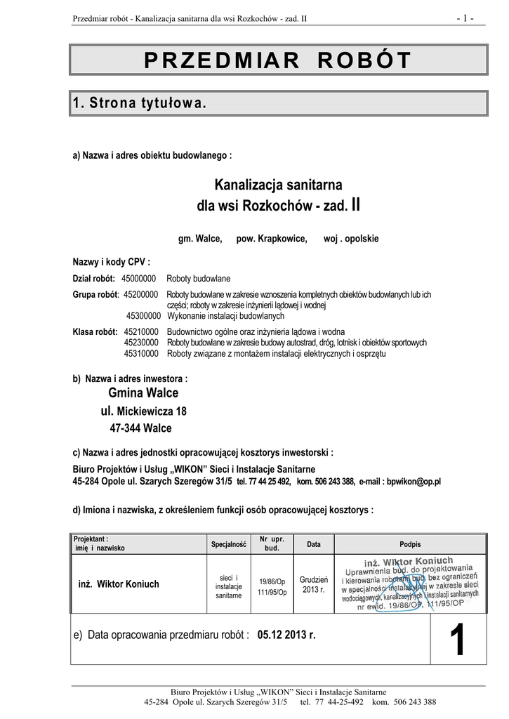 -1- Przedmiar robót - Kanalizacja sanitarna dla wsi Rozkochów - zad. II P R Z E D M IA R R O B Ó T 1. S trona tytułow a. a) Nazwa i adres obiektu budowlanego : Kanalizacja sanitarna dla wsi Rozkochów - zad. II gm. Walce, pow. Krapkowice, woj . opolskie Nazwy i kody CPV : Dział robót: 45000000 Roboty budowlane Grupa robót: 45200000 Roboty budowlane w zakresie wznoszenia kompletnych obiektów budowlanych lub ich części; roboty w zakresie inżynierii lądowej i wodnej 45300000 Wykonanie instalacji budowlanych Klasa robót: 45210000 Budownictwo ogólne oraz inżynieria lądowa i wodna 45230000 Roboty budowlane w zakresie budowy autostrad, dróg, lotnisk i obiektów sportowych 45310000 Roboty związane z montażem instalacji elektrycznych i osprzętu b) Nazwa i adres inwestora : Gmina Walce ul. Mickiewicza 18 47-344 Walce c) Nazwa i adres jednostki opracowującej kosztorys inwestorski : Biuro Projektów i Usług „WIKON” Sieci i Instalacje Sanitarne 45-284 Opole ul. Szarych Szeregów 31/5 tel. 77 44 25 492, kom. 506 243 388, e-mail : [email protected] d) Imiona i nazwiska, z określeniem funkcji osób opracowującej kosztorys : Projektant : imię i nazwisko inż. Wiktor Koniuch Specjalność Nr upr. bud. Data sieci i instalacje sanitarne 19/86/Op 111/95/Op Grudzień 2013 r. Podpis e) Data opracowania przedmiaru robót : 05.12 2013 r. 1 Biuro Projektów i Usług „WIKON” Sieci i Instalacje Sanitarne 45-284 Opole ul. Szarych Szeregów 31/5 tel. 77 44-25-492 kom. 506 243 388 Przedmiar robót - Kanalizacja sanitarna dla wsi Rozkochów - zad. II -2- 2. O gó lna ch arakterystyka ob iektu i ro bót. Przedmiar robót opracowano zgodnie z §6 Rozporządzeniem Min. Infrastruktury z dnia 02.09.2004 r. w sprawie szczegółowego zakresu i formy dokumentacji projektowej, specyfikacji technicznych wykonania i odbioru robót budowlanych oraz programu funkcjonalno-użytkowego (Dz.U. Nr 202 poz 2072) Podstawę sporządzenia kosztorysu inwestorskiego stanowiły : 1) Dokumentacja projektowa po zmianach 2) Specyfikacja techniczna wykonania i odbioru robót budowlanych 3) Założenia wyjściowe do kosztorysowania 4) Przedmiary robót Zgodnie z Rozp. Min. Infrastr. z dnia 2.09 2004 r. w tabelach przedmiaru robót nie uwzględniono robót tymczasowych – ziemnych, które są projektowane i wykonywane jako potrzebne do wykonania robót podstawowych, ale nie są przekazywane zamawiającemu i są usuwane po wykonaniu robót podstawowych. Dlatego wykonawca w cenie ułożenia 1 mb rurociągu powinien uwzględnić koszt wykonania robót ziemnych w oparciu o podane średnie głębokości jego ułożenia , wymagane szerokości wykopu oraz dokumentację geologiczną. Dla wsi Rozkochów zaprojektowano kanalizację sanitarną w układzie grawitacyjno-ciśnieniowym z 5 pompowniami ścieków. Pompownie te dopływające grawitacyjnie ścieki sanitarne przetłaczać będą do istn. systemu kanalizacyjnego w Walcach i dalej do oczyszczalni w Zdzieszowicach. Całość inwestycji podzielono na dwa zadania. Przedmiotem projektowanej inwestycji jest budowa kanalizacji sanitarnej dla wsi Rozkochów – zad. II obejmującej wykonanie części końcowych odcinków kanalów grawitacyjnych. Z przeprowadzonych badań podłoża gruntowego wynika, że na terenie wsi Rozkochów pod nadkładem gleby lub nasypu do głęb. 5,3 m p.p.t. zalegają grunty spoiste i niespoiste. Grunty spoiste reprezentowane są głównie przez gliny piaszczyste i gliny z przewarstwieniami piasku zaglinionego. Grunty niespoiste reprezentowane są głównie przez piaski różnoziarniste lub żwiry okresowo lekko zaglinione. Wodę gruntową w badanym podłożu stwierdzono w ul. Wiejskiej na głębokości 2,2 3,3 m p.p.t. Uwzględniając istniejące warunki gruntowo-wodne odwodnienie wykopów przewiduje się na odcinkach gdzie pojawi się w nich woda gruntowa oraz w przypadku gromadzenia się w wykopach wód opadowych. Dla gruntów piaszczystych obniżenie zwierciadła wody wykonać za pomocą igłofiltrów 50 mm wpłukiwanych w grunt (bez obsypki) dł. 4 m. o rozstawie igieł co 1,0÷1,5 m. Dla gruntów spoistych odwodnienie wykopów przewidziano jako bezpośrednie z dna wykopu za pomocą pompy spalinowej z przystawką samozasysającą z napędem spalinowym lub elektrycznym. Kanalizację sanitarną grawitacyjną prawie w całości przewidziano układać w wykopach pionowych umocnionych prefabrykowanymi obudowami stalowymi. Roboty ziemne w 90 % przewidziano wykonać mechanicznie. Ręczne wykopy w ilości ok. 10 % wykonywać należy w pobliżu istn. zabudowy, drzew, płotów, słupów gdy niemożliwe jest zachowanie wymaganych odległości oraz w miejscach skrzyżowań z istn. uzbrojeniem podziemnym. Na terenie użytków rolnych przed głębieniem wykopu należy z pasa robót zdjąć warstwę ziemi urodzajnej (humus) a po wykonaniu zasypki rozścielić z powrotem. Wmiejscach przejść pieszych i przejazdów dla pojazdów kołowych przewidziano ułożyć kładki na czas wykonywania robót. Odtworzenie nawierzchni dróg i chodników w pasie dróg powiatowych wykonać zgodnie z warunkami podanymi przez Starostwo Powiatowe w Krapkowicach. Pozostałe drogi o nawierzchni asfaltowej odtworzyć do stanu pierwotnego. Drogi ulepszone żwirem lub tłuczniem przewiduje się odtworzyć warstwą tłucznia kamiennego gr. 10 cm na szer. od 2 – 3 m jezdni. Pobocza dróg asfaltowych utwardzić warstwą żwiru gr. 10 cm, na szer. 1,0 m. Warstwy asfaltu z dróg przewidziano zdjąć poprzez sfrezowanie. Uzyskany materiał odwieźć do Wytwórni Mas Bitumicznych w Rzepcach celem przetworzenia na nowy materiał (odległość ok. 10 km) lub wykorzystać do wykonania nawierzchni dróg nieutwardzonych. Frezowanie nawierzchni dróg powiatowych : Na szerokości wykopu starą nawierzchnię sfrezować do podbudowy (gr. 6 cm) i w jej miejsce po ułożeniu rurociągu kanalizacyjnego wykonać nową nawierzchnię gr. 8 cm t.j. 4 cm warstwa wiążąca i 4 cm warstwa ścieralna. Natomiast