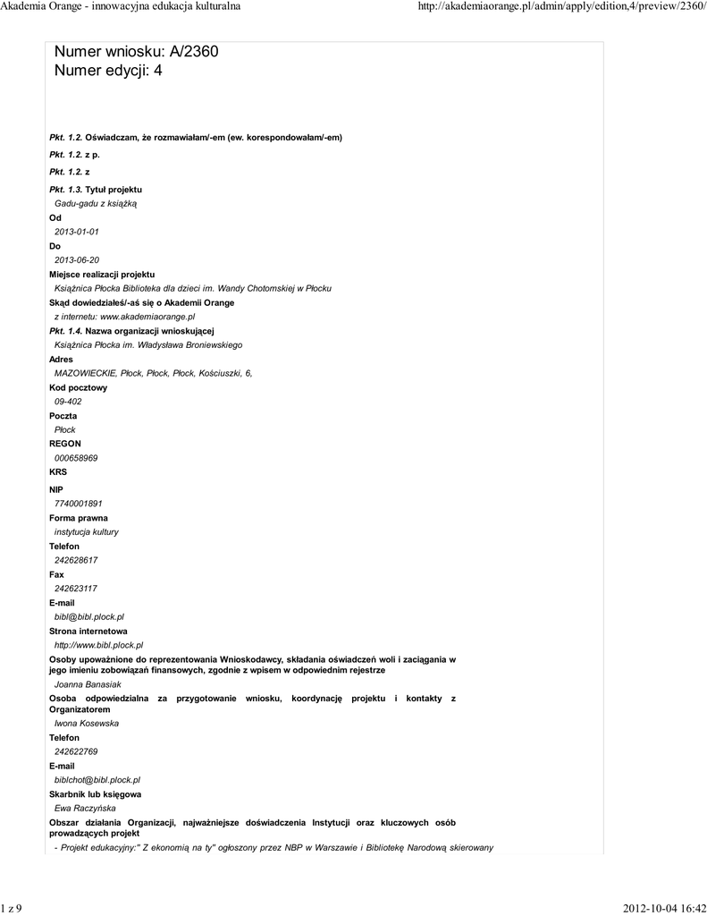 Akademia Orange - innowacyjna edukacja kulturalna 1z9 http://akademiaorange.pl/admin/apply/edition,4/preview/2360/ Numer wniosku: A/2360 Numer edycji: 4 Pkt. 1.2. Oświadczam, że rozmawiałam/-em (ew. korespondowałam/-em) Pkt. 1.2. z p. Pkt. 1.2. z Pkt. 1.3. Tytuł projektu Gadu-gadu z książką Od 2013-01-01 Do 2013-06-20 Miejsce realizacji projektu Książnica Płocka Biblioteka dla dzieci im. Wandy Chotomskiej w Płocku Skąd dowiedziałeś/-aś się o Akademii Orange z internetu: www.akademiaorange.pl Pkt. 1.4. Nazwa organizacji wnioskującej Książnica Płocka im. Władysława Broniewskiego Adres MAZOWIECKIE, Płock, Płock, Płock, Kościuszki, 6, Kod pocztowy 09-402 Poczta Płock REGON 000658969 KRS NIP 7740001891 Forma prawna instytucja kultury Telefon 242628617 Fax 242623117 E-mail [email protected] Strona internetowa http://www.bibl.plock.pl Osoby upoważnione do reprezentowania Wnioskodawcy, składania oświadczeń woli i zaciągania w jego imieniu zobowiązań finansowych, zgodnie z wpisem w odpowiednim rejestrze Joanna Banasiak Osoba odpowiedzialna Organizatorem za przygotowanie wniosku, koordynację projektu i kontakty z Iwona Kosewska Telefon 242622769 E-mail [email protected] Skarbnik lub księgowa Ewa Raczyńska Obszar działania Organizacji, najważniejsze doświadczenia Instytucji oraz kluczowych osób prowadzących projekt - Projekt edukacyjny:" Z ekonomią na ty" ogłoszony przez NBP w Warszawie i Bibliotekę Narodową skierowany 2012-10-04 16:42 Akademia Orange - innowacyjna edukacja kulturalna 2z9 http://akademiaorange.pl/admin/apply/edition,4/preview/2360/ do uczniów gimnazjalnych temat I edycja "Psychologia pieniądza"; II edycja "Pieniądze są tylko środkiem" realizatorzy: pracownicy Książnicy Płockiej - Wakacyjna edukacja dzieci i młodzieży w porozumieniu z Orange w obszarze bezpiecznego Internetu "Dziecko w sieci" z wykorzystaniem portalu "Sieciaki", "Biblioteka bezpieczne miejsce internetu- platforma e-learningowa - realizatorzy: pracownicy Książnicy Płockiej - 2007-2008 - Kurs dla seniorów "Oswajanie internetu" z udziałem mieszkańców Płocka - Cykliczne wakacyjne warsztaty komputerowe dla dzieci i młodzieży prowadzone w 13 filiach Książnicy Płockiej i Bibliotece dla dzieci - realizatorzy: pracownicy Książnicy Płockiej -Udział w wielu konkursach grantowych m.in. "Zainwestuj w siebie", "W krainie literatury i historii", Animacja czytelnictwa dziecięcego z dotacją Ministerstwa Kultury i Dziedzictwa Narodowego Urzędu Marszałkowskiego - Funduszu Grantowego dla Płocka -BIBWEB (udział w szkoleniach on-line) - pracownicy Książnicy Płockiej -Tworzenie baz internetowych zbiorów Książnicy Płockiej, filii i bibliotek powiatu płockiego w Mazowieckim Systemie Informacji Bibliotecznej - bibliotekarze Książnicy i powiatu - Biblioteczny Facebook, BLOG, Strona internetowa www.biblplock.pl - upowszechnienie czytelnictwa, działalność edukacyjno-oświatowa i wydawnicza -wszyscy pracownicy Forma prawna - inna - Projekt edukacyjny:" Z ekonomią na ty" ogłoszony przez NBP w Warszawie i Bibliotekę Narodową skierowany do uczniów gimnazjalnych temat I edycja "Psychologia pieniądza"; II edycja "Pieniądze są tylko środkiem" realizatorzy: pracownicy Książnicy Płockiej - Wakacyjna edukacja dzieci i młodzieży w porozumieniu z Orange w obszarze bezpiecznego Internetu "Dziecko w sieci" z wykorzystaniem portalu "Sieciaki", "Biblioteka bezpieczne miejsce internetu- platforma e-learningowa - realizatorzy: pracownicy Książnicy Płockiej - 2007-2008 - Kurs dla seniorów "Oswajanie internetu" z udziałem mieszkańców Płocka - Cykliczne wakacyjne warsztaty komputerowe dla dzieci i młodzieży prowadzone w 13 filiach Książnicy Płockiej i Bibliotece dla dzieci - realizatorzy: pracownicy Książnicy Płockiej -Udział w wielu konkursach grantowych m.in. "Zainwestuj w siebie", "W krainie literatury i historii", Animacja czytelnictwa dziecięcego z dotacją Ministerstwa Kultury i Dziedzictwa Narodowego Urzędu Marszałkowskiego - Funduszu Grantowego dla Płocka -BIBWEB (udział w szkoleniach on-line) - pracownicy Książnicy Płockiej -Tworzenie baz internetowych zbiorów Książnicy Płockiej, filii i bibliotek powiatu płockiego w Mazowieckim Systemie Informacji Bibliotecznej - bibliotekarze Książnicy i powiatu - Biblioteczny Facebook, BLOG, Strona internetowa www.biblplock.pl - upowszechnienie czytelnictwa, działalność edukacyjno-oświatowa i wydawnicza -wszyscy pracownicy Nazwa właściwego dokumentu, świadczącego o reprezentacji (KRS, akt mianowania, wypis z rejestru instytucji kultury) wypis z rejestru instytutcji kultury-5/99 Imię i nazwisko pełnomocnika wnioskodawcy, jeśli został wyznaczony Pkt. 1.5. Nazwa organizacji partnerskiej Gimnazjum nr 2 im. Orląt Lwowskich Adres MAZOWIECKIE, Płock, Płock, Płock, Jakubowskiego, 10, Kod pocztowy 09-402 Poczta Płock REGON 611051504 KRS NIP 7742662533 Forma prawna szkoła Osoby upoważnione do reprezentowania Organizacji, składania oświadczeń woli i zaciągania w jej imieniu zobowiązań finansowych, zgodnie z wpisem w odpowiednim rejestrze Katarzyna Rzeszotarska Obszar działania Organizacji, najważniejsze doświadczenia Instytucji oraz kluczowych osób prowadzących projekt Szkoła z niewielkim doświadczeniem udziału w konkursach i pozyskiwaniu środków zewnętrznych.Wyposażona w sieć internetową i bazę komputerową pozyskaną z Europejskiego Funduszu Społecznego. Umiejscowiona w starej dzielnicy miasta Płocka z młodzieżą dysfunkcyjną i trudną. Ich udział w projekcie zwiększy aktywność społeczną młodzieży, pokaże różne nowości technologiczne uatrakcyjniające trudny dla niektórych proces przyswajania wiedzy. Wskaże możliwości internetu i nauczy bezpiecznego korzystania. Pkt. 1.5. Nazwa organizacji partnerskiej Gimnazjum nr 6 im. prof. Władysława Szafera Adres MAZOWIECKIE, Płock, Płock, Płock, Jachowicza, 20, Kod pocztowy 09-402 Poczta 
