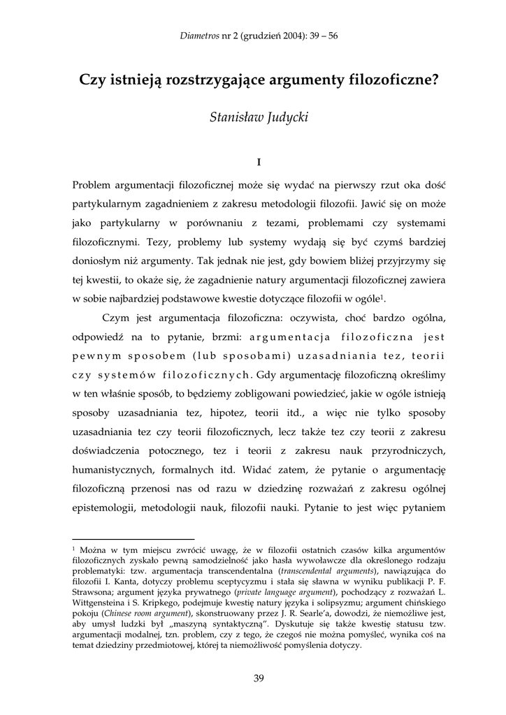 Diametros nr 2 (grudzie 2004): 39 – 56 Czy istniej rozstrzygaj ce argumenty filozoficzne? Stanisław Judycki I Problem argumentacji filozoficznej mo e si wyda na pierwszy rzut oka do partykularnym zagadnieniem z zakresu metodologii filozofii. Jawi si on mo e jako partykularny w porównaniu z tezami, problemami czy systemami filozoficznymi. Tezy, problemy lub systemy wydaj si by czym bardziej doniosłym ni argumenty. Tak jednak nie jest, gdy bowiem bli ej przyjrzymy si tej kwestii, to oka e si , e zagadnienie natury argumentacji filozoficznej zawiera w sobie najbardziej podstawowe kwestie dotycz ce filozofii w ogóle1. Czym jest argumentacja filozoficzna: oczywista, cho odpowied na to pytanie, brzmi: a r g u m e n t a c j a bardzo ogólna, filozoficzna jest pewnym sposobem (lub sposobami) uzasadniania tez, teorii c z y s y s t e m ó w f i l o z o f i c z n y c h . Gdy argumentacj filozoficzn okre limy w ten wła nie sposób, to b dziemy zobligowani powiedzie , jakie w ogóle istniej sposoby uzasadniania tez, hipotez, teorii itd., a wi c nie tylko sposoby uzasadniania tez czy teorii filozoficznych, lecz tak e tez czy teorii z zakresu do wiadczenia potocznego, tez i teorii z zakresu nauk przyrodniczych, humanistycznych, formalnych itd. Wida filozoficzn zatem, przenosi nas od razu w dziedzin e pytanie o argumentacj rozwa a z zakresu ogólnej epistemologii, metodologii nauk, filozofii nauki. Pytanie to jest wi c pytaniem Mo na w tym miejscu zwróci uwag , e w filozofii ostatnich czasów kilka argumentów filozoficznych zyskało pewn samodzielno jako hasła wywoławcze dla okre lonego rodzaju problematyki: tzw. argumentacja transcendentalna (transcendental arguments), nawi zuj ca do filozofii I. Kanta, dotyczy problemu sceptycyzmu i stała si sławna w wyniku publikacji P. F. Strawsona; argument j zyka prywatnego (private language argument), pochodz cy z rozwa a L. Wittgensteina i S. Kripkego, podejmuje kwesti natury j zyka i solipsyzmu; argument chi skiego pokoju (Chinese room argument), skonstruowany przez J. R. Searle’a, dowodzi, e niemo liwe jest, aby umysł ludzki był „maszyn syntaktyczn ”. Dyskutuje si tak e kwesti statusu tzw. argumentacji modalnej, tzn. problem, czy z tego, e czego nie mo na pomy le , wynika co na temat dziedziny przedmiotowej, której ta niemo liwo pomy lenia dotyczy. 1 39 Stanisław Judycki Czy istniej rozstrzygaj ce argumenty filozoficzne? filozoficznym, gdy metodami wła ciwymi dla tzw. nauk szczegółowych nie da si go ani postawi , ani jako rozstrzygn . Pomin w dalszym ci gu t kwesti pewnej, jak si wydaje, nie daj cej si unikn cyrkularno ci w trakcie prób odpowiedzi na pytanie, czym s argumenty filozoficzne, cyrkularno ci w tym sensie, e rozstrzygni cie, czym jest argumentacja filozoficzna, mo e si odby tylko za cen wyj cia poza rodzaje dyskursu charakterystyczne dla wiedzy potocznej, formalnej czy przyrodniczej i przej ciu do sfery najbardziej podstawowego my lenia teoretycznego, nazywanego my leniem filozoficznym. W tym kontek cie pojawia si bardzo cz sto sarkastyczna uwaga, i n i e istniej adne filozoficznych, rozstrzygaj ce sposoby uzasadniania tez adne rozstrzygaj ce sposoby argumentacji filozoficznej, gdy tysi cletnie dzieje filozofii ci gle obracaj si wokół tych samych zagadnie i adne z nich nie doczekało si definitywnego rozwi zania. Niektórzy uwa aj ten fakt za wr cz „ miertelny” argument przeciwko sensowno ci zajmowania si filozofi . W ród studiuj cych filozofi wiadomo nast puj cych po sobie, jak szklane paciorki, systemów, koncepcji i stanowisk, po pierwszym okresie fascynacji, przybiera z czasem posta relatywistycznego smutku lub pobła ania: po tylu wiekach rozwa a , chcieliby my przecie mie „czarno na białym” powiedziane, jak jest naprawd , chcieliby my „czarno na białym” wiedzie , co powinni my czyni i na co mo emy mie nadziej , jaka jest relacja pomi dzy tym, co ogólne a tym, co partykularne (spór o uniwersalia), czy istnieje Bóg, czym jest wolno , jaka jest relacja pomi dzy umysłem (dusz ) a ciałem itd. Skoro dot d filozofia nie dała rozstrzygaj cych argumentów na rzecz takiego lub innego rozwi zania, skoro zawsze istniej kontrargumenty – to t y m g o r z e j d l a f i l o z o f i i i nie warto si ni zajmowa . Reakcj stwierdzenie, na tego rodzaju sceptycyzm w stosunku do filozofii bywa e argumentacja filozoficzna to kwestia ci gle t r w a j c e j d y s k u s j i pomi dzy pokoleniami my licieli i e nie ma nic złego w tym, e dyskusja ta si nie ko czy. Według tego rozwi zania istnienie trwaj cej wieki dyskusji filozoficznej jest czym samym w sobie pozytywnym i wynika ma z istoty problemów filozoficznych, a mianowicie z ich tzw. „gł bi” i 40 Stanisław Judycki wielow tkowo ci, Czy istniej rozstrzygaj ce argumenty filozoficzne? która uniemo liwia znalezienie i sformułowanie rozstrzygaj cego argumentu na rzecz którego z mo liwych rozwi za . Trzeba jednak chyba stwierdzi , e tego rodzaju stanowisko posiada olbrzymi wad , a mianowicie p o z b a w i a n a s n a d z i e i n a d o w i e d z e n i e s i , j a k j e s t n a p r a w d , jak naprawd rzeczy maj si w wiecie i „ze wiatem”: musimy zadowoli si wył cznie dyskusj . A jednak, wydaje si , e ludzie nie tylko z natury d do prawdy i do wiedzy, lecz tak e, e chc m i e p r a w d , a nie tylko do niej d y . Innym rozwi zaniem jest przeniesienie kwestii rozstrzygni cia problemów filozoficznych do dziedziny psychologiczno-egzystencjalnej mniej wi cej w ten sposób, e mówi si , i ka dy, kto zajmuje si filozofi , musi sam dla siebie zdecydowa , które rozwi zanie uwa a za poprawne. Nie chodzi przy tym o tzw. decyzj , lecz o to, aby po rozwa eniu argumentów za jakim pozaracjonaln rozwi zaniem i przeciw niemu, i po dodaniu jakich własnych argumentów, zdecydowa si na teizm lub ateizm, na dualizm lub monizm antropologiczny, na determinizm lub indeterminizm, na miło bli niego lub egoizm itd. Mówi si wtedy, e niemo liwe s rozstrzygaj ce argumenty filozoficz