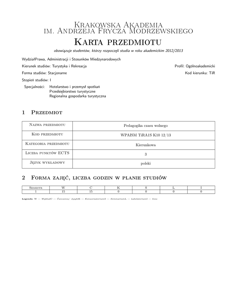 Krakowska Akademia im. Andrzeja Frycza Modrzewskiego Karta przedmiotu obowiązuje studentów, którzy rozpoczęli studia w roku akademickim 2012/2013 WydziałPrawa, Administracji i Stosunków Miedzynarodowych Kierunek studiów: Turystyka i Rekreacja Profil: Ogólnoakademicki Forma studiów: Stacjonarne Kod kierunku: TiR Stopień studiów: I Specjalności: 1 2 Hotelarstwo i przemysł spotkań Przedsiębiorstwo turystyczne Regionalna gospodarka turystyczna Przedmiot Nazwa przedmiotu Pedagogika czasu wolnego Kod przedmiotu WPAISM TiRA1S K10 12/13 Kategoria przedmiotu Kierunkowa Liczba punktów ECTS 3 Język wykładowy polski Forma zajęć, liczba godzin w planie studiów Semestr 1 W 15 C 15 K 0 S 0 Legenda: W — WykładC — Ćwiczenia/ JęzykiK — KonwersatoriumS — SeminariumL — LabolatoriumI — Inne L 0 I 0 Krakowska Akademia im. Andrzeja Frycza Modrzewskiego 3 Cele przedmiotu Cel 1 Po zakończeniu kursu uczestnik posiada podstawową wiedzę dotyczącą: Historii, klasyfikacji oraz problemów współczesnej turystyki i rekreacji w zakresie czasu wolnego 4 Wymagania wstępne 1 Posiada podstawową wiedzę z zakresu problemów współczesnej rekreacji oraz pedagogiki czasu wolnego oraz umiejętność rozumienia i analizowania zjawisk społecznych. 5 Modułowe efekty kształcenia MW1 posiada podstawową, uporządkowaną wiedzę o zjawisku czasu wolnego na przestrzeni dziejów ludzkości, o potrzebie człowieka jaką jest czas wolny, o różnorodnych uwarunkowaniach i czynnikach wpływających na organizację czasu wolnego. MW2 posiada podstawową wiedzę o celach, składowych i funkcjach czasu wolnego oraz o zależnościach zachodzących między sferą powinności a czasem wolnym. MW3 charakteryzuje rolę intencjonalnych i naturalnych środowisk wychowawczych w procesie wychowania i socjalizacji w czasie wolnym MU4 Analizuje wzory zachowań wolnoczasowych młodzieży i zagrożenia występujące w czasie wolnym wśród młodzieży sekty, subkultury itp. MU5 wykorzystuje metody badań stosowane w pedagogice do racjonalnego spędzania czasu wolnego MU6 projektuje organizowanie czasu wolnego w różnych grupach wiekowych i wskazuje na zagrożenia i oznaki płynące z nieprawidłowego gospodarowania czasem wolnym MK7 Analizuje wzory zachowań wolnoczasowych młodzieży i zagrożenia występujące w czasie wolnym wśród młodzieży sekty, subkultury itp., wykorzystuje metody badań stosowane w pedagogice do racjonalnego spędzania czasu wolnego, projektuje organizowanie czasu wolnego w różnych grupach wiekowych i wskazuje na zagrożenia i oznaki płynące z nieprawidłowego gospodarowania czasem wolnym MK8 Pracuje w grupie przyjmując w niej różne role, jest otwarty na poglądy innych i skłonny do podjęcia dyskusji na tematy związane z formami spędzania czasu wolnego w sektorze publicznym, społecznym i prywatnym 6 Treści programowe Lp W1 Wykład Tematyka zajęć Opis szczegółowy bloków tematycznych Podstawowe zdania i pojęcia pedagogiki czasu wolnego.Historia problematyki czasu wolnego.Klasyfikacja form wykorzystania wolnego czasu a jego efektywność. Znaczenie wychowawcze, zdrowotne i kulturotwórcze czasu wolnego. Wychowanie i przygotowanie do czasu wolnego i rekreacji naturalne i instytucjonalne(Uniwersytet Trzeciego Wieku, środki masowego przekazu, biuro podróży itd.). Zasady organizacji i prowadzenia zajęć kulturalno-rozrywkowych i sportowo-rekreacyjnych w czasie wolnym. Zapobieganie przejawom niewłaściwego spędzania czasu wolnego Razem Strona 2/5 Liczba godzin 15 15 Krakowska Akademia im. Andrzeja Frycza Modrzewskiego Lp C1 Ćwiczenia/ Języki Tematyka zajęć Opis szczegółowy bloków tematycznych 1.Formułowanie celów do racjonalnego spędzania czasu wolnego.2.Metody wychowania i ich dobór oraz przygotowanie do racjonalnego spędzania czasu wolnego3,.Organizacja rekreacji sektor publiczny, społeczny i prywatny w rekreacji4.Rola aktywnego spędzania czasu wolnego w promocji zdrowia profilaktyczne znaczenie zwiększonej aktywności ruchowej. 5.Czas wolny w rodzinie: sport na wczasach, turystyka rodzinna, rekreacja dziadków z wnukami itp.6.Przemiany społeczne a zmiany w sferze rekreacji (makdonaldyzacja czasu wolnego, centra handlowe i ich rola w zakresie organizacji rodzinnego spędzania czasu wolnego).7.Współczesne formy spędzania czasu wolnego. Razem 7 Metody dydaktyczne M5. M10. M16. M12. M7. M8. Dyskusja Prezentacje multimedialne Wykłady Sesje rozwiązywania problemu Konsultacje Praca w grupach 8 Obciążenie pracą studenta Liczba godzin 15 15 Średnia liczba godzin na zrealizowanie aktywności Forma aktywności Godziny kontaktowe z nauczycielem akademickim, w tym: Godziny wynikające z planu studiów 30 Konsultacje przedmiotowe 0 Egzaminy i zaliczenia w sesji 0 Godziny bez udziału nauczyciela akademickiego wynikające z nakładu pracy studenta, w tym: Przygotowanie się do zajęć, w tym studiowanie zalecanej literatury 20 Opracowanie wyników 5 Przygotowanie raportu, projektu, prezentacji, dyskusji 20 Sumaryczna liczba godzin dla przedmiotu wynikająca z 75 całego nakładu pracy studenta 3 Sumaryczna liczba punktów ECTS dla przedmiotu 9 Metody oceny Ocena podsumowująca P7. Test jednokrotnego wyboru Kryteria oceny Strona 3/5 Krakowska Akademia im. Andrzeja Frycza Modrzewskiego Na ocenę 3 Na ocenę 3.5 Na ocenę 4 Na ocenę 4.5 Na ocenę 5 10 Warunkiem zaliczenia modułu jest zaliczenie min. 50% testu oraz udział w dyskusji Warunkiem zaliczenia modułu jest zaliczenie min. 60% testu oraz udział i stopień aktywności w dyskusji Warunkiem zaliczenia modułu jest zaliczenie min. 70% testu oraz udział i stopień aktywności w dyskusji i przedstawienie prezentacji multimedialnej Warunkiem zaliczenia modułu jest zaliczenie min. 80% testu, oraz udział i stopień aktywności w dyskusji i przedstawienie prezentacji multimedialnej, przedstawienie projektu indywidualnego Warunkiem zaliczenia modułu jest zaliczenie min. 90% testu, przedstawienie p