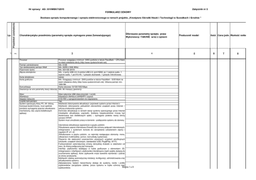 Nr sprawy: AD. 331/MIDI/7/2015 Załącznik nr 2 FORMULARZ CENOWY 1 Charakterystyka przedmiotu (parametry sprzętu wymagane przez Zamawiającego) Oferowane parametry sprzętu przez Wykonawcę: TAK/NIE wraz z opisem 3 2 Lp. Przedmiot zamówienia Dostawa sprzętu komputerowego i sprzętu elektronicznego w ramach projektu „Kreatywne Ośrodki Nauki i Technologii w Suwałkach i Grodnie ” Procesor osiągający minimum 6440 punktów w teście PassMark – CPU Mark na dzień składania oferty (http://www.cpubenchmark.net). Pamięć zainstalowana Min. 8 GB Typ zastosowanej pamięci RAM Min. DDR3 (1600 MHz) Pojemność dysku Min. 500 GB SATA Złącza zewnętrzne: Min.: 2 porty USB 3.0, 6 portów USB 2.0, port HDMI, po 1 wejście audio, 1 wyjście audio, 1 port RJ-45, 1 gniazdo słuchawek, 1 gniazdo mikrofonowe. Karta dźwiękowa stereo Karta graficzna Min. Osiągający minimum 2500 punktów w teście PassMark - G3D Mark na dzień składania oferty (http://www.cpubenchmark.net). Własna pamięć min. 1024 Mb Komunikacja Karta sieciowa 10/100/1000 Mbps Gwarancja na w/w parametry stacji roboczej: Min. 60 miesięcy gwarancji. Procesor Mysz Klawiatura Napędy Optyczne Czytnik kart pamięci: System operacyjny klasy PC, 64 -bitowy, licenacja bezterminowa, musi spełniać poniższe wymagania poprzez wbudowane mechanizmy, bez użycia dodatkowych aplikacji Mysz optyczna USB (dwa przyciski + scroll) Klawiatura USA/Euro (QWERTY Layout) DVD-RW z oprogramowaniem do nagrywania. Tak Możliwość dokonywania aktualizacji i poprawek systemu przez Internet z Możliwość dokonywania uaktualnień sterowników urządzeń przez Internet – witrynę producenta systemu. Darmowe aktualizacje w ramach wersji systemu operacyjnego przez Internet (niezbędne aktualizacje, poprawki, biuletyny bezpieczeństwa muszą być dostarczane bez dodatkowych opłat) – wymagane podanie nazwy strony serwera WWW. System musi umożliwiać pracę w domenie - podłączenie systemu do domeny. Internetowa aktualizacja zapewniona w języku polskim. Wbudowana zapora internetowa (firewall) dla ochrony połączeń internetowych; zintegrowana z systemem konsola do zarządzania ustawieniami zapory i regułami IP v4 i v6. Zlokalizowane w języku polskim, co najmniej następujące elementy: menu, odtwarzacz multimediów, pomoc, komunikaty systemowe. Wsparcie dla większości powszechnie używanych urządzeń peryferyjnych (drukarek, urządzeń sieciowych, standardów USB, Plug&Play, Wi-Fi). Funkcjonalność automatycznej zmiany domyślnej drukarki w zależności od sieci, do której podłączony jest komputer. Interfejs użytkownika działający w trybie graficznym z elementami 3D, zintegrowana z interfejsem użytkownika interaktywna część pulpitu służącą do uruchamiania aplikacji, które użytkownik może dowolnie wymieniać i pobrać ze strony producenta. Możliwość zdalnej automatycznej instalacji, konfiguracji, administrowania oraz aktualizowania systemu. Zabezpieczony hasłem hierarchiczny dostęp do systemu, konta i profile użytkowników zarządzane zdalnie; praca systemu w trybie ochrony kont Strona 1 z 9 użytkowników. 4 Producent/ model 5 Ilość Cena jedn. Wartość netto 6 7 8 1 Komputer stacjonarny z monitorem Zintegrowany z systemem moduł wyszukiwania informacji (plików różnego typu) dostępny z kilku poziomów: poziom menu, poziom otwartego okna systemu operacyjnego; system wyszukiwania oparty na konfigurowalnym przez użytkownika module indeksacji zasobów lokalnych. Zintegrowane z systemem operacyjnym narzędzia zwalczające złośliwe oprogramowanie; aktualizacje dostępne u producenta nieodpłatnie bez ograniczeń czasowych. Zintegrowany z systemem operacyjnym moduł synchronizacji komputera z urządzeniami zewnętrznymi. 16 Strona 2 z 9 0,00 zł Komputer stacjonarny z monitorem 1 Wbudowany system pomocy w języku polskim. Możliwość przystosowania stanowiska dla osób niepełnosprawnych (np. słabo widzących). Zarządzanie stacją roboczą poprzez polityki rozumiane jako zestaw reguł definiujących lub ograniczających funkcjonalność systemu lub aplikacji. Wdrażanie IPSEC oparte na politykach – wdrażanie IPSEC oparte na zestawach reguł definiujących ustawienia zarządzanych w sposób centralny. Automatyczne występowanie i używanie (wystawianie) certyfikatów PKI X.509. Wsparcie dla logowania przy pomocy smartcard. Rozbudowane polityki bezpieczeństwa – polityki dla systemu operacyjnego i dla wskazanych aplikacji. Posiadanie narzędzi służących do administracji, do wykonywania kopii zapasowych polityk i ich odtwarzania oraz generowania raportów z ustawień polityk. Wsparcie dla Sun Java i .NET Framework 1.1 i 2.0 i 3.0, 4.0, 5.0 – możliwość uruchomienia aplikacji działających we wskazanych środowiskach. Wsparcie dla JScript i VBScript – możliwość uruchamiania interpretera poleceń. Zdalna pomoc i współdzielenie aplikacji – możliwość zdalnego przejęcia sesji zalogowanego użytkownika celem rozwiązania problemu z komputerem. Monitor Czas reakcji: Rozdzielczość fizyczna: Kontrast / Jasność: Kąt widzenia CR>10: Rozwiązanie umożliwiające wdrożenie nowego obrazu poprzez zdalną instalację. Graficzne środowisko instalacji i konfiguracji. Transakcyjny system plików pozwalający na stosowanie przydziałów (ang. quota) na dysku dla użytkowników oraz zapewniający większą niezawodność i pozwalający tworzyć kopie zapasowe. Zarządzanie kontami użytkowników sieci oraz urządzeniami sieciowymi tj. drukarki, modemy, woluminy dyskowe, usługi katalogowe. Oprogramowanie dla tworzenia kopii zapasowych (backup); automatyczne wykonywanie kopii plików z możliwością automatycznego przywrócenia wersji wcześniejszej. Możliwość przywracania plików systemowych. System operacyjny musi posiadać funkcjonalność pozwalającą na identyfikację sieci komputerowych, do których jest podłączony, zapamiętywanie ustawień i przypisywanie do kategorii bezpieczeństwa (z p