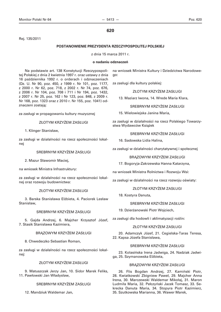 Monitor Polski Nr 64 — 5413 — Poz. 620 620 Rej. 135/2011 POSTANOWIENIE PREZYDENTA RZECZYPOSPOLITEJ POLSKIEJ z dnia 15 marca 2011 r. o nadaniu odznaczeń Na podstawie art. 138 Konstytucji Rzeczypospolitej Polskiej z dnia 2 kwietnia 1997 r. oraz ustawy z dnia 16 października 1992 r. o orderach i odznaczeniach (Dz. U. Nr 90, poz. 450, z 1999 r. Nr 101, poz. 1177, z 2000 r. Nr 62, poz. 718, z 2002 r. Nr 74, poz. 676, z 2006 r. Nr 104, poz. 708 i 711 i Nr 194, poz. 1432, z 2007 r. Nr 25, poz. 162 i Nr 123, poz. 848, z 2009 r. Nr 168, poz. 1323 oraz z 2010 r. Nr 155, poz. 1041) odznaczeni zostają: za zasługi w propagowaniu kultury muzycznej ZŁOTYM KRZYŻEM ZASŁUGI 1. Klinger Stanisław, za zasługi w działalności na rzecz społeczności lokalnej na wniosek Ministra Kultury i Dziedzictwa Narodowego: za zasługi dla kultury polskiej: ZŁOTYM KRZYŻEM ZASŁUGI 13. Maziarz Iwona, 14. Wrede Maria Klara, SREBRNYM KRZYŻEM ZASŁUGI 15. Wielowiejska Janina Maria, za zasługi w działalności na rzecz Polskiego Towarzystwa Wydawców Książek SREBRNYM KRZYŻEM ZASŁUGI 16. Sadowska Lidia Halina, za zasługi w działalności charytatywnej i społecznej SREBRNYM KRZYŻEM ZASŁUGI BRĄZOWYM KRZYŻEM ZASŁUGI 2. Mazur Sławomir Maciej, na wniosek Ministra Infrastruktury: za zasługi w działalności na rzecz społeczności lokalnej oraz rozwoju budownictwa: ZŁOTYM KRZYŻEM ZASŁUGI 17. Bogoryja-Zakrzewska Hanna Katarzyna, na wniosek Ministra Rolnictwa i Rozwoju Wsi: za zasługi w działalności na rzecz rozwoju oświaty: ZŁOTYM KRZYŻEM ZASŁUGI 18. Kostyra Danuta, 3. Barska Stanisława Elżbieta, 4. Paciorek Lesław Stanisław, SREBRNYM KRZYŻEM ZASŁUGI 5. Gajda Andrzej, 6. Majcher Krzysztof Józef, 7. Stasik Stanisława Kazimiera, BRĄZOWYM KRZYŻEM ZASŁUGI SREBRNYM KRZYŻEM ZASŁUGI 19. Dzierżanowski Piotr Wojciech, za zasługi dla hodowli i aklimatyzacji roślin: ZŁOTYM KRZYŻEM ZASŁUGI 20. Adamczyk Józef, 21. Cegielska-Taras Teresa, 22. Kapsa Józefa Stanisława, 8. Chwedeczko Sebastian Roman, SREBRNYM KRZYŻEM ZASŁUGI za zasługi w działalności na rzecz społeczności lokalnej: ZŁOTYM KRZYŻEM ZASŁUGI 9. Matuszczak Jerzy Jan, 10. Sidor Marek Feliks, 11. Pawłowski Jan Władysław, SREBRNYM KRZYŻEM ZASŁUGI 12. Mandziuk Waldemar Jan, 23. Kolasińska Irena Jadwiga, 24. Nadziak Jadwiga, 25. Szymanowska Elżbieta, BRĄZOWYM KRZYŻEM ZASŁUGI 26. Flis Bogdan Andrzej, 27. Kamiński Piotr, 28. Kwiatkowski Zbigniew Paweł, 29. Majcher Anna Irena, 30. Marczewski Waldemar Mikołaj, 31. Maron Ludmiła Maria, 32. Pełczyński Jacek Tomasz, 33. Sekrecka Danuta Maria, 34. Stopyra Piotr Kazimierz, 35. Szutkowska Marianna, 36. Wawer Marek, Monitor Polski Nr 64 — 5414 — na wniosek Ministra Zdrowia za zasługi dla polskiej onkologii: Poz. 620 BRĄZOWYM KRZYŻEM ZASŁUGI 59. Kagan Tadeusz Stanisław, 60. Leońska Joanna Wanda, ZŁOTYM KRZYŻEM ZASŁUGI 37. Bobek-Billewicz Barbara Władysława, 38. Miszczyk Leszek Janusz, 39. Składowski Krzysztof, 40. Szelc Stefan Andrzej, SREBRNYM KRZYŻEM ZASŁUGI 41. Ślosarek Krzysztof Tadeusz, na wniosek Wojewody Dolnośląskiego: za zasługi w działalności na rzecz osób potrzebujących pomocy: ZŁOTYM KRZYŻEM ZASŁUGI po raz drugi 42. Niedźwiedzki Tadeusz, ZŁOTYM KRZYŻEM ZASŁUGI 43. Czuchryta Jan, 44. Guła-Chorabik Danuta, 45. Wiśniarek Czesław, SREBRNYM KRZYŻEM ZASŁUGI 46. Dyl Grażyna, 47. Kosior Ryszard Stanisław, 48. Żurko Stanisław, za zasługi w działalności na rzecz Stowarzyszeń Naukowo-Technicznych NOT: ZŁOTYM KRZYŻEM ZASŁUGI po raz drugi 49. Nowicki Krzysztof Grzegorz, SREBRNYM KRZYŻEM ZASŁUGI 50. Gondek Janusz Krzysztof, 51. Kazubek Barbara Marianna, na wniosek Wojewody Kujawsko-Pomorskiego: za zasługi w działalności na rzecz przemian demokratycznych w Polsce: ZŁOTYM KRZYŻEM ZASŁUGI 61. Kaźmierczak Jerzy, 62. Kozikowski Janusz Marian, 63. Kustra Włodzimierz Marian, 64. Mozgowiec Edward, 65. Różański Antoni, BRĄZOWYM KRZYŻEM ZASŁUGI 66. Kłos Czesław, za zasługi w działalności społecznej i związkowej: ZŁOTYM KRZYŻEM ZASŁUGI 67. Trawiński Marek Piotr, SREBRNYM KRZYŻEM ZASŁUGI 68. Wcisło Sławomir Marian, BRĄZOWYM KRZYŻEM ZASŁUGI 69. Świętalski Ryszard Józef, na wniosek Wojewody Lubelskiego: za zasługi w działalności na rzecz społeczności lokalnej: ZŁOTYM KRZYŻEM ZASŁUGI 70. Sipkowski Janusz Felicjan, SREBRNYM KRZYŻEM ZASŁUGI za zasługi w działalności społecznej na rzecz samorządu lekarsko-weterynaryjnego ZŁOTYM KRZYŻEM ZASŁUGI 52. Batorczak Zofia, 53. Dogiel Leokadia Teresa, pośmiertnie 54. Opyrchał Adam, 71. Zawadowski Ryszard Stefan, za zasługi w działalności społecznej: ZŁOTYM KRZYŻEM ZASŁUGI 72. Borawski Witold, 73. Krzysiak Jan Władysław, SREBRNYM KRZYŻEM ZASŁUGI za zasługi w działalności na rzecz społeczności lokalnej: 74. Gąszczyk Marek Antoni, 75. Poczek Andrzej, ZŁOTYM KRZYŻEM ZASŁUGI za zasługi w działalności społecznej na rzecz ochrony przeciwpożarowej 55. Słoniowski Janusz, BRĄZOWYM KRZYŻEM ZASŁUGI SREBRNYM KRZYŻEM ZASŁUGI 56. Budzanowski Kazimierz Wiesław, 57. Zalewski Kazimierz Stanisław, 58. Zatoń Stanisław Jerzy, 76. Chlaściak Zbigniew Witold, 77. Gąska Jerzy, 78. Gransztof Ryszard Marian, 79. Kobyliński Eugeniusz, Monitor Polski Nr 64 — 5415 — Poz. 620 na wniosek Wojewody Łódzkiego: na wniosek Wojewody Opolskiego: za zasługi w działalności na rzecz honorowego krwiodawstwa za zasługi w działalności na rzecz ochrony przeciwpożarowej: ZŁOTYM KRZYŻEM ZASŁUGI ZŁOTYM KRZYŻEM ZASŁUGI 102. Mrowiec Andrzej Michał, 80. Kowalczyk Waldemar, SREBRNYM KRZYŻEM ZASŁUGI za zasługi w działalności na rzecz społeczności lokalnej 103. Wiesner Ewald Jan, ZŁOTYM KRZYŻEM ZASŁUGI BRĄZOWYM KRZYŻEM ZASŁUGI 81. Kruk Edward, 82. Marczak Bogdan Kazimierz, na wniosek Wojewody Mazowieckiego: za zasługi w działalności na rzecz Stowarzyszenia „Rodzina Policyjna 1939 r.”: 104. Kandziora Józef, 105. Klimas Al