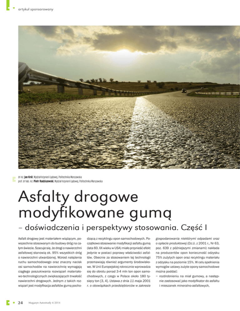 artykuł sponsorowany dr inż. Jan Król, Wydział Inżynierii Lądowej, Politechnika Warszawska prof. dr hab. inż. Piotr Radziszewski, Wydział Inżynierii Lądowej, Politechnika Warszawska Asfalty drogowe modyfikowane gumą – doświadczenia i perspektywy stosowania. Część I Asfalt drogowy jest materiałem wiążącym, powszechnie stosowanym do budowy dróg na całym świecie. Szacuje się, że drogi o nawierzchni asfaltowej stanowią ok. 95% wszystkich dróg o nawierzchni utwardzonej. Wzrost natężenia ruchu samochodowego oraz znaczny nacisk osi samochodów na nawierzchnię wymagają ciągłego poszukiwania rozwiązań materiałowo-technologicznych zwiększających trwałość nawierzchni drogowych. Jednym z takich rozwiązań jest modyfikacja asfaltów gumą pocho- 24 Magazyn Autostrady 4/2014 dzącą z recyklingu opon samochodowych. Początkowo stosowanie modyfikacji asfaltu gumą (lata 60. XX wieku w USA) miało przynieść efekt jedynie w postaci poprawy właściwości asfaltów. Obecnie za stosowaniem tej technologii przemawiają również argumenty środowiskowe. W Unii Europejskiej rokrocznie wprowadza się do obrotu ponad 3-4 mln ton opon samochodowych, z czego w Polsce około 180 tysięcy ton [3, 4]. Ustawa z dnia 11 maja 2001 r. o obowiązkach przedsiębiorców w zakresie gospodarowania niektórymi odpadami oraz o opłacie produktowej (Dz.U. z 2001 r., Nr 63, poz. 639 z późniejszymi zmianami) nakłada na producentów opon konieczność odzysku 75% zużytych opon oraz recyklingu materiału z odzysku na poziomie 15%. W celu spełnienia wymogów ustawy zużyte opony samochodowe można poddać: − rozdrobnieniu na miał gumowy, a następnie zastosować jako modyfikator do asfaltu i mieszanek mineralno-asfaltowych, artykuł sponsorowany Rys. 1. Schemat technologii dry process (na sucho) Rys. 2. Schemat technologii wet process (na mokro) − recyklingowi energetycznemu, czyli spalaniu całych lub pociętych opon w elektrowniach i cementowniach, − rozpuszczeniu w ekstrakcie furforolowym i dalszemu wykorzystaniu w przemyśle, − rozkładowi termicznemu metodą pirolizy, w wyniku czego otrzymuje się olej opałowy, sadzę, stal, włókna i gazy. Ze względu na dużą kaloryczność gumy przy spalaniu w Polsce około 60% recyklingu opon przeprowadza się metodą spalania w cementowniach [4]. Drugą najbardziej rozpowszechnioną metodą jest rozdrobnienie opon i uzyskanie miału i granulatu gumowego, który wykazuje olbrzymi potencjał stosowania jako modyfikator asfaltów. Modyfikacja asfaltów gumą Konwencjonalne niemodyfikowane lepiszcza asfaltowe charakteryzują się węższym zakresem lepkosprężystości niż asfalty modyfikowane, co może skutkować szybszym przechodzeniem w stan plastyczny w podwyższonej temperaturze otoczenia oraz zwiększoną kru- chością w temperaturze ujemnej. Powszechnie uważa się, że tylko modyfikacja asfaltów polimerami pozwala na budowę nawierzchni spełniających wymagania nawierzchni długowiecznych [1]. Na podstawie wieloletnich badań nad modyfikacją asfaltów można jednak stwierdzić, że doskonałą alternatywę stanowi modyfikacja asfaltu miałem gumowym ze zużytych opon samochodowych [2, 5]. Miał gumowy otrzymywany w wyniku rozdrobnienia opon może być stosowany do modyfikacji asfaltu w procesie „na mokro” (ang. wet process) lub może zostać dodany do mieszanki mineralno-asfaltowej jako jedna z frakcji kruszywa w procesie „na sucho” (ang. dry process). Istnieją również warianty pośrednie rozwiązań materiałowych, stosowania gumy z recyklingu, w technologii mieszanek mineralno-asfaltowych. Metody wprowadzania gumy do mieszanki mineralno-asfaltowej można podzielić następująco: • klasyczna metoda „na mokro” przy wytwórni mma, • lepiszcze wytwarzane w rafinerii metodą „na mokro” z polimerem SBS, Rys. 3. Schemat technologii modyfikacji mieszanki mineralno-asfaltowej granulatem gumowym z dodatkiem polioktenameru • koncentrat gumowo-asfaltowy, • klasyczna metoda „na sucho”, • metoda na sucho z aktywatorem chemicznym wspomagającym proces wiązania asfaltu i gumy. Doświadczenia w USA (głównie stany takie jak: Arizona, Kalifornia, Texas i Floryda), Portugalii, we Włoszech czy w Czechach są dowo- www.autostrady.elamed.pl 25 artykuł sponsorowany dem na to, że efektywna modyfikacja asfaltu gumą powoduje: − wzrost lepkości i poprawę lepkosprężystych właściwości lepiszcza, − zmniejszenie podatności lepiszcza na starzenie, − polepszenie właściwości lepiszcza w ujemnej temperaturze. Nawierzchnie wykonane z mieszanek mineralno-asfaltowych z lepiszczem modyfikowanym gumą w porównaniu z tradycyjnymi nawierzchniami wykazują: − polepszone właściwości przeciwpoślizgowe (zwiększona szorstkość), − zwiększoną trwałość (odporność na działanie czynników klimatycznych i cykliczne obciążenie), − zwiększoną odporność na spękania, − możliwość efektywnego zastosowania technologii obniżających hałas nawierzchni, − zmniejszone koszty eksploatacji nawierzchni drogowych. Poprawa właściwości technicznych mieszanek zawierających lepiszcze gumowo-asfaltowe, w porównaniu z mieszankami z tradycyjnym asfaltem, jest wynikiem korzystnych właściwości reologicznych tego lepiszcza oraz większej lepkości. Większa lepkość umożliwia zwiększenie ilości lepiszcza w mieszance, co wpływa korzystnie na odporność mieszanki mineralno-asfaltowej na działanie wody oraz zwiększa jej odporność na zmęczenie. Doświadczenia krajów stosujących technologię modyfikacji asfaltów gumą zarówno na drogach lokalnych, jak i na nawierzchniach autostrad pokazują, że mieszanki mineralnoasfaltowe spełniają oczekiwania inwestorów. Korzyści płynące ze zwiększonej odporności na spękania zmęczeniowe oraz możliwość wykonywania cieńszych warstw nawierzchni o podwyższonej trwałości są szczególnie istotne przy planowaniu remontów dróg i ulic.