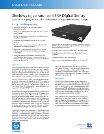 SPECYFIKACJA PRODUKTU Sieciowy rejestrator serii SRV Digital Sentry Standard kompresji H.264, pełna skalowalność oprogramowania oraz sprzętu Cechy charakterystyczne • Wydajność nagrywania do 280 Mbps ( kanały analogowe oraz IP) • Obsługa do 128 strumieni IP (w tym max do 64 kamer analogowych) • Platforma wyposażona fabrycznie w oprogramowanie zarządzające DS. NVs • Obsługa standardów kompresji H.264, MJPEG oraz MPEG-4 • Współpracuje z urządzeniami Pelco oraz kamerami i enkoderami innych producentów • Możliwość rozbudowy przez sieci o nieograniczoną ilość serwerów i enkoderów (limit dostępnego pasma sieciowego) • Zgodność z oprogramowaniem DS. Control Point, umożliwiającym jednoczesne monitorowanie spod poziomu tego samego interfejsu zarówno rejestratorów serii DS jak też serii DX Optymalizacja Nowy rejestrator sieciowy Digital Sentry ® Network Video Recorder (NVR) to efekt zoptymalizowania przez firmę Pelco platformy sprzętowej w celu zapewnienia odpowiedniej bazy dla oprogramowania zarządzającego DS NVs. W ten sposób obniżono koszty, a także ryzyko niepowodzenia integracji sprzętu i oprogramowania różnych producentów. Procesor II generacji Intel ® Core ™ i7 oraz 8 GB pamięci RAM, zapewnia rejestratorowi Digital Sentry NVR optymalne połączenie mocy przetwarzania i niezawodność. System jest w stanie obsłużyć do 128 strumieni wideo IP, a w tym maksymalnie do 64 sygnałów z kamer analogowych (opcjonalny enkoder ENC5416). Nowy DS NVR zapewnia całkowitą dostępną przepustowość na poziomie 280 Mbps przeznaczoną do nagrywania strumieni analogowych i IP oraz ich odtwarzanie i eksport za pośrednictwem klienta oprogramowania DS. ControlPoint. Istotnym argumentem jest to, że ustawienie maksymalnej liczba kamer w systemie oraz odpowiedniej poklatowości determinuje liczbę jednoczesnych połączeń klientów, liczbę strumieni, które mogą być oglądane w trybie odtwarzania na każdym kliencie, a także przepustowość wymaganą do obsługi połączeń klienta. • Monitorowanie stanu sieci oraz zdarzeń poprzez protokół SNMP (Simple Network Management Protocol) a także pakiet informacji o systemie (DSSI) • Kompatybilność z oprogramowanie DS. Archive Utility • Poklatkowość rejestracji ustawiana dla każdej kamery w systemie • Wsparcie integracji dla DS. DataPoint • Oprogramowanie zarządzające oraz 8 licencji dla kamer IP Dwa porty gigabitowe sieci umożliwiają wygodne planowanie architektury sieci, przeznaczając pierwszy port do komunikacji kamer IP, natomiast drugi wykorzystując do połączeń klientów. Dwa porty DVI-D zapewniają dogodne połączenie wysokiej rozdzielczości cyfrowych monitorów HD. Niezawodność Na panelu przednim dostępne są sloty dla łatwego serwisowania i modernizacji urządzenia. Rejestrator DS NVR dostępny jest w wersjach o pojemności dyskowej do 18 TB. Ilość minimum trzech dysków zapewni pracę w konfiguracji RAID 5. Dodatkowo istnieje możliwość połączenia pamięci zewnętrznej poprzez port USB lub przy użyciu opcjonalnej karty interfejsu DSSRV-SCSI podłączonej do macierzy DX8100HDDI. Panel przedni wyposażono dodatkowo w diody LED zapewniające szybką informację na temat działania systemu. Diody są zintegrowane z nowymi systemem diagnostycznym DigitalSentry (DSSI), który dostarcza krytyczne statystyki wykorzystania zasobów systemu, temperatury i stanu wydajności w czasie rzeczywistym. Niezależnie od tego czy rejestrator DS NVR funkcjonuje jako system autonomiczny, czy też stanowi część sieci serwerów, monitorowanie jego głównych ustawień następuje z interfejsu DS. ControlPoint użytkownika. System może pracować w kilku trybach: jako sieciowy rejestrator wideo, jako cyfrowy rejestrator wideo (DVR), lub też jako hybryda NVR. International Standards Organization Registered Firm; ISO 9001 Quality System C3443-PL / REVISED 2-12-10 SPECYFIKACJA TECHNICZNA Otwarta architektura I Podstawową zaletą systemów opartych o serię rejestratorów Digital Sentry jest pełna zgodność ONVIF oraz możliwa współpraca z wieloma urządzeniami IP. Użytkownicy mogą wybrać spośród kamery IP lub kodery różnych producentów, tak aby dopasować je do oczekiwanej funkcjonalności systemu. Nowa platforma DS SRV to propozycja integracji zarówno sygnałów analogowych jak i IP z wykorzystaniem jednego urządzenia. Nie zrezygnowano z funkcjonalności dodatkowo zyskując wysoką wydajność, niezawodność oraz otwartą architekturę. SPECYFIKACJA TECHNICZNA Połączenia System Procesor 2-ga gener. Intel ® Core ™ i7 System operacyjny Wind. 7 Ultimate 64-bit SP1 Pamięć 8 GB RAM Interfejs uźytkownika DS ControlPoint Pojemność dyskowa (JBOD or RAID 5*) DSSRV 500 GB, 3 TB, 6 TB, 9 TB, 12 TB, 15 TB, lub 18 TBDSSRV-DVD 500 GB, 3 TB, 6 TB, 9 TB, lub 12 TB RAID Level pamięć wewnętrzna RAID 5 (konieczny kontroler DS-SRV-RAID) Pamięć zewnętrzna do 24 TB JBOD lub RAID 5 DX8100HDDI (konieczna karta DSSRV-SCSI) Pamięci dyskowe DSSRV DSSRV-DVD 6 slotów 3.5-calowych 4 sloty 3.5-calowe Napędy optyczne DVD±RW z DSSRV-DVD *Konfiguracja dla pracy w systemie nadmiarowych macierzy dyskowych RAID 5 wymaga co najmniej 3 dysków twardych. Minimalne wymagania dla klienta PC Procesor 2ga gener. Intel®Core™i7 zintegrowaną kartą graficzną Pamięć ze 4 GB System operacyjny Windows XP Professional SP2, Windows Vista (32 or 64 bit), Windows 7 (32 lub 64 bit) *Oprogramowanie DS ControlPoint można uruchomić na serwerze, ma to jednak znaczący wpływ na wydajność pracy rejestratora DS SRV. Aby uzyskać optymalną wydajność DS ControlPoint należy uruchamiać na stacji klienta. Sieć Interfejs 2 Gigabit Ethernet RJ-45 (1000Base-T) Interfejsy dodatkowe (USB 2.0) 1 port USB 2.0 na panelu przednim 4 porty na tylnym panelu (2 USB 3.0; 2 USB 2.0) Zasilanie Moc wejściowa Zasilacz Pobór mocy 100 VAC / 50 Hz 110 VAC / 50 Hz 110 VAC / 60 Hz 115 VAC / 50 Hz 115 VAC / 