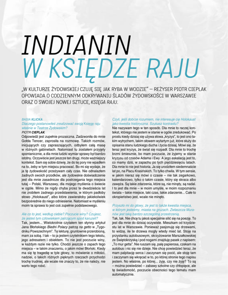 INDIANIN W KSIĘDZE RAJU „W KULTURZE ŻYDOWSKIEJ CZUJĘ SIĘ JAK RYBA W WODZIE” � REŻYSER PIOTR CIEPLAK OPOWIADA O CODZIENNYM ODKRYWANIU ŚLADÓW ŻYDOWSKOŚCI W WARSZAWIE ORAZ O SWOJEJ NOWEJ SZTUCE, KSIĘGA RAJU. BASIA KLICKA Dlaczego postanowiłeś zrealizować swoją Księgę raju właśnie w Teatrze Żydowskim? PIOTR CIEPLAK Odpowiedź jest zupełnie prozaiczna. Zadzwoniła do mnie Gołda Tencer, zaprosiła na rozmowę. Takich rozmów, inicjujących czy zapraszających, odbyłem całą masę w różnych gabinetach. Natomiast tu zostałem przyjęty spontanicznie, a dla mnie ludzki wymiar sprawy był bardzo istotny. Oczywiście jest jeszcze ten drugi, może ważniejszy kontekst. Sam się sobie dziwię, że do tej pory nie wpadłem na to, żeby w tym miejscu pracować. Bo mi się wydaje, że ja tę żydowskość przeżywam cały czas. Nie odnalazłem żadnych swoich przodków, ale żydowskie doświadczenie jest dla mnie zasadnicze dla postrzegania tego miejsca tutaj – Polski, Warszawy, dla mojego myślenia o świecie w ogóle. Mimo że nigdy chyba przez te dwadzieścia lat nie zrobiłem żadnego przedstawienia, w którym padłoby słowo „Holokaust”, albo które zawierałoby jakiekolwiek bezpośrednie do niego odniesienie. Natomiast w myśleniu moim ta sprawa to jest coś zupełnie podstawowego. Ale co to jest, według ciebie? Poczucie winy? Czujesz, że jesteś tym człowiekiem patrzącym spod karuzeli? Tak, jestem... Wielokrotnie czytałem ten słynny artykuł Jana Błońskiego Biedni Polacy patrzą na getto w „Tygodniku Powszechnym”. Tę lekturę, gruntownie przerobioną, mam za sobą. I tak – to ja jestem czytelnikiem tego tekstu, jego adresatem i obiektem. To nie jest poczucie winy, w każdym razie nie tylko. Chodzi jeszcze o zapach tego miejsca – w takim znaczeniu, o jakim mówi Błoński. Kiedy ma się tę tragedię w tyle głowy, to mówienie o miłości, nadziei, o takich różnych pięknych rzeczach przychodzi trochę trudniej, ale wcale nie znaczy to, że nie należy, nie warto tego robić. Czyli, jeśli dobrze rozumiem, nie interesuje cię Holokaust jako kwestia historyczna. Szukasz kontrastu? Nie nazywam tego w ten sposób. Dla mnie to raczej kontekst, którego nie jestem w stanie w ogóle zredukować. Po prostu kiedy dzisiaj się używa słowa „kryzys”, to jest ono takim wytrychem, takim słowem wytartym już, które służy do opisania stanu ludzkiego ducha i życia dzisiaj. Mówi się, że teraz jest kryzys, że świat się rozpadł. Dla mnie to trochę brzmi śmiesznie, bo mam poczucie, że żyjemy w stanie kryzysu od czasów Adama i Ewy. A jego eskalacją jest to, co mamy dziś, w zapachu po tych pięćdziesięciu latach. Dla mnie to nie jest historia. Ja się urodziłem siedemnaście lat po, na Placu Krasińskich. To tylko chwila. W tym sensie, w jakim nieraz się mówi o czasie – nie tak zegarkowo, kalendarzowo, tylko o takim czasie, który się skraca albo zawęża. Są takie zdarzenia, które są, nie minęły, są nadal. I to jest dla mnie – w moim umyśle, w moim rozpoznaniu świata – takie miejsce, taki czas, takie zdarzenie... Całe to okropieństwo jest, wcale nie minęło. Przyszło mi do głowy, że jest to także kwestia miejsca, w którym jesteśmy, miasta na gruzach. Zwłaszcza Muranów jest taką bardzo szczególną przestrzenią. Tak, tak. Nie chcę tu jakoś specjalnie silić się na poezję. To jest dla mnie do dzisiaj oczywiste. Mieszkam od trzydziestu lat w Warszawie. Ponieważ pasjonuję się drzewami, to widzę, ile te drzewa mogły wtedy mieć lat. Stoję na przystanku autobusowym, skrzyżowanie Marszałkowskiej ze Świętokrzyską i pod nogami znajduję pasek z napisem: „To mur getta”. Nie ruszam się, palę papierosa, czekam na autobus i nic się nie dzieje. Nie chcę powiedzieć teraz, że mam palpitację serca i zaczynam się pocić, ale stoję tam i zaczynam się wkręcać w to, po której stronie tego napisu jestem. No właśnie, po której... żyję, czy nie żyję? To są – można powiedzieć – zabawy szkolne czy chłopięce, ale tę świadomość, poczucie obecności tego tematu mam automatycznie. Wracając jednak do twojej pracy w Teatrze Żydowskim i wybranego przez ciebie utworu literackiego. Zdecydowałeś się na książkę Icyka Mangera, na jej podstawie przygotowałeś spektakl. Co urzekło cię w tym tekście? Nie znałem go wcześniej. Otrzymałem go w pakiecie, z paroma innymi, po tej pierwszej rozmowie z Gołdą Tencer. No i nie musiałem nawet doczytywać do końca, żeby podjąć decyzję. Wystarczyła tylko, jak powiada Gombrowicz, łyżka zupy, żeby się przekonać o jej smaku. Więc dojechałem do połowy i stwierdziłem: tak, to jest żywioł teatralny, filozoficzny. Taki sposób opowiadania o świecie dla mnie zupełnie oczywisty. Dla mnie i dla Andrzeja Witkowskiego, scenografa, który jest w tym i w wielu wcześniejszych przedsięwzięciach drugą półkulą mózgu. Musiałem podejmować decyzje dotyczące spektaklu wspólne z nim – stąd pytałem go, czy my to będziemy robić, czy jego to interesuje. Zagaduję go kiedyś w tej sprawie i mam kłopoty z przypomnieniem sobie nazwiska autora książki, tego Mangera. Coś zmyślam, że autor nazywa się Mangier, czy jakoś podobnie, a Andrzej wchodzi mi w słowo i mówi: „Słuchaj, jeśli to jest ta książka o tym, że wszystko się dzieje w raju, to tak.” Okazało się, że to jest jego kultowa książka z dzieciństwa. Więc ta nasza wspólna bliskość, czy to „bycie rybami w wodzie”, to jest coś, co dodatkowo jeszcze Andrzej Witkowski potwierdza swoim tu działaniem. Zdaję sobie sprawę, że to może brzmieć zupełnie obrazoburczo albo przemądrzale dla kogoś, kto studiuje, jest prawdziwie zanurzony w kulturze żydowskiej, który widzi w niej całą oczywistą masę niuansów, odmienności, takiej specyfiki nieprzetłumaczalnej na żadną inną kulturę. Mam tego świadomość, nie uważam siebie za eksperta. Mów