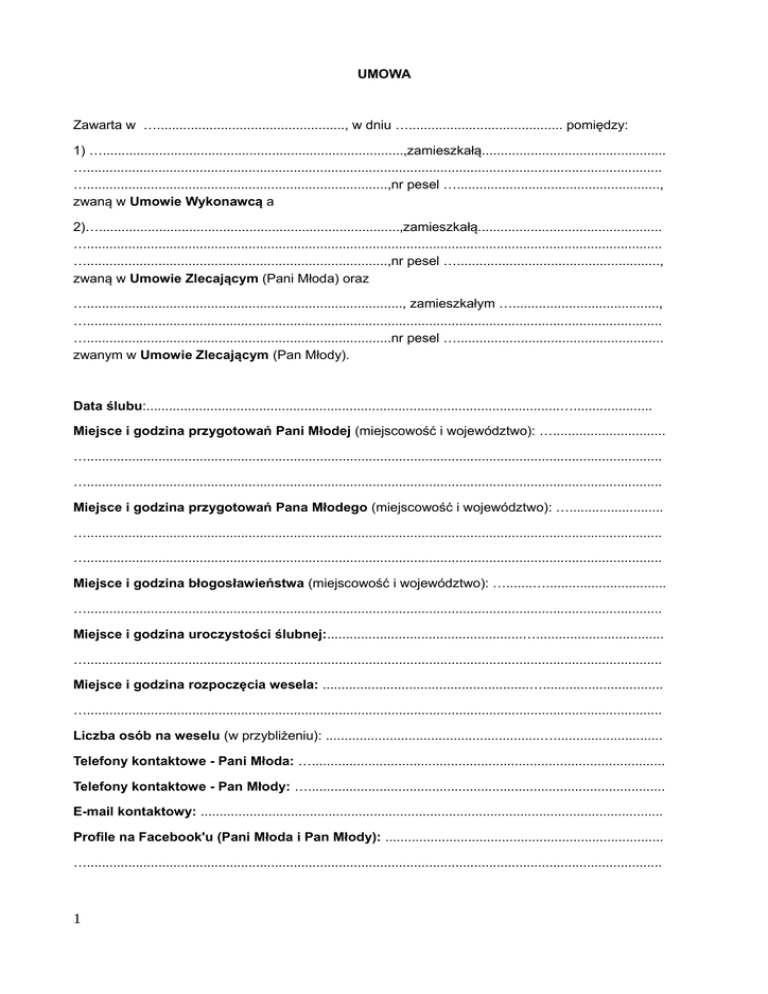 UMOWA Zawarta w ….................................................., w dniu …......................................... pomiędzy: 1) …................................................................................,zamieszkałą................................................. …......................................................................................................................................................... …................................................................................,nr pesel …......................................................, zwaną w Umowie Wykonawcą a 2)…................................................................................,zamieszkałą................................................. …......................................................................................................................................................... …................................................................................,nr pesel …......................................................, zwaną w Umowie Zlecającym (Pani Młoda) oraz …...................................................................................., zamieszkałym …......................................., …......................................................................................................................................................... ….................................................................................nr pesel …....................................................... zwanym w Umowie Zlecającym (Pan Młody). Data ślubu:..............................................................................................................…..................... Miejsce i godzina przygotowań Pani Młodej (miejscowość i województwo): ….............................. …......................................................................................................................................................... …......................................................................................................................................................... Miejsce i godzina przygotowań Pana Młodego (miejscowość i województwo): …......................... …......................................................................................................................................................... …......................................................................................................................................................... Miejsce i godzina błogosławieństwa (miejscowość i województwo): ….......…................................ …......................................................................................................................................................... Miejsce i godzina uroczystości ślubnej:....................................................….................................. …......................................................................................................................................................... Miejsce i godzina rozpoczęcia wesela: .......................................................…................................ …......................................................................................................................................................... Liczba osób na weselu (w przybliżeniu): .........................................................…............................. Telefony kontaktowe - Pani Młoda: ….............................................................................................. Telefony kontaktowe - Pan Młody: …............................................................................................... E-mail kontaktowy: ........................................................................................................................... Profile na Facebook'u (Pani Młoda i Pan Młody): .......................................................................... …......................................................................................................................................................... 1 &1 - Przedmiot wykonania dzieła: Wykonawca zobowiązuje się do wykonania dzieła dla Zlecającego polegającego na fotograficznym udokumentowaniu przebiegu uroczystości ślubnej, która odbędzie się w dniu ………………………………….., zgodnie z miejscem i godzinami podanymi w niniejszej umowie. Wykonawca zobowiązuje się również do przygotowania zdjęć zgodnie ze szczegółowym wykazem w &2 – Forma przekazania dzieła. Wykonawca zobowiązuje się do wykonania zdjęć z: • przygotowań …...................................... (Pani Młodej / Pana Młodego / Państwa Młodych), • błogosławieństwa, • uroczystości ślubnej, • zabawy weselnej do godziny 22:00, Obie strony Umowy stwierdzają, że ustalony zakres usług jest zgodny ze wszystkimi życzeniami Zleceniodawcy. &2 - Forma przekazania dzieła: Zdjęcia zostaną przekazane Zlecającemu w postaci: • 150 fotografii w wersji elektronicznej (na płycie BD) profesjonalnie wyretuszowanych oraz przygotowanych do druku w wysokiej rozdzielczości &3 - Termin przekazania dzieła: Przekazanie przygotowanego materiału zgodnie z &2 – Forma przekazania dzieła niniejszej umowy, nastąpi w terminie do 60 dni od daty ślubu. &4 Wynagrodzenie Sesja zdjęciowa jest nagrodą w konkursie organizowanym przez Klaudia Cieplińska – Fotografia Uroczystości Ślubnych. W związku z powyższym nie jest pobierane żadne wynagrodzenie przez Wykonawcę. W przypadku nagłej choroby, czy też złego stanu zdrowia Wykonawcy i niemożliwości wykonania dzieła w ustalonych terminach, dopuszcza się wyznaczenie innego fotografa jako zastępstwo do realizacji przedmiotu umowy. Zlecający może odmówić i odstąpić od U