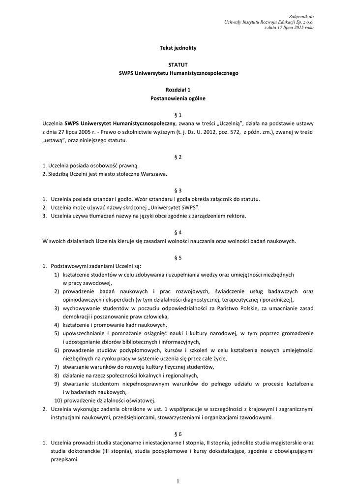 1 Tekst jednolity STATUT SWPS Uniwersytetu