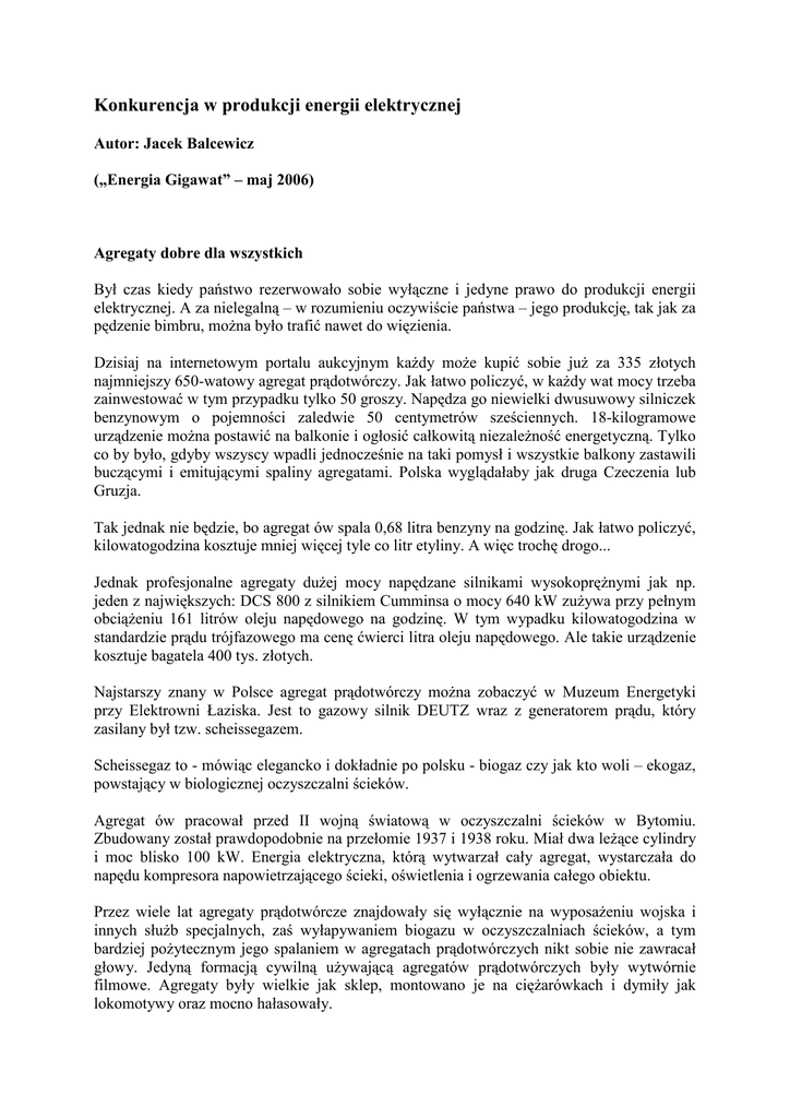 Konkurencja w produkcji energii elektrycznej Autor: Jacek Balcewicz („Energia Gigawat” – maj 2006) Agregaty dobre dla wszystkich Był czas kiedy państwo rezerwowało sobie wyłączne i jedyne prawo do produkcji energii elektrycznej. A za nielegalną – w rozumieniu oczywiście państwa – jego produkcję, tak jak za pędzenie bimbru, moŜna było trafić nawet do więzienia. Dzisiaj na internetowym portalu aukcyjnym kaŜdy moŜe kupić sobie juŜ za 335 złotych najmniejszy 650-watowy agregat prądotwórczy. Jak łatwo policzyć, w kaŜdy wat mocy trzeba zainwestować w tym przypadku tylko 50 groszy. Napędza go niewielki dwusuwowy silniczek benzynowym o pojemności zaledwie 50 centymetrów sześciennych. 18-kilogramowe urządzenie moŜna postawić na balkonie i ogłosić całkowitą niezaleŜność energetyczną. Tylko co by było, gdyby wszyscy wpadli jednocześnie na taki pomysł i wszystkie balkony zastawili buczącymi i emitującymi spaliny agregatami. Polska wyglądałaby jak druga Czeczenia lub Gruzja. Tak jednak nie będzie, bo agregat ów spala 0,68 litra benzyny na godzinę. Jak łatwo policzyć, kilowatogodzina kosztuje mniej więcej tyle co litr etyliny. A więc trochę drogo... Jednak profesjonalne agregaty duŜej mocy napędzane silnikami wysokopręŜnymi jak np. jeden z największych: DCS 800 z silnikiem Cumminsa o mocy 640 kW zuŜywa przy pełnym obciąŜeniu 161 litrów oleju napędowego na godzinę. W tym wypadku kilowatogodzina w standardzie prądu trójfazowego ma cenę ćwierci litra oleju napędowego. Ale takie urządzenie kosztuje bagatela 400 tys. złotych. Najstarszy znany w Polsce agregat prądotwórczy moŜna zobaczyć w Muzeum Energetyki przy Elektrowni Łaziska. Jest to gazowy silnik DEUTZ wraz z generatorem prądu, który zasilany był tzw. scheissegazem. Scheissegaz to - mówiąc elegancko i dokładnie po polsku - biogaz czy jak kto woli – ekogaz, powstający w biologicznej oczyszczalni ścieków. Agregat ów pracował przed II wojną światową w oczyszczalni ścieków w Bytomiu. Zbudowany został prawdopodobnie na przełomie 1937 i 1938 roku. Miał dwa leŜące cylindry i moc blisko 100 kW. Energia elektryczna, którą wytwarzał cały agregat, wystarczała do napędu kompresora napowietrzającego ścieki, oświetlenia i ogrzewania całego obiektu. Przez wiele lat agregaty prądotwórcze znajdowały się wyłącznie na wyposaŜeniu wojska i innych słuŜb specjalnych, zaś wyłapywaniem biogazu w oczyszczalniach ścieków, a tym bardziej poŜytecznym jego spalaniem w agregatach prądotwórczych nikt sobie nie zawracał głowy. Jedyną formacją cywilną uŜywającą agregatów prądotwórczych były wytwórnie filmowe. Agregaty były wielkie jak sklep, montowano je na cięŜarówkach i dymiły jak lokomotywy oraz mocno hałasowały. Dwa powody Brało się to z dwóch zasadniczych powodów: duŜej niedoskonałości i niskiej sprawności oraz zawodności dostępnych na polskim rynku zespołów prądotwórczych oraz tego, Ŝe... bez prądu dało się Ŝyć. Większość strategicznych nawet obiektów obywała się co najwyŜej dwustronnym zasilaniem. Nawet w Ŝołnierskich izbach liniowych jednostek rezerwowym źródłem światła była... lampa naftowa, zaś pudełko zapałek jako najbardziej strategiczne narzędzie w tym zestawie przechowywano w dołączonych obok zaplombowanych brezentowych woreczkach. W połowie lat osiemdziesiątych szokiem dla wszystkich była ekipa japońskiej telewizji, która zaimprowizowała swoje studio otwarte wprost na płycie Placu Czerwonego w Moskwie, źródłem energii dla dwóch reflektorów był agregat wielkości dwóch walizek dyplomatek. Kompaktowy i cichobieŜny. Gospodarze nie mogli pojąć, jak Japończycy radzą sobie bez wynajęcia studia w centrum telewizyjnym na Ostankino czy choćby apartamentu w hotelu „Rossija” z balkonem wychodzącym na sobór Wasyla Błogosławionego. W Polsce przełomem był czas realizacji przez Stevena Spielberga „Listy Schindlera”. Na potrzeby realizacji tego filmu, współprodukująca obraz polska firma Heritage Films Lwa Rywina sprowadziła ze Szwecji cichobieŜny agregat prądotwórczy firmy Volvo Penta. Agregat zamontowany był na niewielkiej przyczepce - wprawdzie dwuosiowej, ale pozwalającej ciągnąć go za samochodem osobowym. Nie tylko był cichobieŜny, ale posiadał katalityczne dopalanie spalin, tak Ŝe tylko drgające ciepłe powietrze nad kominkiem odprowadzającym spaliny sygnalizowało, Ŝe urządzenie pracuje. Datą istotną był rok 2000. Obawa, Ŝe nietypowa data moŜe spowodować globalną awarię energetyczną, wywołała zakrojone na szeroka skalę przedsięwzięcia umownie nazwane „problemem roku 2000”. W ramach tej akcji wiele instytucji o podstawowym znaczeniu dla gospodarki jak banki, szpitale, centra handlowe czy istotne urzędy zostało wyposaŜonych w wysokosprawne agregaty awaryjne. Skuteczne uzupełnienie Agregaty, niezaleŜnie od mocy (od kilkuset watów do pół MW), moŜna podzielić na kilka kategorii. Są więc agregaty awaryjne, tzn. takie które w wypadku awaryjnego zaniku zasilania, muszą niezawodnie w jak najkrótszym okresie przejąć na siebie zasilanie. Takie agregaty instalowane są w szpitalach, centrach handlowych, przy terminalach paliwowych, a takŜe w elektrowniach atomowych i konwencjonalnych. Ich przeciwstawieniem są agregaty przeznaczone do pracy ciągłej. W tym przypadku nieistotny jest czas startu, natomiast liczy się przede wszystkim niezawodność długotrwałej pracy pod stałym obciąŜeniem. Tego typu urządzenia pracują np. w oczyszczalniach ścieków i przy wysypiskach śmieci, gdzie biogaz zamieniany jest na energię elektryczną, na placach budowy, w rolnictwie, wszędzie tam gdzie są potrzeby energetyczne, a nie ma moŜliwości podłączenia do sieci stacjonarnej lub takie podłączenie jest po prostu nieopłacalne. Agregaty zestawia się np. z masztami oświetleniowymi, stosowanymi na tymczasow