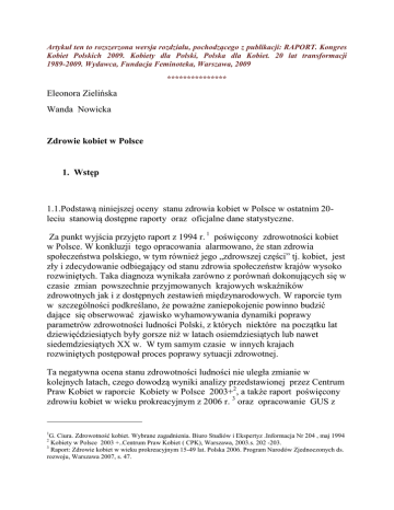Artykuł ten to rozszerzona wersja rozdziału, pochodzącego z publikacji: RAPORT. Kongres Kobiet Polskich 2009. Kobiety dla Polski, Polska dla Kobiet. 20 lat transformacji 1989-2009. Wydawca, Fundacja Feminoteka, Warszawa, 2009 *************** Eleonora Zielińska Wanda Nowicka Zdrowie kobiet w Polsce 1. Wstęp 1.1.Podstawą niniejszej oceny stanu zdrowia kobiet w Polsce w ostatnim 20leciu stanowią dostępne raporty oraz oficjalne dane statystyczne. Za punkt wyjścia przyjęto raport z 1994 r. 1 poświęcony zdrowotności kobiet w Polsce. W konkluzji tego opracowania alarmowano, że stan zdrowia społeczeństwa polskiego, w tym również jego „zdrowszej części” tj. kobiet, jest zły i zdecydowanie odbiegający od stanu zdrowia społeczeństw krajów wysoko rozwiniętych. Taka diagnoza wynikała zarówno z porównań dokonujących się w czasie zmian powszechnie przyjmowanych krajowych wskaźników zdrowotnych jak i z dostępnych zestawień międzynarodowych. W raporcie tym w szczególności podkreślano, że poważne zaniepokojenie powinno budzić dające się obserwować zjawisko wyhamowywania dynamiki poprawy parametrów zdrowotności ludności Polski, z których niektóre na początku lat dziewięćdziesiątych były gorsze niż w latach osiemdziesiątych lub nawet siedemdziesiątych XX w. W tym samym czasie w innych krajach rozwiniętych postępował proces poprawy sytuacji zdrowotnej. Ta negatywna ocena stanu zdrowotności ludności nie uległa zmianie w kolejnych latach, czego dowodzą wyniki analizy przedstawionej przez Centrum Praw Kobiet w raporcie Kobiety w Polsce 2003+2, a także raport poświęcony zdrowiu kobiet w wieku prokreacyjnym z 2006 r. 3 oraz opracowanie GUS z 1 G. Ciura. Zdrowotność kobiet. Wybrane zagadnienia. Biuro Studiów i Ekspertyz .Informacja Nr 204 , maj 1994 Kobiety w Polsce 2003 +..Centrum Praw Kobiet ( CPK), Warszawa, 2003.s. 202 -203. 3 Raport: Zdrowie kobiet w wieku prokreacyjnym 15-49 lat. Polska 2006. Program Narodów Zjednoczonych ds. rozwoju, Warszawa 2007, s. 47. 2 2007 r. „Kobiety w Polsce” 4. W raportach tych podkreślano, że sytuacja zdrowotna w Polsce jest nadal gorsza niż w krajach Europy Zachodniej. Pomimo wzrostu przeciętnej długości trwania życia, zmniejszeniu się umieralności kobiet w wieku rozrodczym, Polacy żyją przeciętnie znacznie krócej, niż mieszkańcy Zachodu. Zwracano równocześnie uwagę, że kobiety wprawdzie żyją dłużej niż mężczyźni, lecz częściej chorują, który to fakt nie jest wystarczająco brany pod uwagę w polityce zdrowotnej państwa. 1.2. Przeprowadzona blisko 10 lat temu zmiana systemu ochrony zdrowia w Polsce, a zwłaszcza zasad jego finansowania, miała odwrócić tę niekorzystną tendencję poprzez m.in. zwiększenie dostępności opieki zdrowotnej. Z informacji Rządu RP przedstawionej Sejmowi w 2007 r. wynika jednak, że w pierwszych latach wprowadzania reformy dostępność do świadczeń opieki zdrowotnej nie uległa poprawie. Co więcej, istotny wzrost środków przeznaczanych na ochronę zdrowia nie został wykorzystany do przeprowadzenia racjonalnych i konstruktywnych zmian w systemie po ujawnieniu się jego niedoskonałości, lecz w znacznym mierze „poszedł na zmarnotrawienie i utrwalenie wielu nieprawidłowości”5. Niedostatki systemu ochrony zdrowia w Polsce są bolączką wszystkich obywateli, zarówno kobiety jak i mężczyzn. Funkcje biologiczne kobiet6oraz fakt, że żyją dłużej, sprawia jednak, że kobiety częściej niż mężczyźni muszą korzystać z tej opieki. W związku z tym negatywne skutki reformy dotykają je w większym stopniu niż mężczyzn. Z art. 68 Konstytucji RP wynika, że system ochrony zdrowia powinien być tak zorganizowany, aby zapewniał wszystkim, na zasadzie równości, odpowiednią opiekę medyczną. W praktyce oznacza to, że system ochrony zdrowia powinien uwzględniać specyficzne potrzeby danej grupy społecznej, co wymaga prowadzenia badań porównawczych uwzględniających perspektywę płci (gender mainstreaming). 4 Kobiet w Polsce. GUS. Warszawa 2007. Informacja Rządu na temat obecnej sytuacji ochrony zdrowia w Polsce . Druk Sejmowy nr 176 z dnia 21 czerwca 2008 r. s. 3. 6 Konsekwencją tego jest fakt, że niektóre problemy zdrowotne występujące tylko u kobiet albo mają dla nich inne niż dla mężczyzn znaczenie i konsekwencje. Dotyczy to w szczególności problemów związanych z funkcjonowaniem narządów płciowych i rozrodczych kobiety, z gospodarką hormonalną w różnych fazach życia, kwestie wiążące się ze świadomym macierzyństwem, w tym planowaniem rodziny, z ciążą, porodem, połogiem, a także karmieniem dziecka piersią. Występują też istotne odmienności w zakresie przyczyn, przebiegu i konsekwencji niektórych schorzeń występujących zarówno u kobiet jak i mężczyzn np. raka, chorób układu krążenia i osteoporozy. 5 Niezaspokojenie zatem specyficznych potrzeb zdrowotnych kobiet jest postrzegane jako przejaw dyskryminacji ze względu na płeć, godzącej w konstytucyjną zasadę równego traktowania. Za dyskryminację bowiem uważa się nie tylko nierówne traktowanie osób znajdujących się w porównywalnej sytuacji, lecz również jednakowe traktowanie osób w różnej sytuacji. Wprawdzie z badań naukowych wynika, że nie można przeceniać udziału służby zdrowia w determinowaniu zdrowia człowieka7, gdyż składa się na to wiele czynników, z których istotne znaczenie ma również styl życia. Niemniej jednak fakt ten nie może usprawiedliwiać mniejszego przykładania wagi do rozwiązywania przez system opieki zdrowotnej tych problemów, które są wyłącznie lub przede wszystkim, udziałem kobiet. 1.3. Nadzieja na poprawę zdrowotności Polek i Polaków po przystąpieniu Polski do Unii Europejskiej nie znajduje uzasadnienia w przepisach prawa wspólnotowego, które w tym zakresie ogranicza się przede wszystkim do zwalczania zagrożeń epidemiologicznych, troski o jako