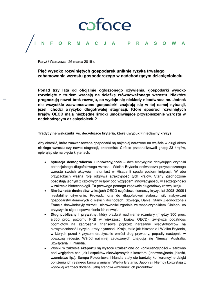 I N F O R M A C J A P R A S O W A Paryż / Warszawa, 26 marca 2015 r. Pięć wysoko rozwiniętych gospodarek uniknie ryzyka trwałego zahamowania wzrostu gospodarczego w nadchodzącym dziesięcioleciu Ponad trzy lata od oficjalnie ogłoszonego ożywienia, gospodarki wysoko rozwinięte z trudem wracają na ścieżkę zrównoważonego wzrostu. Niektóre prognozują nawet brak rozwoju, co wydaje się niekiedy nieodwracalne. Jednak nie wszystkie zaawansowane gospodarki znajdują się w tej samej sytuacji, jeżeli chodzi o ryzyko długotrwałej stagnacji. Które spośród rozwiniętych krajów OECD mają niezbędne środki umożliwiające przyspieszenie wzrostu w nadchodzącym dziesięcioleciu? Tradycyjne wskaźniki vs. decydujące kryteria, które uwypuklił niedawny kryzys Aby określić, które zaawansowane gospodarki są najmniej narażone na wejście w długi okres niskiego wzrostu czy nawet stagnacji, ekonomiści Coface przeanalizowali grupę 23 krajów, opierając się na pięciu kryteriach: Sytuacja demograficzna i innowacyjność – dwa tradycyjnie decydujące czynniki potencjalnego długofalowego wzrostu. Wielka Brytania doświadcza przyspieszonego wzrostu swoich aktywów, natomiast w Hiszpanii spada poziom imigracji. W obu przypadkach ważną rolę odgrywa atrakcyjność tych krajów. Stany Zjednoczone pozostają jednym z czołowych krajów pod względem innowacyjności, w szczególności w zakresie biotechnologii. Ta przewaga pomaga zapewnić długofalowy rozwój kraju. Nierówność dochodów w krajach OECD częściowo tłumaczy kryzys lat 2008–2009 i niestabilne ożywienie. Prowadzi ona do długofalowej słabości siły nabywczej gospodarstw domowych o niskich dochodach. Szwecja, Dania, Stany Zjednoczone i Francja doświadczyły wzrostu nierówności zgodnie ze współczynnikiem Giniego, co przyczyniło się do spowolnienia ich rozwoju. Dług publiczny i prywatny, który przybrał nadmierne rozmiary (między 300 proc. a 350 proc. poziomu PKB w większości krajów OECD), zwiększa podatność podmiotów na zagrożenia finansowe poprzez narażanie kredytobiorców na niewypłacalność i ryzyko utraty płynności. Kraje, takie jak Hiszpania i Wielka Brytania, w których przed kryzysem drastycznie wzrósł dług prywatny, popadły następnie w poważną recesję. Wśród najmniej zadłużonych znajdują się Niemcy, Australia, Szwajcaria i Finlandia. Wyniki w zakresie eksportu są wysoce uzależnione od konkurencyjności – zarówno pod względem cen, jak i aspektów niezwiązanych z kosztami (innowacyjność, jakość, wzornictwo itp.). Europa Południowa i Irlandia stały się bardziej konkurencyjne dzięki obniżeniu ich realnego kursu wymiany. Wielka Brytania, Japonia i Niemcy korzystają z wysokiej wartości dodanej, jaką stanowi wizerunek ich produktów. I N F O R M A C J A P R A S O W A 5 najbardziej stabilnych krajów: Niemcy, Korea Południowa, Szwajcaria, Belgia i Holandia Z przeprowadzonej analizy wynika, że pięć krajów OECD pozytywnie się wyróżnia. Słaby poziom Średni poziom Wysoki poziom źródło: Coface Legenda do tabeli: Górny wiersz: Sytuacja demograficzna, Innowacyjność, Nierówności, Zadłużenie, Handel Niemcy Wydatki na badania i rozwój, ponoszone głównie przez prywatne przedsiębiorstwa niemieckie, są powyżej średniego poziomu dla OECD. Systemy finansowania stanowią zachętę do wzrostu dla małych przedsiębiorstw. Dodatkowo obok stabilnego poziomu eksportu kraj korzysta z wysokiej konkurencyjności, z wyłączeniem kosztów. Korea Południowa Jako lider w branży elektroniki wysokiej jakości Korea Południowa osiąga znaczny wzrost produktywności, bazując na swoim silnym potencjale innowacyjności, w tym również wysokiej jakości systemu edukacji, wysokim poziomie wydatków publicznych na badania i rozwój oraz wysokiej liczbie złożonych wniosków patentowych. Pomimo spowolnienia w Chinach, I N F O R M A C J zaawansowana innowacyjna technologia gospodarczy w zakresie eksportu. A pozwala P R krajowi A S O wykorzystywać W A potencjał Szwajcaria Innowacyjność stanowi kluczowy priorytet dla Szwajcarii, która uzyskała silną pozycję w branży biotechnologii. Obowiązujący w kraju system finansowania ułatwia dostęp małych i średnich przedsiębiorstw do kredytów bankowych, a finansowanie badań i rozwoju pochodzi głównie z prywatnych źródeł. Kraj charakteryzuje również bardzo wysoka konkurencyjność pozakosztowa, a przedsiębiorstwa szwajcarskie korzystają z wizerunku marek z wyższej półki. Poziom szwajcarskiego eksportu w latach 2007-2013 wzrósł o 27 proc. Belgia Belgia to jeden z krajów o najniższym poziomie nierówności w OECD. Pod względem stopnia otwartości gospodarki kraj plasuje się w czołówce krajów OECD z wynikiem 82 proc. PKB. Dynamiczna sprzedaż eksportowa zapewnia krajowi dużą konkurencyjność. Holandia Holandia odnotowuje zrównoważone i względnie pozytywne wskaźniki. Chociaż łączne zadłużenie kraju jest dość wysokie (355 proc. PKB), poziom długu publicznego (78 proc.) umożliwiłby rządowi wsparcie sektora prywatnego w razie oczekiwanej zmiany tempa wzrostu. Szczególną przewagę kraju stanowi też działalność portowa – Rotterdam to największy port w Europie. Holandia odnotowuje również jeden z najwyższych w OECD wskaźników otwartości (83 proc. PKB). KONTAKT DLA MEDIÓW: Anna A. GUZIK – T. +48 22 465 02 22, M. +48 509 467 531 – E. [email protected] Informacje o Coface Grupa Coface, światowy lider w obszarze ubezpieczeń należności, oferuje firmom na całym świecie rozwiązania w zakresie ochrony przed ryzykiem niewypłacalności ich klientów, zarówno w transakcjach krajowych jak i eksportowych. W 2014 r. Grupa osiągnęła skonsolidowany obrót w wysokości 1,44 mld EUR. 4 406 pracowników zapewnia lokalną obsługę ponad 40 tys. klientów z ponad 200 krajów na całym świecie. Coface publikuje co kwartał swoje oceny ryzyka kraju dla 160 pańs