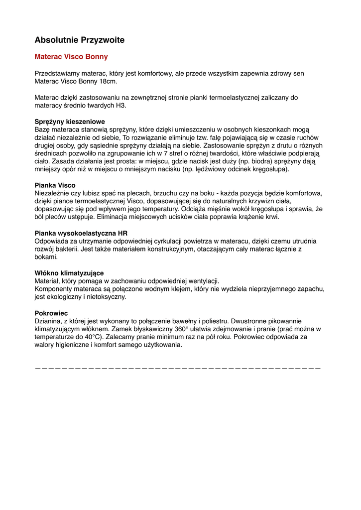 Absolutnie Przyzwoite Materac Visco Bonny Przedstawiamy materac, który jest komfortowy, ale przede wszystkim zapewnia zdrowy sen Materac Visco Bonny 18cm. Materac dzięki zastosowaniu na zewnętrznej stronie pianki termoelastycznej zaliczany do materacy średnio twardych H3. Sprężyny kieszeniowe Bazę materaca stanowią sprężyny, które dzięki umieszczeniu w osobnych kieszonkach mogą działać niezależnie od siebie, To rozwiązanie eliminuje tzw. falę pojawiającą się w czasie ruchów drugiej osoby, gdy sąsiednie sprężyny działają na siebie. Zastosowanie sprężyn z drutu o różnych średnicach pozwoliło na zgrupowanie ich w 7 stref o różnej twardości, które właściwie podpierają ciało. Zasada działania jest prosta: w miejscu, gdzie nacisk jest duży (np. biodra) sprężyny dają mniejszy opór niż w miejscu o mniejszym nacisku (np. lędźwiowy odcinek kręgosłupa). Pianka Visco Niezależnie czy lubisz spać na plecach, brzuchu czy na boku - każda pozycja będzie komfortowa, dzięki piance termoelastycznej Visco, dopasowującej się do naturalnych krzywizn ciała, dopasowując się pod wpływem jego temperatury. Odciąża mięśnie wokół kręgosłupa i sprawia, że ból pleców ustępuje. Eliminacja miejscowych ucisków ciała poprawia krążenie krwi. Pianka wysokoelastyczna HR Odpowiada za utrzymanie odpowiedniej cyrkulacji powietrza w materacu, dzięki czemu utrudnia rozwój bakterii. Jest także materiałem konstrukcyjnym, otaczającym cały materac łącznie z bokami. Włókno klimatyzujące Materiał, który pomaga w zachowaniu odpowiedniej wentylacji. Komponenty materaca są połączone wodnym klejem, który nie wydziela nieprzyjemnego zapachu, jest ekologiczny i nietoksyczny. Pokrowiec Dzianina, z której jest wykonany to połączenie bawełny i poliestru. Dwustronne pikowannie klimatyzującym włóknem. Zamek błyskawiczny 360° ułatwia zdejmowanie i pranie (prać można w temperaturze do 40°C). Zalecamy pranie minimum raz na pół roku. Pokrowiec odpowiada za walory higieniczne i komfort samego użytkowania. ———————————————————————————————————————————
