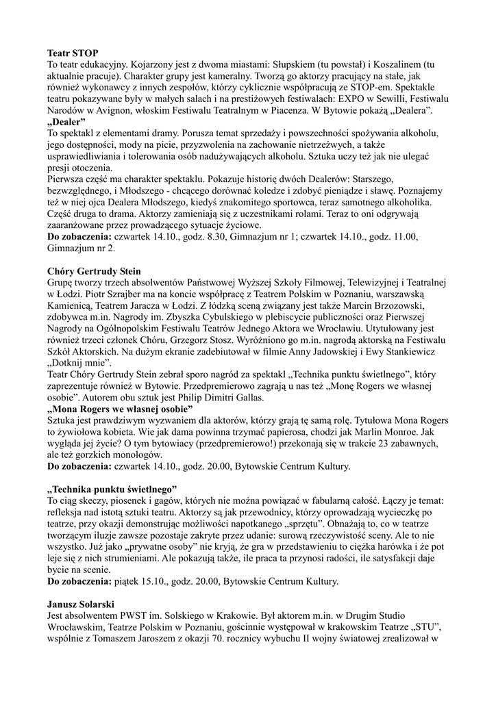 Teatr STOP To teatr edukacyjny. Kojarzony jest z dwoma miastami: Słupskiem (tu powstał) i Koszalinem (tu aktualnie pracuje). Charakter grupy jest kameralny. Tworzą go aktorzy pracujący na stałe, jak równieŜ wykonawcy z innych zespołów, którzy cyklicznie współpracują ze STOP-em. Spektakle teatru pokazywane były w małych salach i na prestiŜowych festiwalach: EXPO w Sewilli, Festiwalu Narodów w Avignon, włoskim Festiwalu Teatralnym w Piacenza. W Bytowie pokaŜą „Dealera”. „Dealer” To spektakl z elementami dramy. Porusza temat sprzedaŜy i powszechności spoŜywania alkoholu, jego dostępności, mody na picie, przyzwolenia na zachowanie nietrzeźwych, a takŜe usprawiedliwiania i tolerowania osób naduŜywających alkoholu. Sztuka uczy teŜ jak nie ulegać presji otoczenia. Pierwsza część ma charakter spektaklu. Pokazuje historię dwóch Dealerów: Starszego, bezwzględnego, i Młodszego - chcącego dorównać koledze i zdobyć pieniądze i sławę. Poznajemy teŜ w niej ojca Dealera Młodszego, kiedyś znakomitego sportowca, teraz samotnego alkoholika. Część druga to drama. Aktorzy zamieniają się z uczestnikami rolami. Teraz to oni odgrywają zaaranŜowane przez prowadzącego sytuacje Ŝyciowe. Do zobaczenia: czwartek 14.10., godz. 8.30, Gimnazjum nr 1; czwartek 14.10., godz. 11.00, Gimnazjum nr 2. Chóry Gertrudy Stein Grupę tworzy trzech absolwentów Państwowej WyŜszej Szkoły Filmowej, Telewizyjnej i Teatralnej w Łodzi. Piotr Szrajber ma na koncie współpracę z Teatrem Polskim w Poznaniu, warszawską Kamienicą, Teatrem Jaracza w Łodzi. Z łódzką sceną związany jest takŜe Marcin Brzozowski, zdobywca m.in. Nagrody im. Zbyszka Cybulskiego w plebiscycie publiczności oraz Pierwszej Nagrody na Ogólnopolskim Festiwalu Teatrów Jednego Aktora we Wrocławiu. Utytułowany jest równieŜ trzeci członek Chóru, Grzegorz Stosz. WyróŜniono go m.in. nagrodą aktorską na Festiwalu Szkół Aktorskich. Na duŜym ekranie zadebiutował w filmie Anny Jadowskiej i Ewy Stankiewicz „Dotknij mnie”. Teatr Chóry Gertrudy Stein zebrał sporo nagród za spektakl „Technika punktu świetlnego”, który zaprezentuje równieŜ w Bytowie. Przedpremierowo zagrają u nas teŜ „Monę Rogers we własnej osobie”. Autorem obu sztuk jest Philip Dimitri Gallas. „Mona Rogers we własnej osobie” Sztuka jest prawdziwym wyzwaniem dla aktorów, którzy grają tę samą rolę. Tytułowa Mona Rogers to Ŝywiołowa kobieta. Wie jak dama powinna trzymać papierosa, chodzi jak Marlin Monroe. Jak wygląda jej Ŝycie? O tym bytowiacy (przedpremierowo!) przekonają się w trakcie 23 zabawnych, ale teŜ gorzkich monologów. Do zobaczenia: czwartek 14.10., godz. 20.00, Bytowskie Centrum Kultury. „Technika punktu świetlnego” To ciąg skeczy, piosenek i gagów, których nie moŜna powiązać w fabularną całość. Łączy je temat: refleksja nad istotą sztuki teatru. Aktorzy są jak przewodnicy, którzy oprowadzają wycieczkę po teatrze, przy okazji demonstrując moŜliwości napotkanego „sprzętu”. ObnaŜają to, co w teatrze tworzącym iluzje zawsze pozostaje zakryte przez udanie: surową rzeczywistość sceny. Ale to nie wszystko. JuŜ jako „prywatne osoby” nie kryją, Ŝe gra w przedstawieniu to cięŜka harówka i Ŝe pot leje się z nich strumieniami. Ale pokazują takŜe, ile praca ta przynosi radości, ile satysfakcji daje bycie na scenie. Do zobaczenia: piątek 15.10., godz. 20.00, Bytowskie Centrum Kultury. Janusz Solarski Jest absolwentem PWST im. Solskiego w Krakowie. Był aktorem m.in. w Drugim Studio Wrocławskim, Teatrze Polskim w Poznaniu, gościnnie występował w krakowskim Teatrze „STU”, wspólnie z Tomaszem Jaroszem z okazji 70. rocznicy wybuchu II wojny światowej zrealizował w Jarocinie widowisko multimedialne pt. „Głosy”. Na Bytoffsky zagra dwukrotnie. „Zemsta czerwonych bucików” Bohaterem monodramu jest Dymitriątko/Dymitr, kiedyś cudowne dziecko, teraz mający problemy z osobowością. Miesza mu się dorosłość z dzieciństwem, dręczy dawna sława. Jest ekspresyjnie, duŜo tu autoironii, rozpaczy. Jest teŜ piosenka o tytułowych czerwonych bucikach, której juŜ nie moŜe zaśpiewać... Do zobaczenia: czwartek 14.10., godz. 17.30, Bytowskie Centrum Kultury. „Kod” To sztuka na aktora i muzykę. Ta pochodzi z płyty „Kod. Zbigniew ŁowŜył Project. Symfonia Ogrodów, cz. I”. Solarski wykorzystuje elementy tańca butoh, który bardziej przypomina dawny rytuał. Aktor wije się po podłodze, zastyga, opada i wznosi. DuŜo tu estetyki brzydoty, ale teŜ teatru ubogiego, koncepcji, której twórcą był Jerzy Grotowski. Do zobaczenia: piątek 15.10., godz. 16.00, Bytowskie Centrum Kultury. John Chike Enemuo i zespół Aka-Chukwu Aka Chukwu to nigeryjska grupa muzyczna. Łączy grę na afrykańskich instrumentach perkusyjnych z opowiadaniem i pokazem tradycyjnych masek i strojów. ZałoŜycielem zespołu jest John Chike Enemuo. Od pięciu lat mieszka w Polsce, a od 2006 r. prowadzi warsztaty bębniarskie i taneczne dla dzieci i młodzieŜy. W ramach Bytoffsky Festival wezmą w nich udział uczniowie Zespołu Szkół Ekonomiczno-Rolniczych (czwartek - sobota). RównieŜ wszyscy chętni będą mogli wysłuchać artystów na koncercie. Do zobaczenia: piątek 15.10., godz. 21.30, klub „Jaś Kowalski”. Teatr Wiczy Działa od 11.11.1991 r. Data jest nieprzypadkowa. Przyczyna zawia zania grupy było przygotowanie widowiska upamie tniaja cego odzyskanie przez Polske niepodległości. To jedna z najbardziej cenionych grup alternatywnych w Polsce. Skupia skupia nie tylko ludzi teatru, ale takŜe poetów, młodych dramaturgów, muzyków, cyrkowców, działaczy społecznych. Istotnym działaniem teatru jest prezentacja spektakli w miejscach z utrudnionym dostępem do kultury. Na warsztatach spotkają się z nimi uczniowie bytowskich gimnazjów (czwartek - sobota). Aktorzy z Torunia zagrają równieŜ dla bytowiaków sztuk