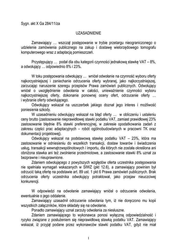 Sygn. akt X Ga 284/11/za UZASADNIENIE Zamawiający … wszczął postępowanie w trybie przetargu nieograniczonego o udzielenie zamówienia publicznego na zakup i dostawę wielorzędowego tomografu komputerowego wraz z adaptacją pomieszczeń. Przystępujący … podał dla obu kategorii czynności jednakową stawkę VAT – 8%, a odwołujący … odpowiednio 8% i 23%. W toku postępowania odwołujący … wniósł odwołanie na czynność wyboru oferty najkorzystniejszej i zaniechanie odrzucenia oferty wybranej, jako najkorzystniejszej, zarzucając naruszenie szeregu przepisów Prawa zamówień publicznych. Odwołujący wniósł o uwzględnienie odwołania w całości, unieważnienie czynności wyboru najkorzystniejszej oferty, dokonanie ponownej oceny ofert, odrzucenie oferty … i wybranie oferty odwołującego. Odwołujący wskazał na uszczerbek jakiego doznał jego interes i możliwość poniesienia szkody. W uzasadnieniu odwołujący wskazał na błąd oferty … w obliczeniu i ustaleniu ceny brutto (zastosowanie nieprawidłowej stawki podatku VAT, zamiast prawidłowej 23% zastosowanie błędnie 8% stawki preferencyjnej, w zakresie opodatkowania zadań z zakresu części prac adaptacyjnych – robót ogólnobudowlanych w pracowni TK oraz dokumentacji projektowej). Odwołujący wskazał na podstawową stawkę podatku VAT – 23%, która ma zastosowanie w odniesieniu do wszelkich transakcji, dostaw towarów i świadczenia usług, transakcji wewnątrzwspólnotowych i importu, dla których nie została określona ani obniżona stawka ani też zwolnienie przedmiotowe, a zastosowanie stawki 8% uznał za bezprawne i nieuprawnione. Zdaniem odwołującego z powyższych względów oferta uczestnika postępowania nie spełniała wymagań wskazanych w SIWZ (pkt 12.6), a zamawiający powinien był odrzucić taką ofertę na podstawie art. 89 ust. 1 pkt 6 Prawa zamówień publicznych. Brak odrzucenia oferty uczestnika odwołujący potraktował, jako przejaw nieuczciwej konkurencji. W odpowiedzi na odwołanie zamawiający wniósł o odrzucenie odwołania, ewentualnie o jego oddalenie. Zamawiający uzasadnił odrzucenie odwołania tym, iż nie doręczono mu kopii wszystkich załączników, które składały się na odwołanie. Ponadto zamawiający uznał zarzuty odwołania za niesłuszne. Zdaniem zamawiającego to wykonawca ponosi wyłączną odpowiedzialność i ryzyko związane z posłużeniem się nieprawidłową stawką podatku VAT. Zamawiający wskazał, iż przyjął podane przez wykonawców stawki podatku VAT, gdyż nie miał 1 podstaw ani możliwości ich kwestionowania i nie wskazał w SIWZ na wysokość stawek, które należy przyjmować do poszczególnych pozycji formularza asortymentowocenowego. Zamawiający uznał także, że odwołujący nie udowodnił interesu prawnego w złożeniu odwołania, ponieważ jedynie wykonawca, którego ofertę uznano za najkorzystniejszą złożył jedyną ofertę nieprzekraczającą wysokości kwoty, którą zamierzał przeznaczyć na udzielenie zamówienia. Przystępujący … zgłosił swoje przystąpienie do postępowania toczącego się w wyniku wniesienia odwołania i wskazał na swój interes w rozstrzygnięciu odwołania na korzyść zamawiającego, gdyż jest wykonawcą, którego oferta w przedmiotowym postępowaniu została wybrana, jako najkorzystniejsza, a żądania odwołującego zmierzały do odebrania przystępującemu możliwości zawarcia umowy w przedmiotowym postępowaniu. Zaskarżonym wyrokiem Krajowa Izba Odwoławcza (KIO) oddaliła odwołanie. KIO uznała, iż odwołującemu przysługiwało prawo do wniesienia odwołania, bowiem miał interes w uzyskaniu danego zamówienia i mógł ponieść szkodę w wyniku ewentualnego naruszenia przez zamawiającego Prawa zamówień publicznych w przypadku potwierdzenia podniesionych zarzutów, w wyniku czego zostałaby dokonana powtórna ocena ofert, a oferta przystępującego zostałaby odrzucona. Wówczas odwołujący miałby realną szansę na uzyskanie zamówienia, jako że jego cena była na drugim miejscu w rankingu ofert. KIO stwierdziła brak naruszenia przepisów Prawa zamówień publicznych w związku z podaniem jednolitej stawki VAT dla świadczenia. KIO uznała, iż nie mogła weryfikować prawidłowości stawek podatku VAT. KIO nie stwierdziła błędu w obliczeniu ceny, ani czynu nieuczciwej konkurencji. Zdaniem KIO zastosowanie ewentualnie nieprawidłowej stawki podatku VAT nie spowodowało zmiany rankingu ofert, nie miało wpływu na konkurencję. W reakcji na wyrok KIO odwołujący złożył skargę, w której zaskarżył w całości wyrok KIO i zarzucił mu naruszenie art. 192 ust. 2 Prawa zamówień publicznych poprzez jego niezastosowanie; art. 190 ust. 7 Prawa zamówień publicznych poprzez zaniechanie dokonania przez KIO prawidłowej oceny całości materiału dowodowego i oparcie rozstrzygnięcia jedynie na podstawie symulacji przedstawionej przez zamawiającego; art. 196 ust. 4 Prawa zamówień publicznych poprzez zaniechanie dokonania przez KIO w uzasadnieniu wyroku samodzielnej oceny stanu faktycznego przy uwzględnieniu różnych stawek podatku VAT, a tym samym poprzez nieprzedstawienie przez KIO jakiejkolwiek argumentacji uzasadniającej rozstrzygnięcie i oparcie się jedynie na symulacji przedstawionej przez zamawiającego. Odwołujący wniósł o zmianę zaskarżonego wyroku w całości i uwzględnienie odwołania. 2 W uzasadnieniu skarżący wskazał, iż oferty w toku przetargu powinny zawierać oddzielne stawki VAT na świadczenia związane z dostawą tomografu oraz na roboty budowlane. Natomiast oferta przystępującego takiego rozróżnienia nie zawierała. Zdaniem skarżącego konsekwencją wskazanej konstrukcji oferty przystępującego była znaczna różnica w cenie na korzyść przystępującego co przesądziło o wyborze oferty, a tym samym o wyniku przetargu. Skarżący podkreślił, iż przystępujący nie był uprawniony do zastosowania preferencyjnej